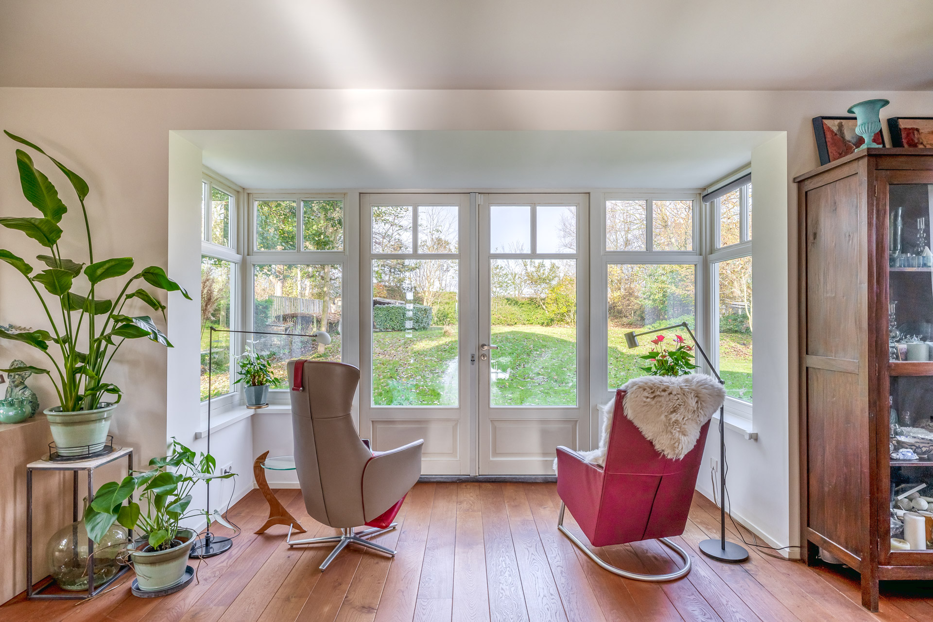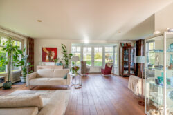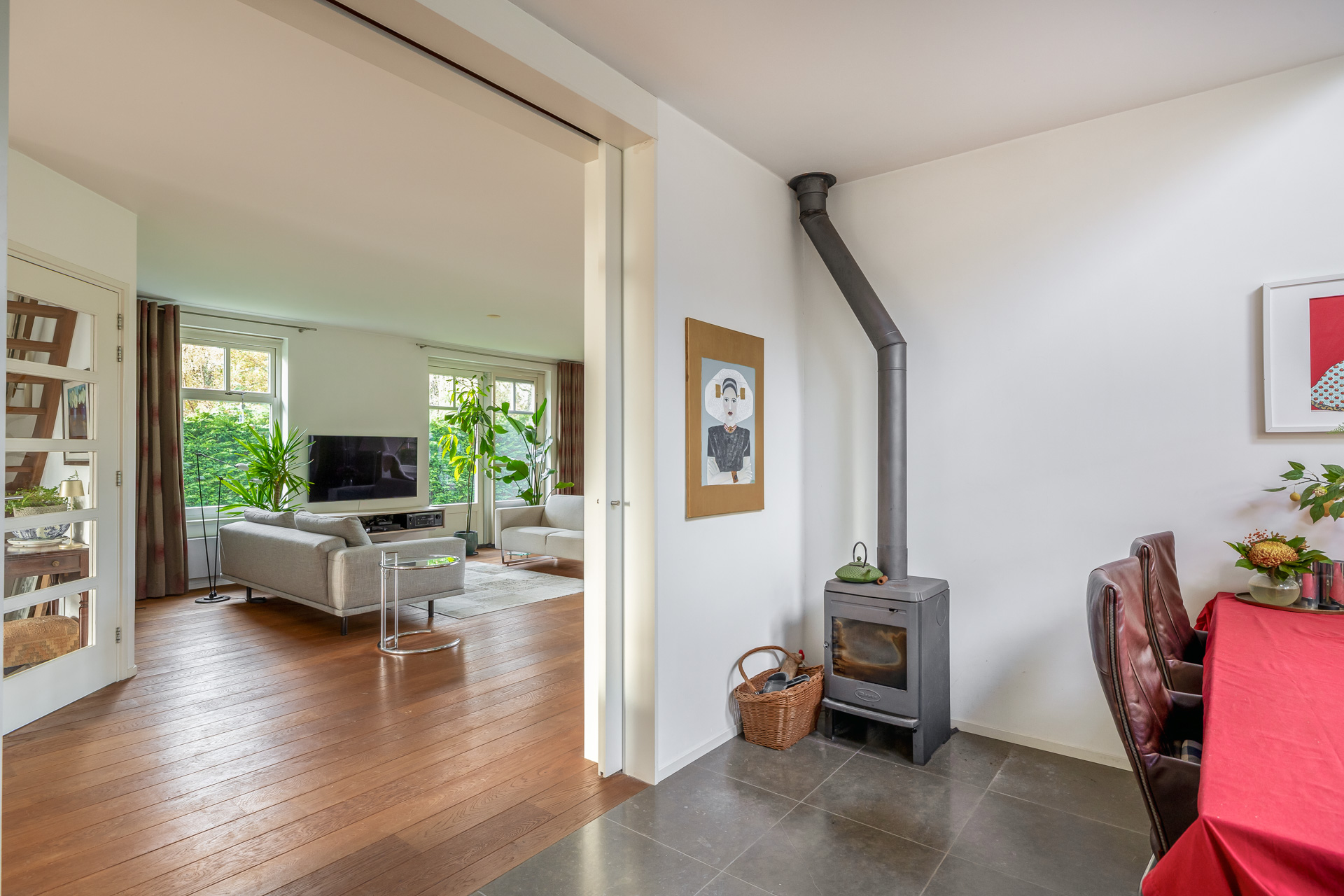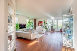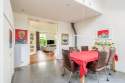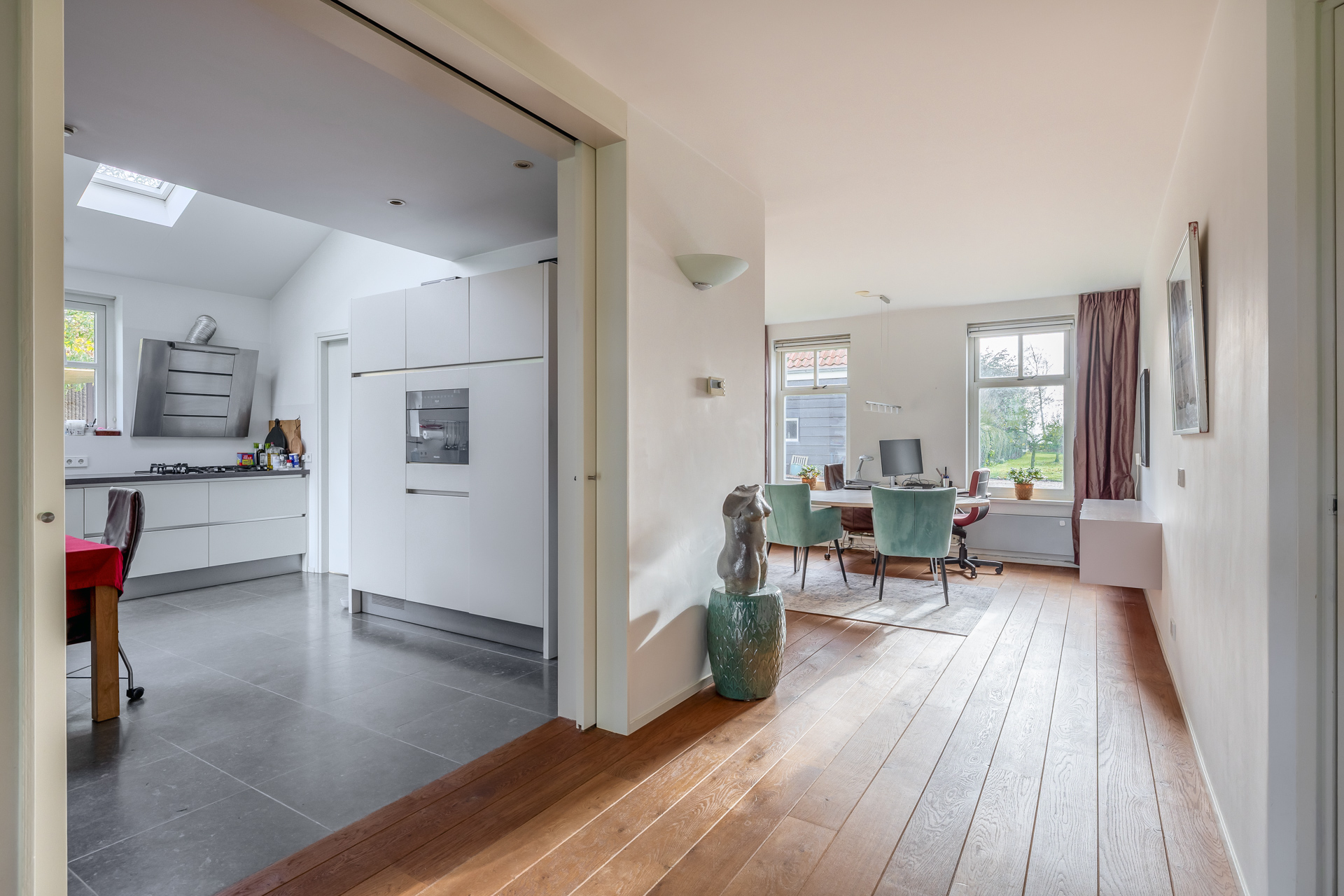 Via de entreehal met toilet en trapopgang bereikt u de woon en eetkamer. De royale woonkamer is aan de achterzijde gesitueerd en voorzien van een houten vloer en grote raampartijen die zorgen voor een prachtige lichtinval. Openslaande deuren aan de achterzijde en zijkant geven direct toegang tot de ruime tuin. Aansluitend bevindt zich een tweede ruimte, momenteel in gebruik als kantoor, maar uitstekend geschikt als eetkamer, speelkamer of hobbyruimte.