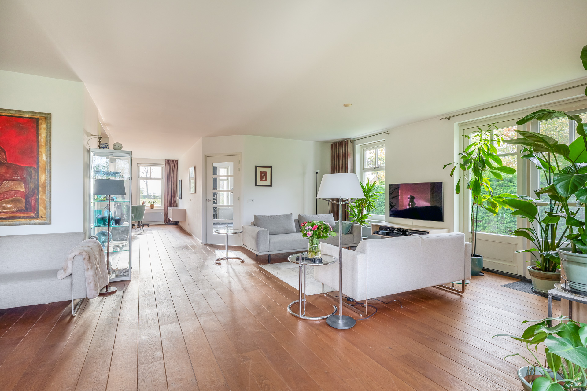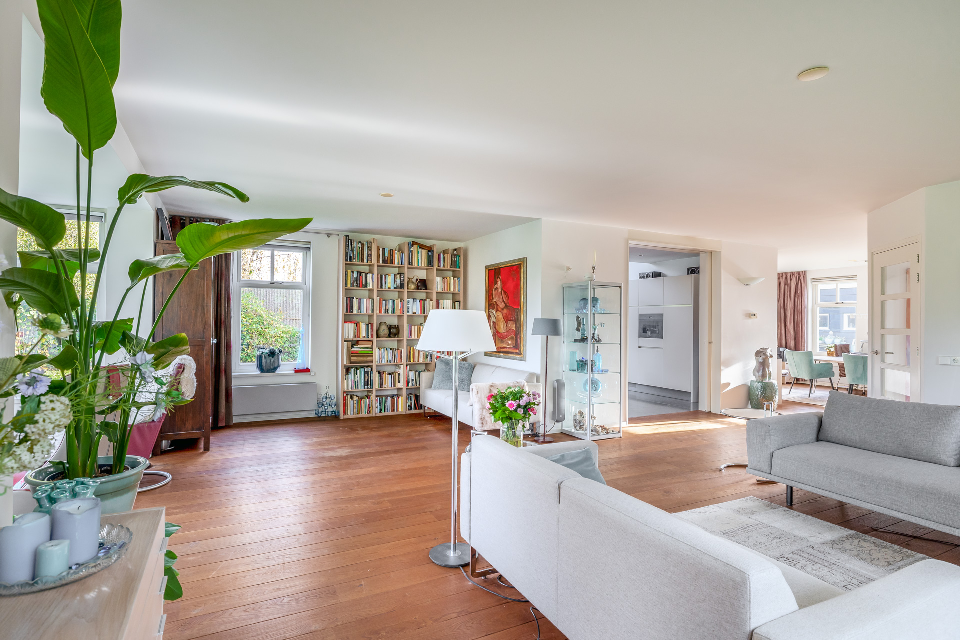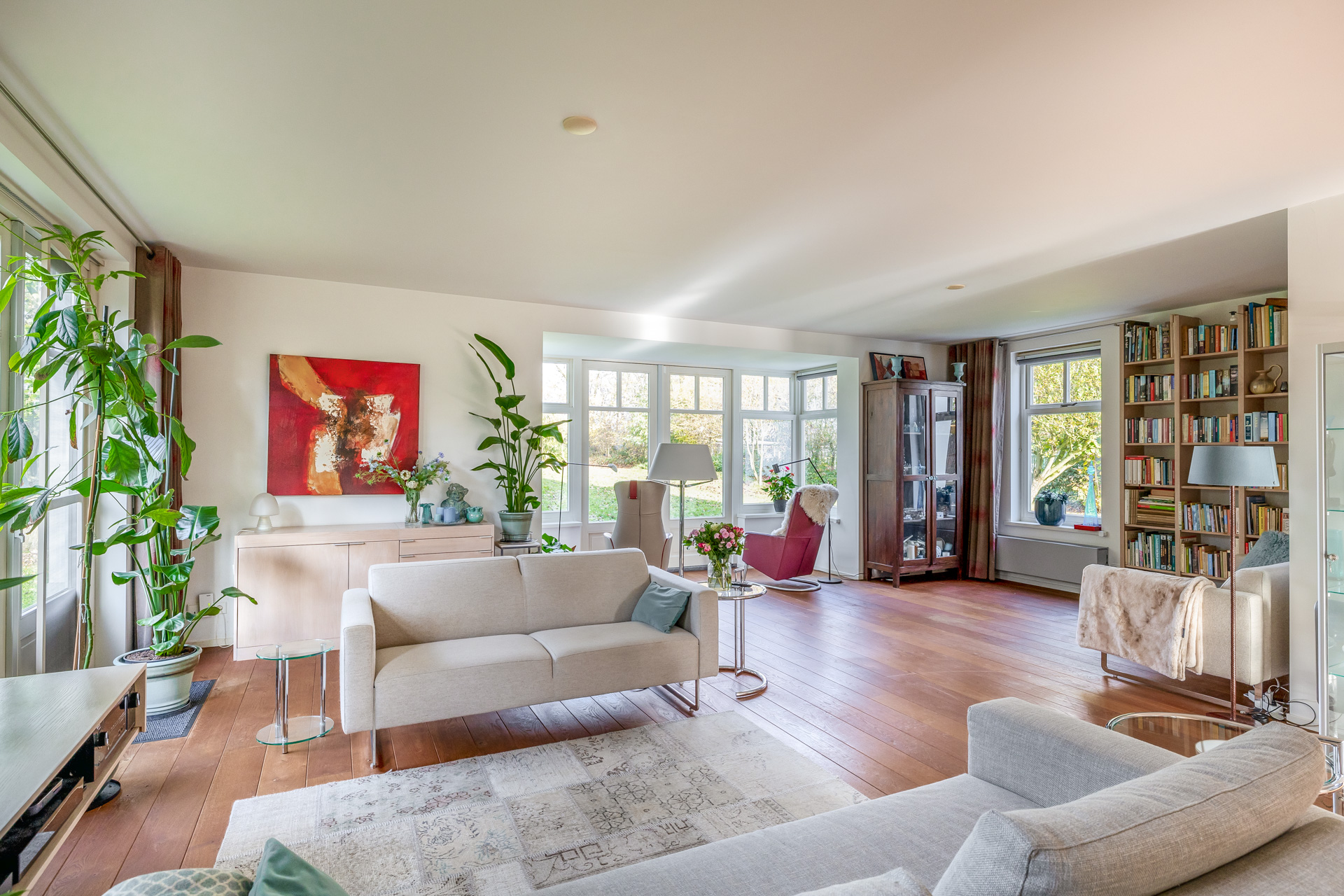 Via de entreehal met toilet en trapopgang bereikt u de woon en eetkamer. De royale woonkamer is aan de achterzijde gesitueerd en voorzien van een houten vloer en grote raampartijen die zorgen voor een prachtige lichtinval. Openslaande deuren aan de achterzijde en zijkant geven direct toegang tot de ruime tuin. Aansluitend bevindt zich een tweede ruimte, momenteel in gebruik als kantoor, maar uitstekend geschikt als eetkamer, speelkamer of hobbyruimte.