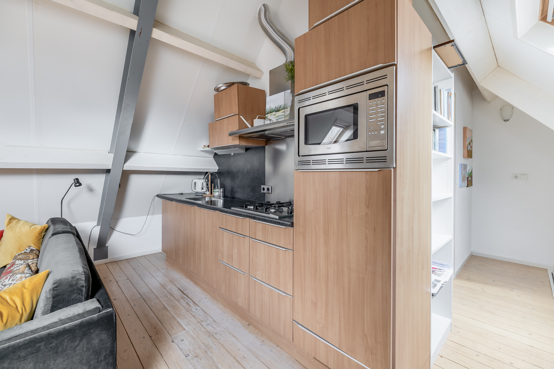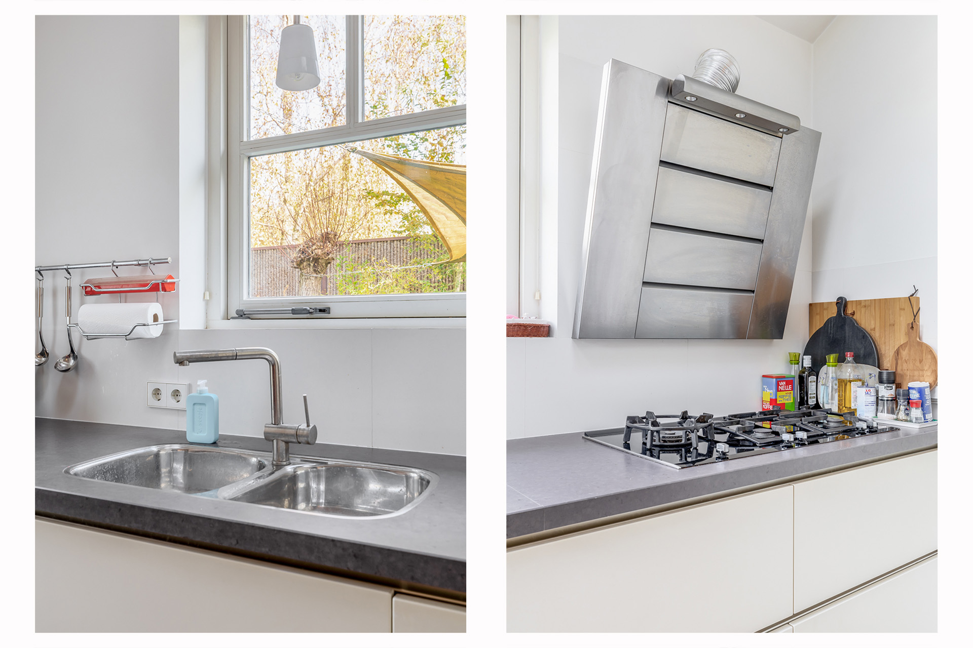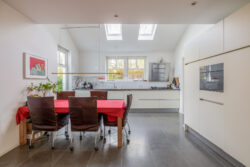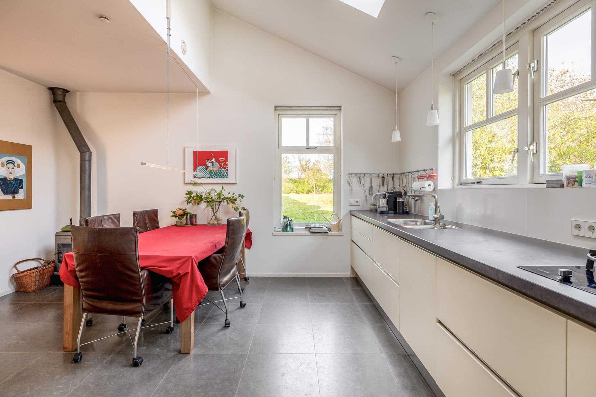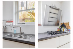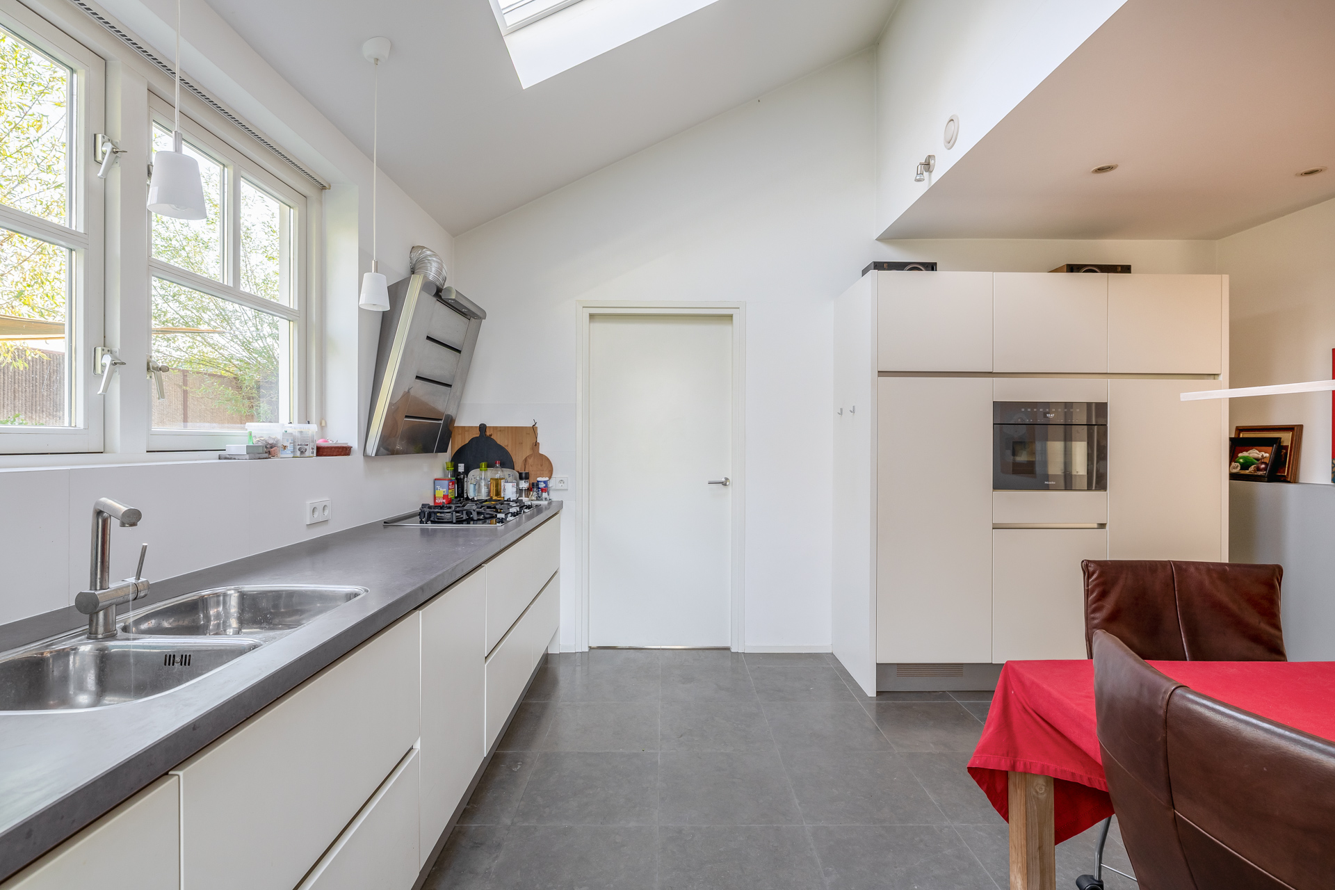De moderne keuken beschikt over veel bergruimte en diverse inbouwapparatuur. Twee dakvensters zorgen voor extra daglicht. Vanuit de keuken is de bijkeuken bereikbaar met witgoedaansluitingen en een directe doorgang naar de tuin.