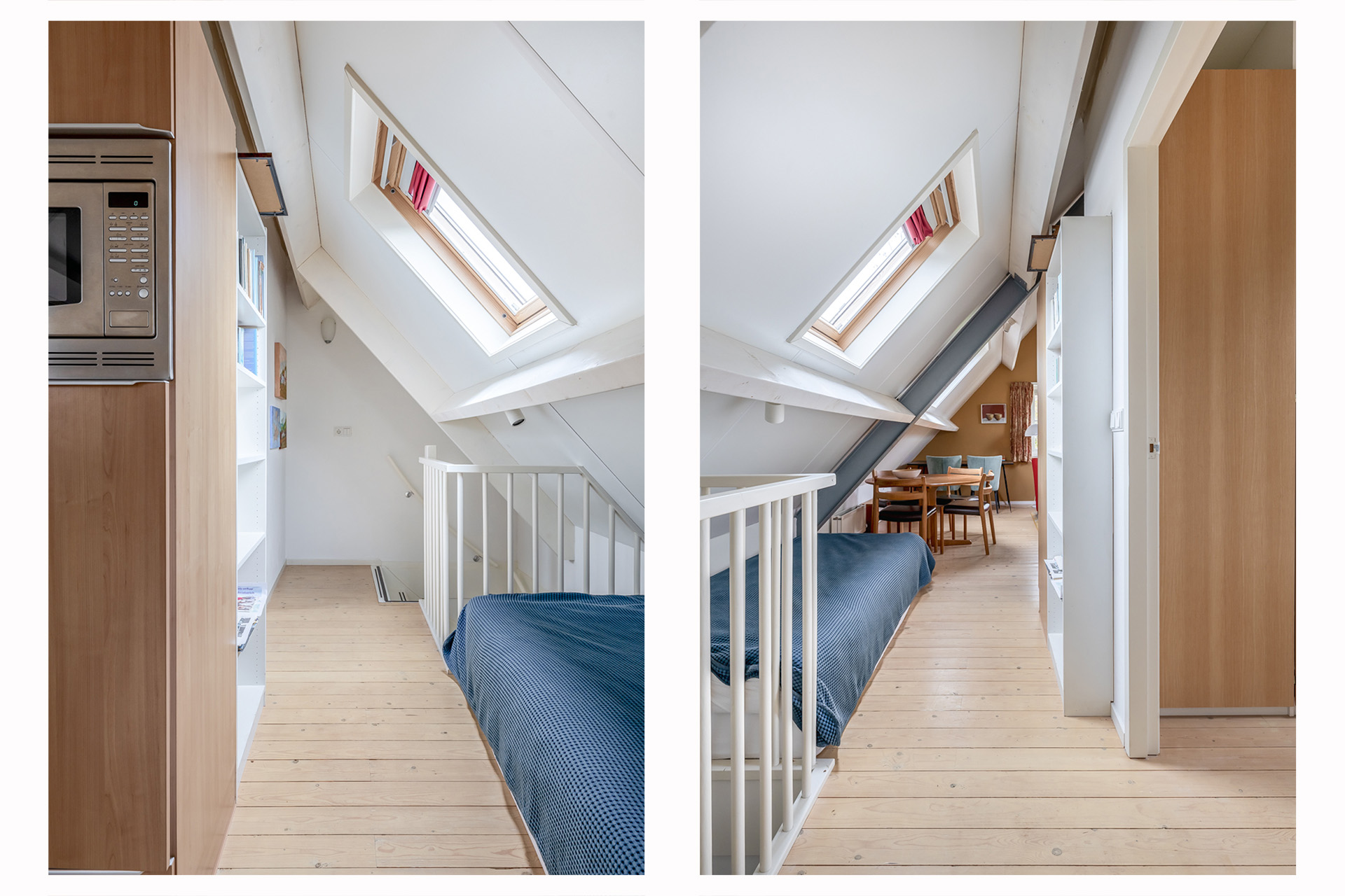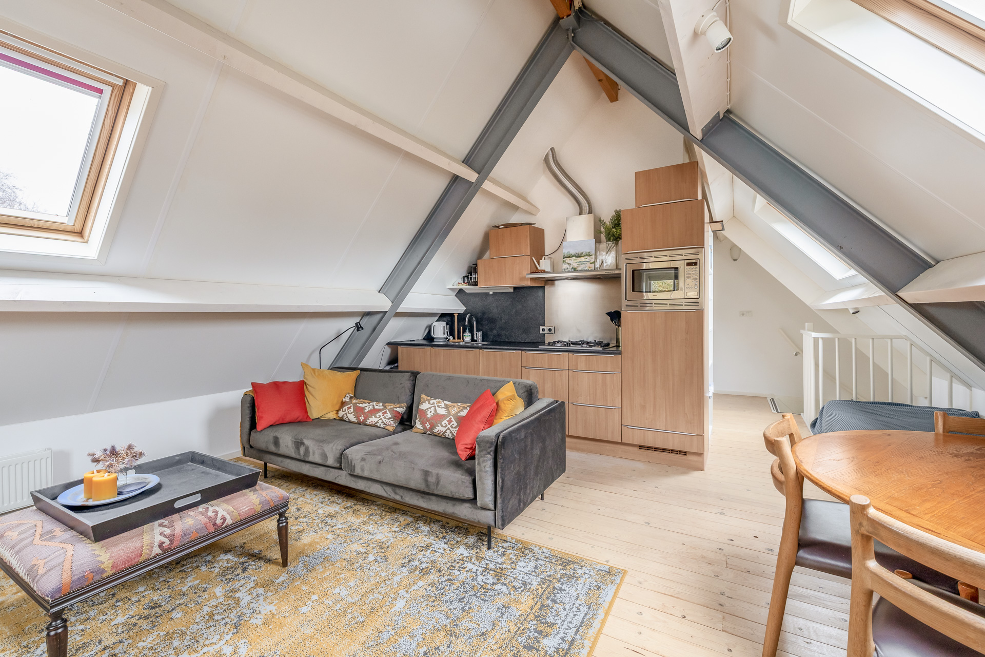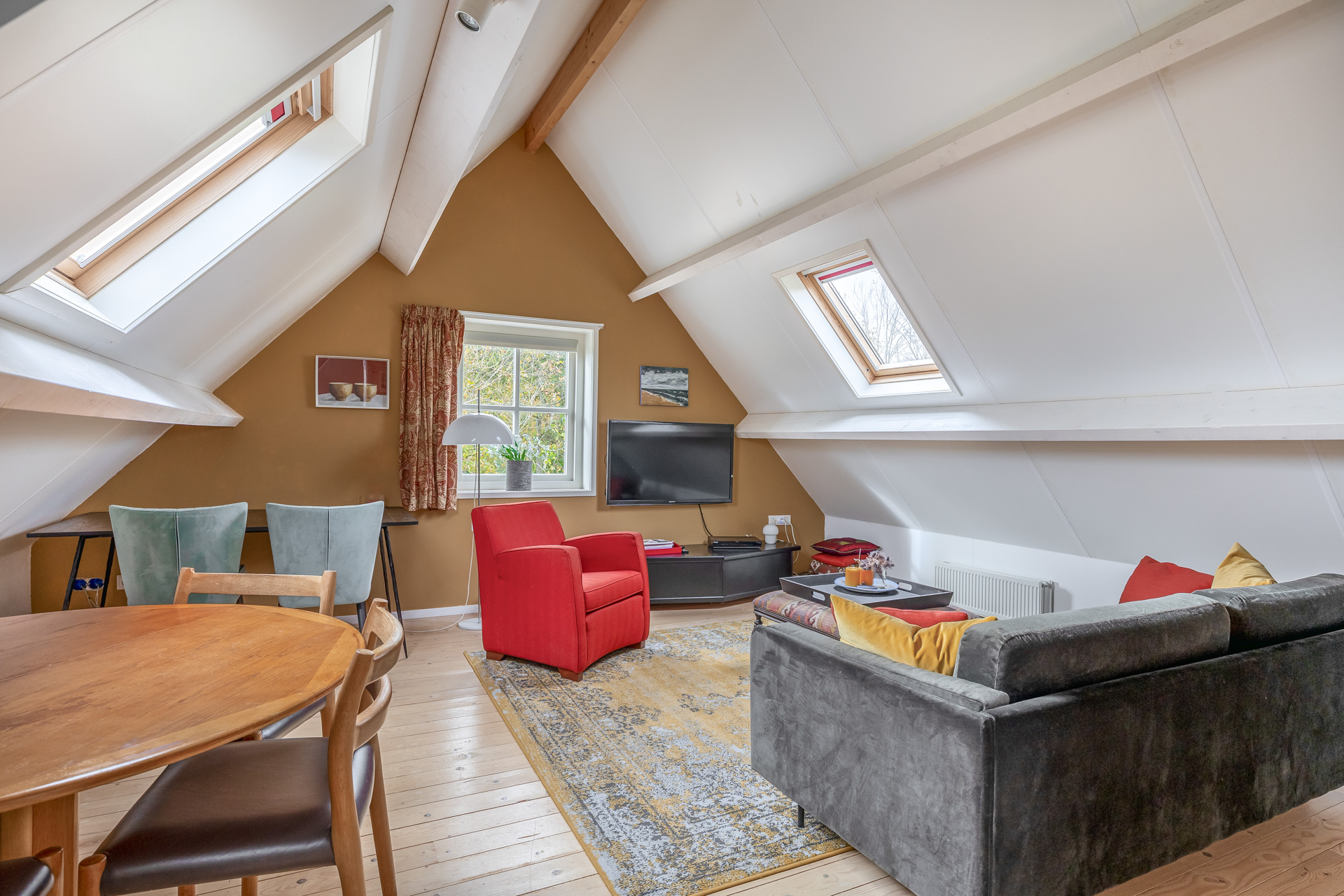 De verdieping bestaat uit een gezellige woon-/eetkamer met houten vloer en dakramen, een keuken met apparatuur en een slaapkamer met dakraam. Deze ruimte is perfect geschikt als gastenverblijf of kantoor aan huis.