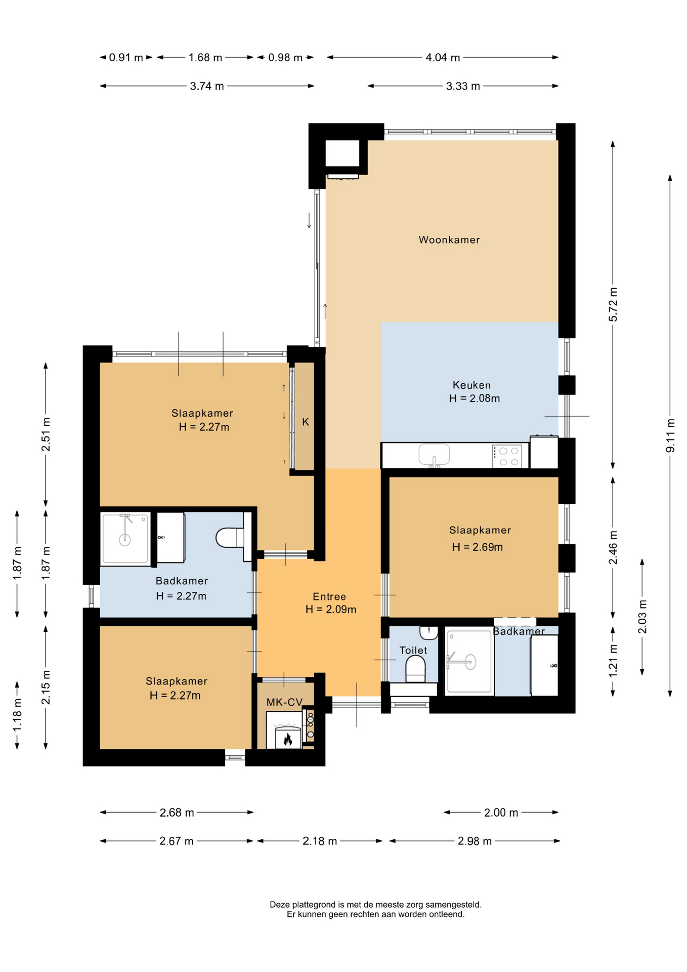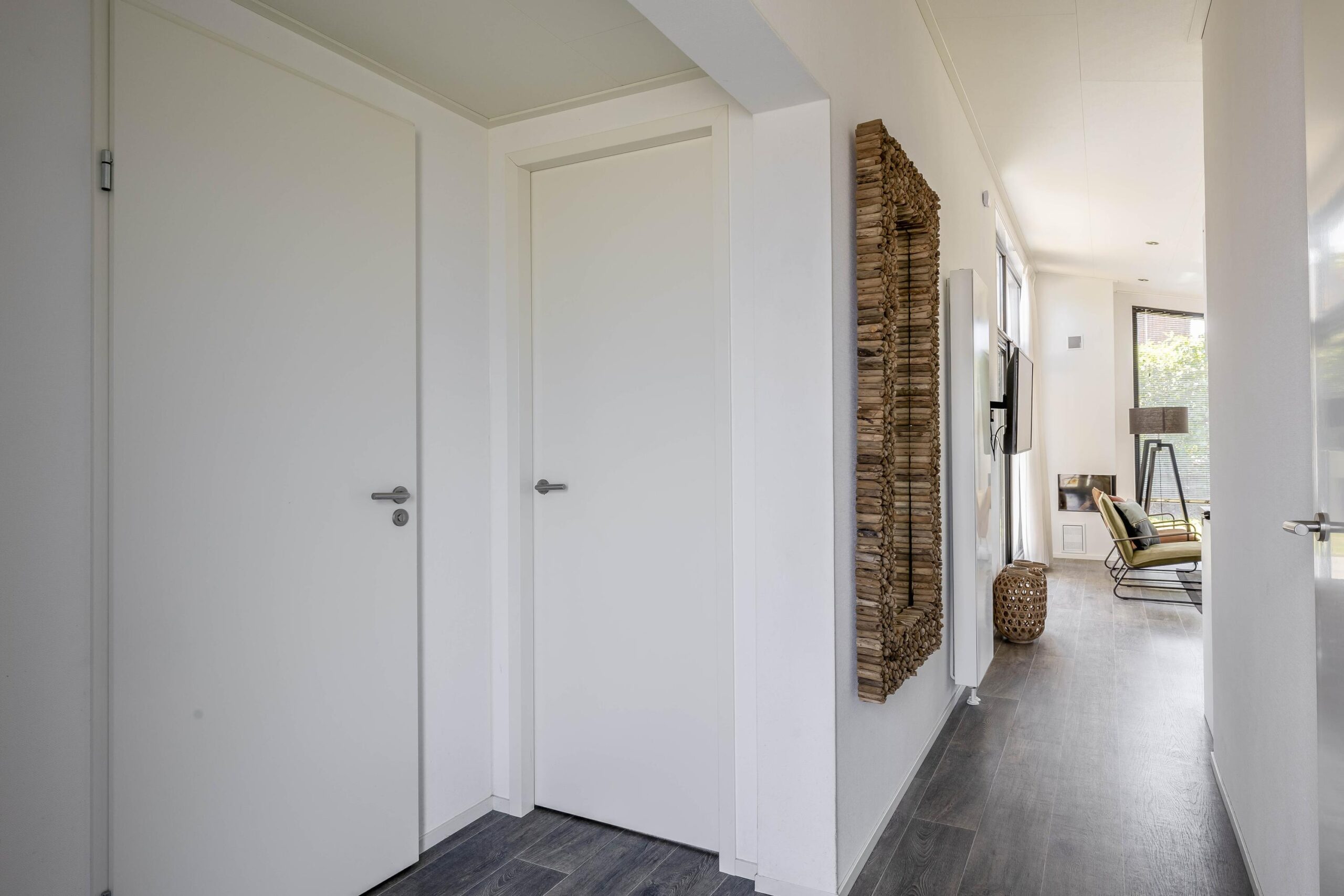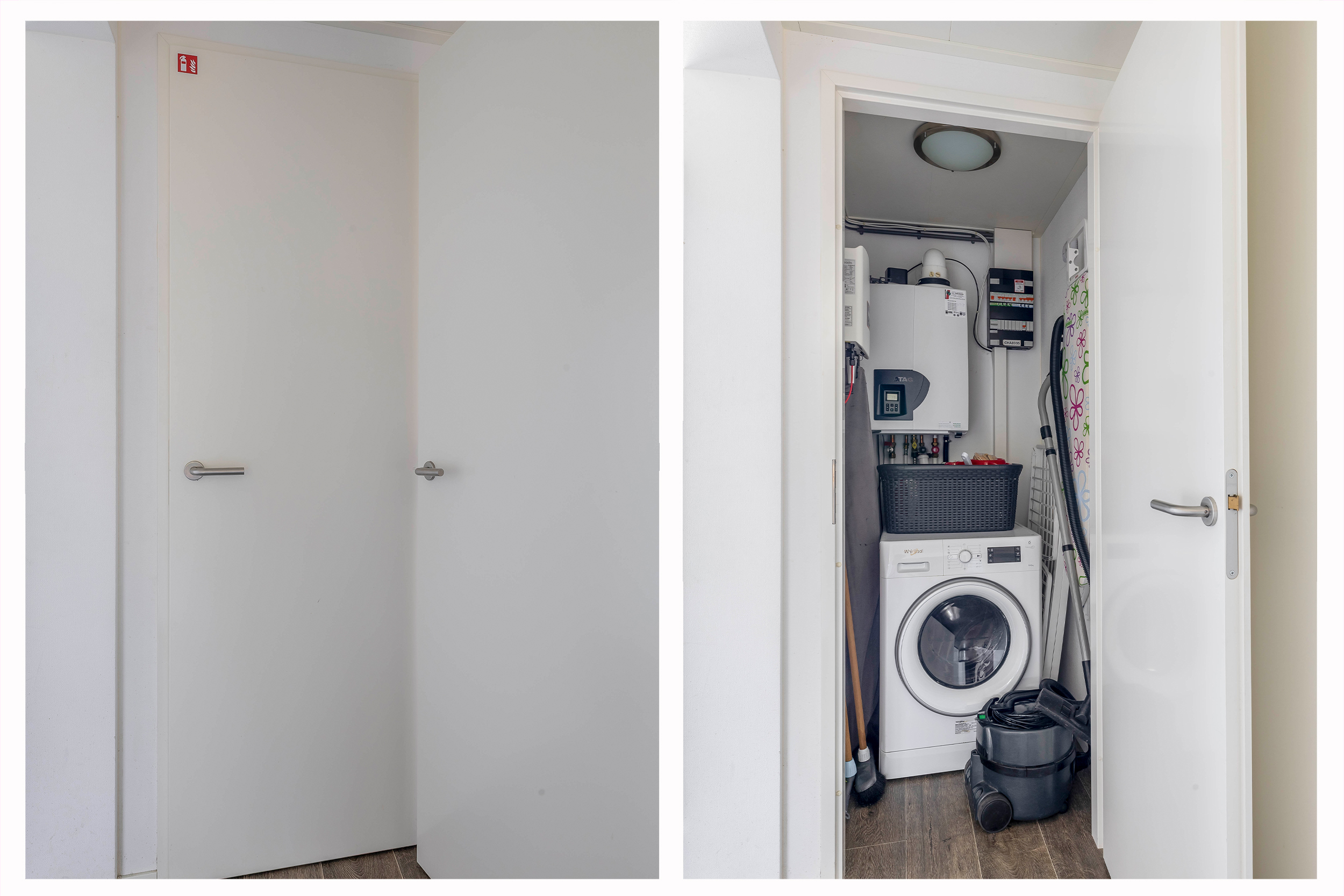 De entreehal, met meterkast en toilet, geeft toegang tot nagenoeg alle vertrekken. De woonkamer met open keuken is gelegen aan de achterzijde en beschikt over grote raampartijen. De open keuken is compleet ingericht met diverse apparatuur zoals kookplaat, afzuigkap, combimagnetron, koel-vriescombinatie en vaatwasser. De drie slaapkamers zijn licht en de slaapkamer aan de voorzijde beschikt over een eigen badkamer met wastafel en douche. De tweede badkamer is volledig betegeld en compleet met douche, wastafel en toilet.