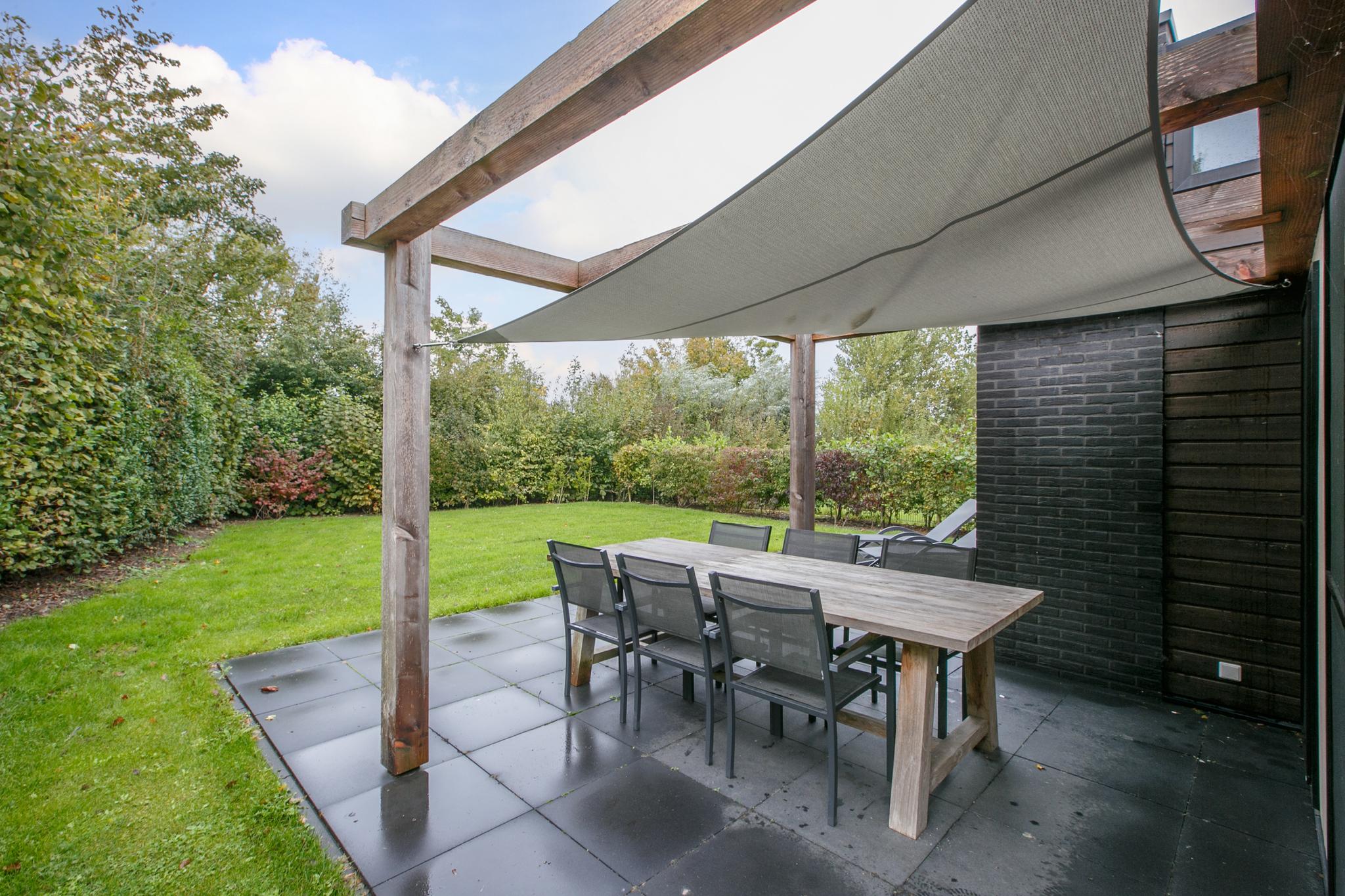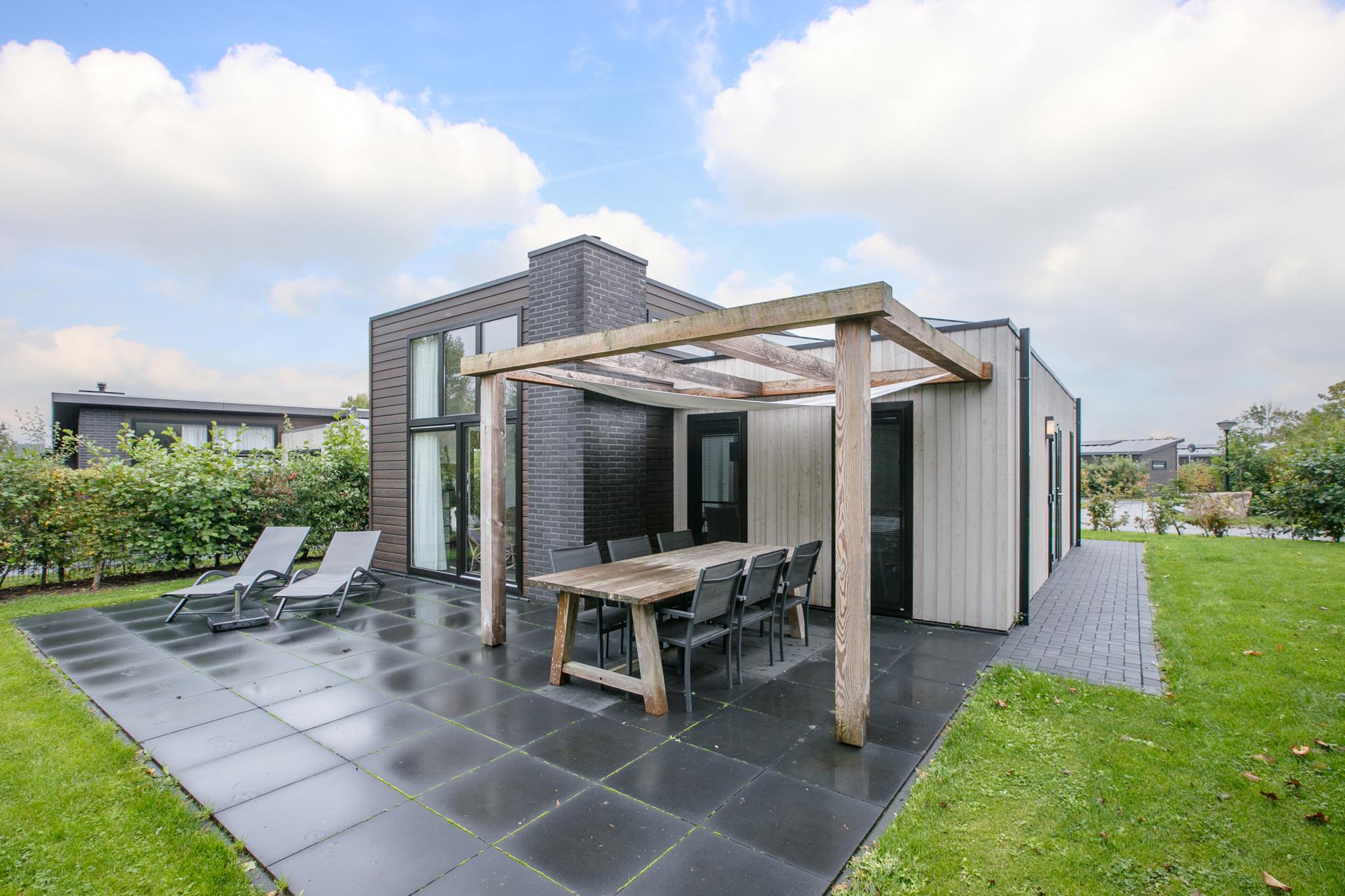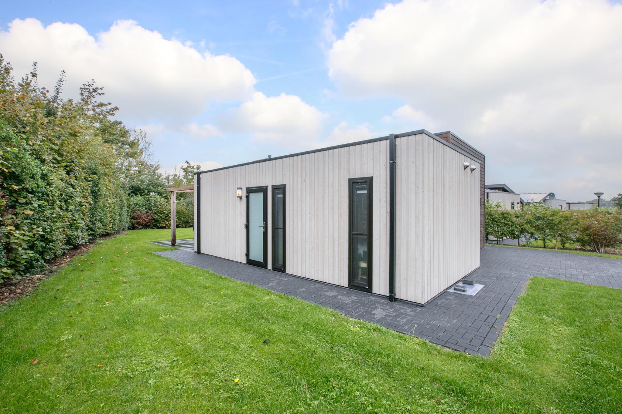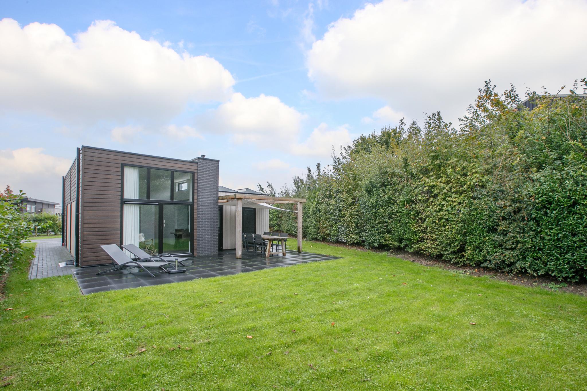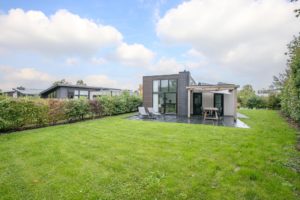 De ruime tuin, rondom de recreatiebungalow gelegen, is voorzien van gazon en een terras met pergola en schaduwdoek. U kunt hier fijn genieten van de rust en ruimte. Voor de recreatiebungalow is parkeergelegenheid om twee auto’s te parkeren.