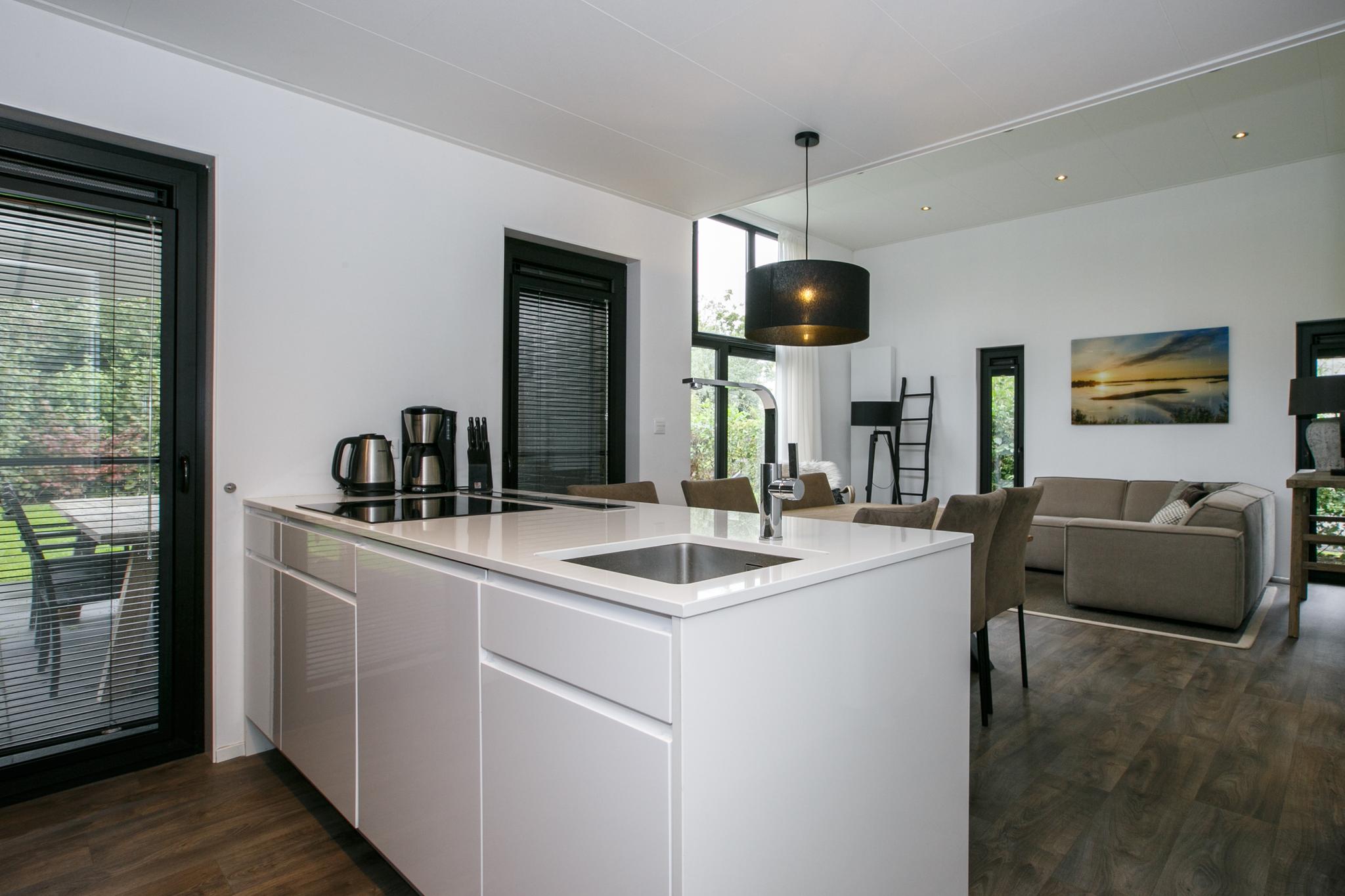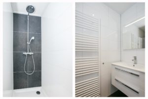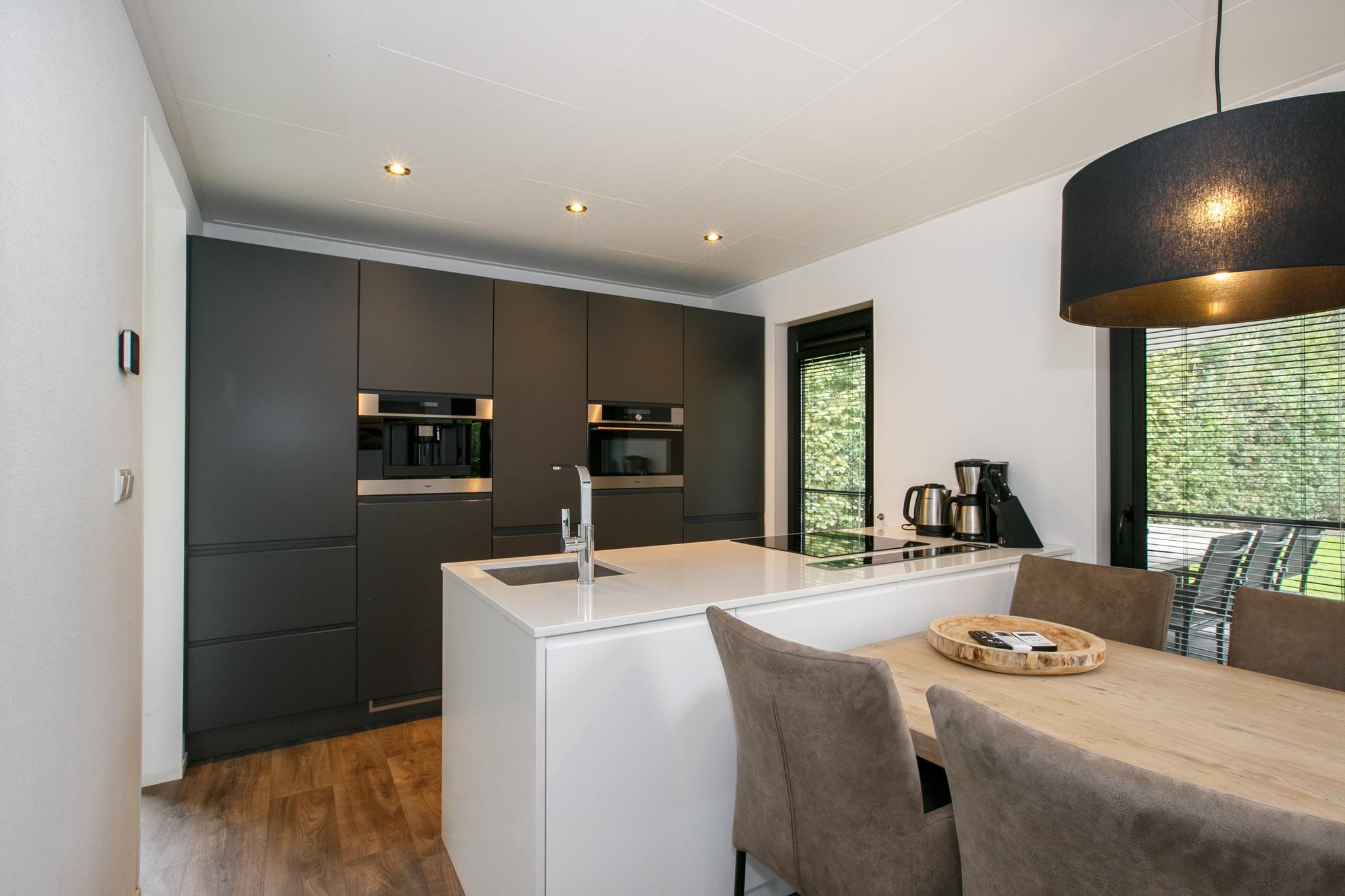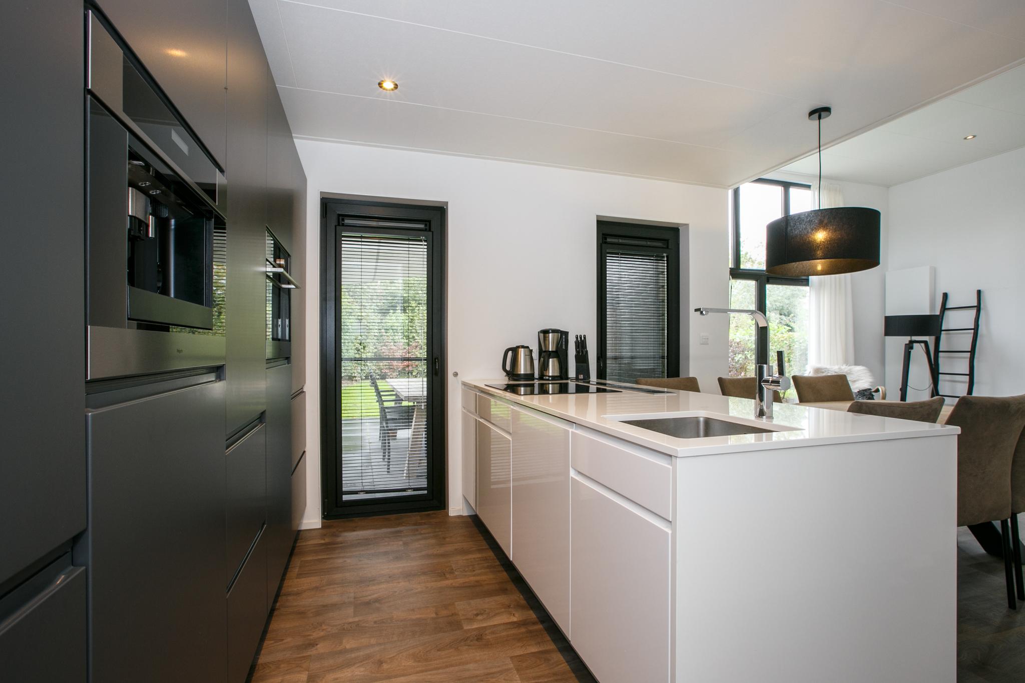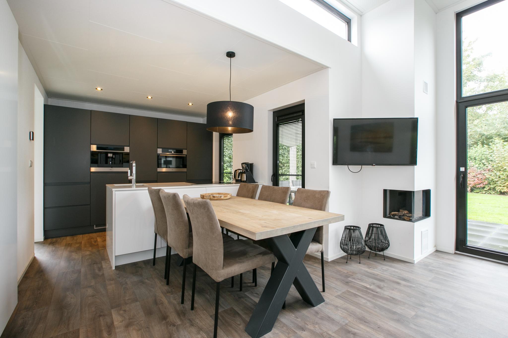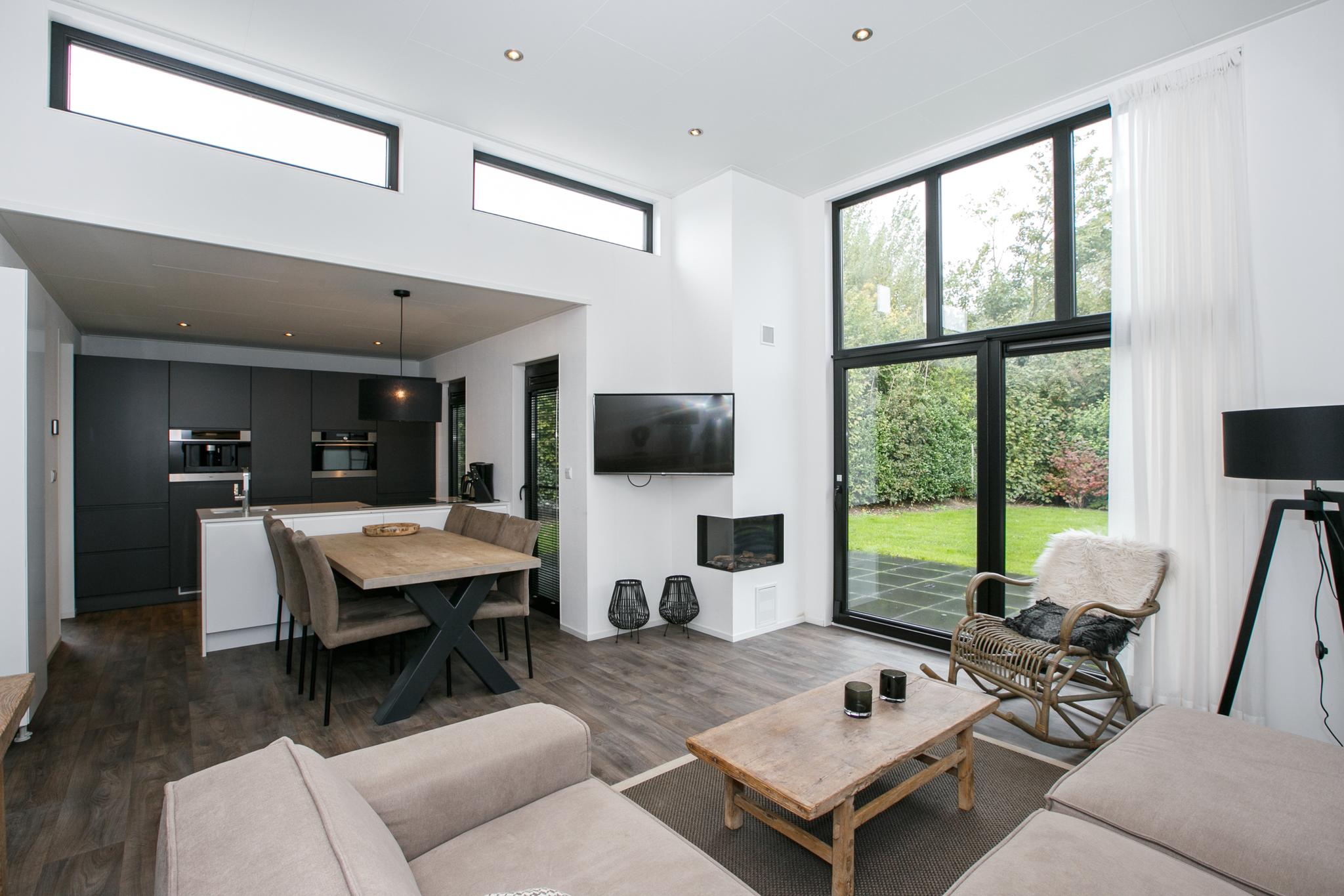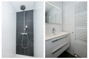 De entreehal geeft toegang tot de toiletruimte met wastafel, de woon/eetkamer en een slaapkamer. De gezellige woon/eetkamer, in warme tinten, is voorzien van een sfeervolle gashaard, een mooie PVC vloer, inbouwspots en een grote schuifpui naar de tuin. De grote raampartijen zorgen voor veel lichtinval. In het verlengde van de woonkamer is de eethoek gesitueerd. Aansluitend is de open keuken bereikbaar. De moderne keuken is voorzien van een donkergrijze kastenwand, een wit spoel/kookeiland en diverse inbouwapparatuur: kookplaat, afzuigkap, combi-magnetron, koel-/vriescombinatie en vaatwasser. De ruime slaapkamer, bereikbaar vanuit de entreehal, is voorzien van een PVC vloer, een grote vaste kast en een eigen badkamer. De geheel betegelde badkamer is voorzien van een inloopdouche, een wastafel en een designradiator. Vanuit de woonkamer is de tweede hal bereikbaar. Deze hal geeft toegang tot de tweede slaapkamer en een ruimte waar de CV-ketel hangt en de witgoedaansluitingen zijn. De tweede slaapkamer is voorzien van een PVC vloer, een vaste kast en een eigen badkamer. De badkamer is geheel betegeld en voorzien van een inloopdouche, een wastafel en een designradiator.