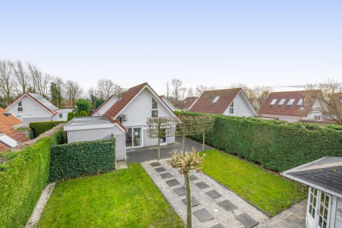 De ruime tuin rondom de woning biedt volop mogelijkheden om te ontspannen. Het geheel is verzorgd aangelegd met een terras, gazon, siergrind en enkele bomen. De haag rondom zorgt voor optimale privacy. Achter in de tuin staat een houten berging en aan de achterzijde van de woning is een tweede berging aangebouwd met vaste kast. Voor de woning is ruimte om twee auto’s te parkeren.