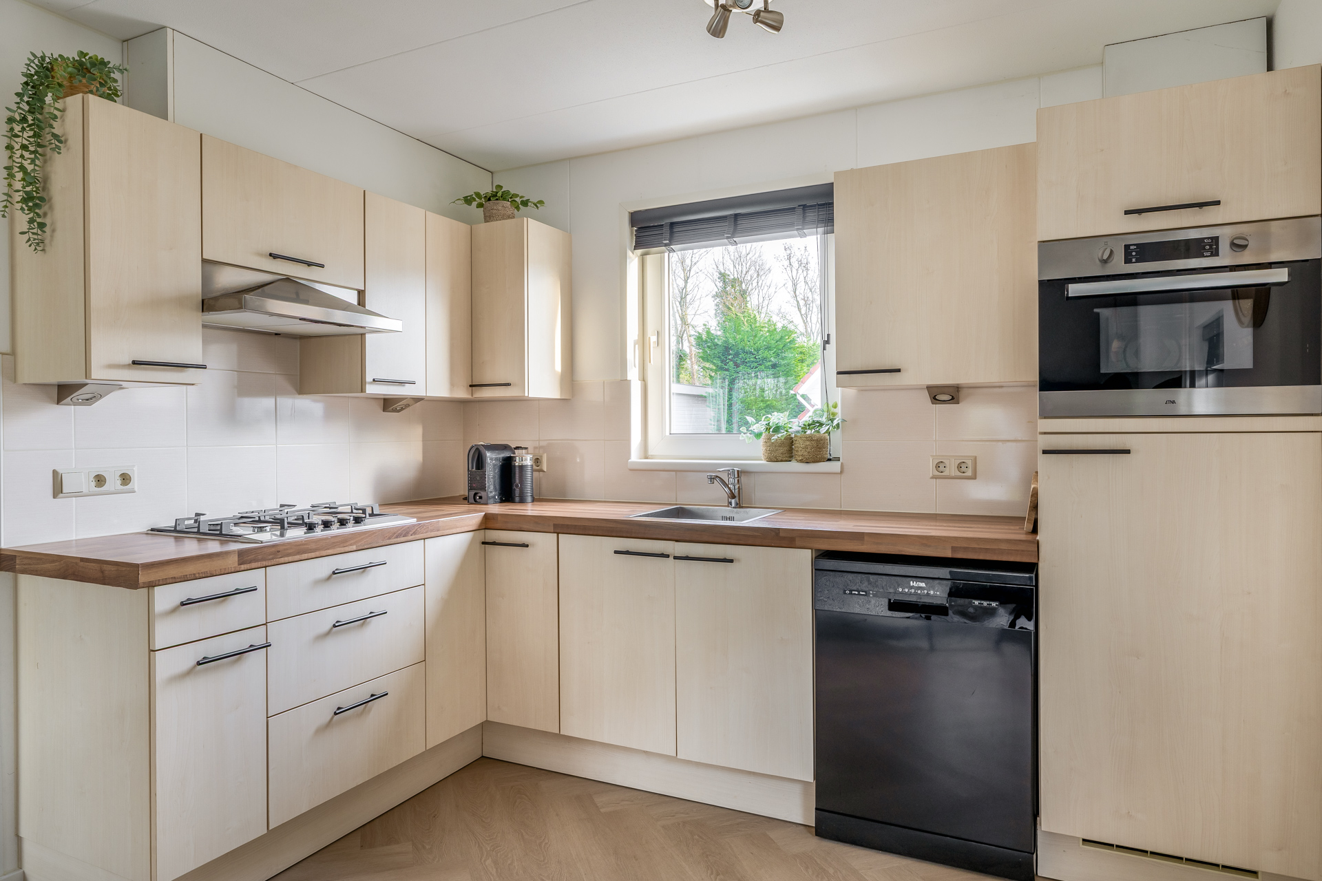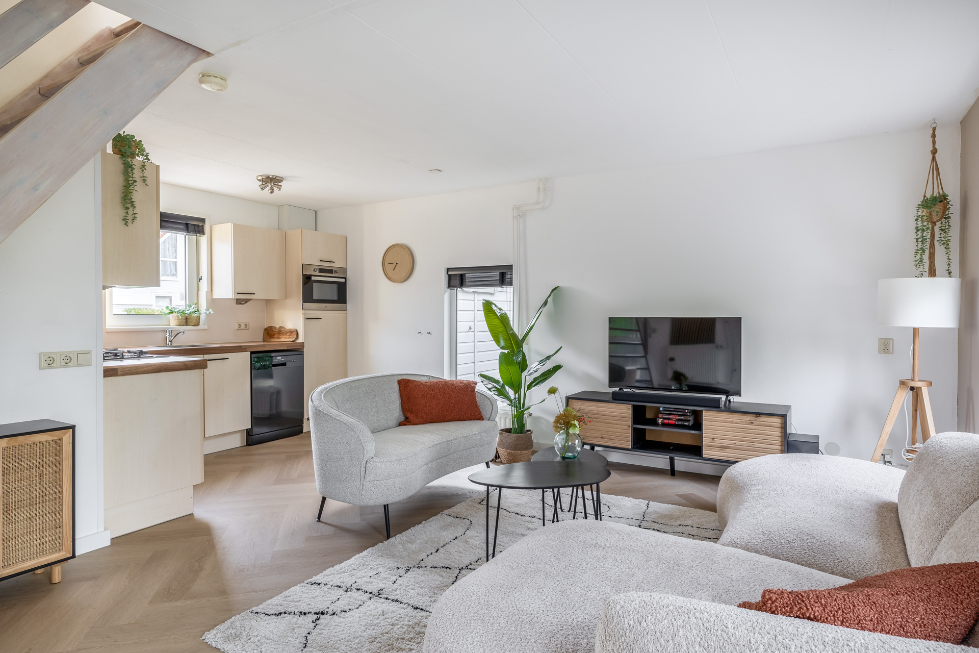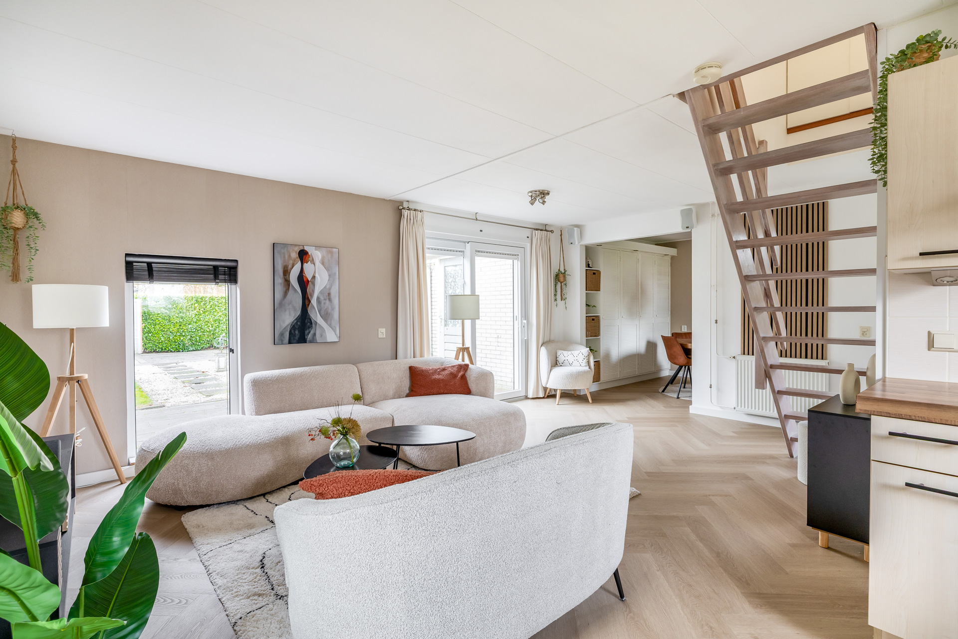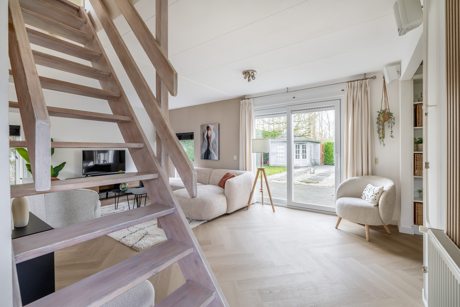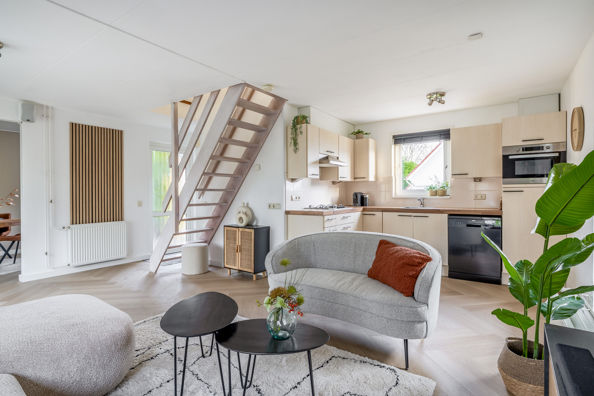 Via de entreehal bereik je de woon- en eetkamer, de open keuken, de badkamer en een praktische kast met witgoedaansluitingen. De woonkamer is warm en uitnodigend ingericht en afgewerkt met een fraaie visgraat laminaatvloer. Grote raampartijen en een schuifpui naar de tuin zorgen voor veel licht en een directe verbinding met buiten. De open keuken is functioneel en compleet uitgerust met een kookplaat, afzuigkap, combi oven, koel-/vriescombinatie en vaatwasser. De badkamer is volledig betegeld en voorzien van een douche, wastafel, toilet en designradiator.