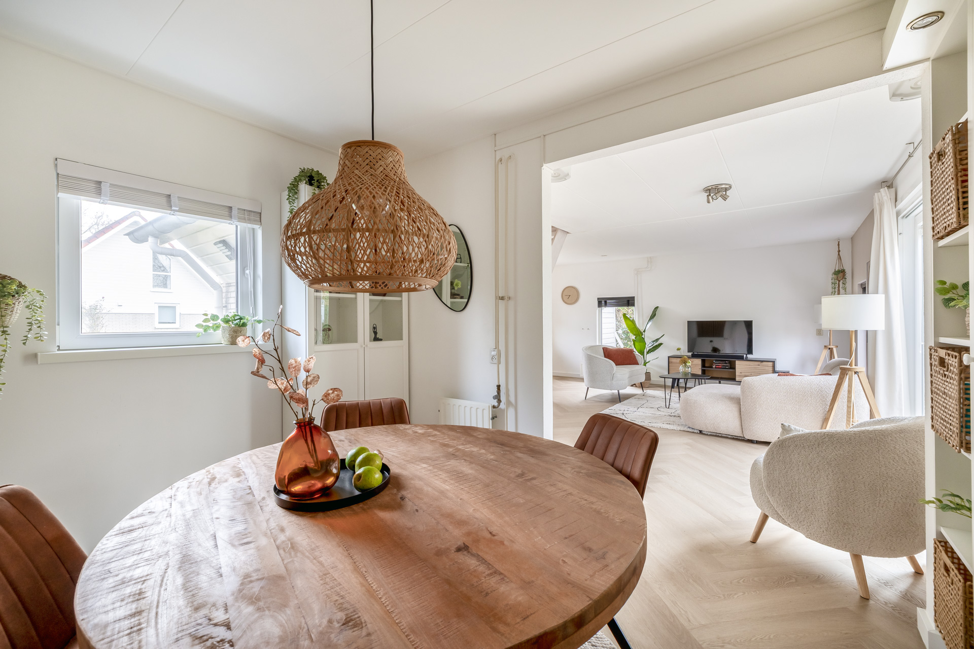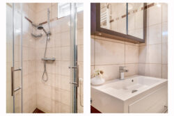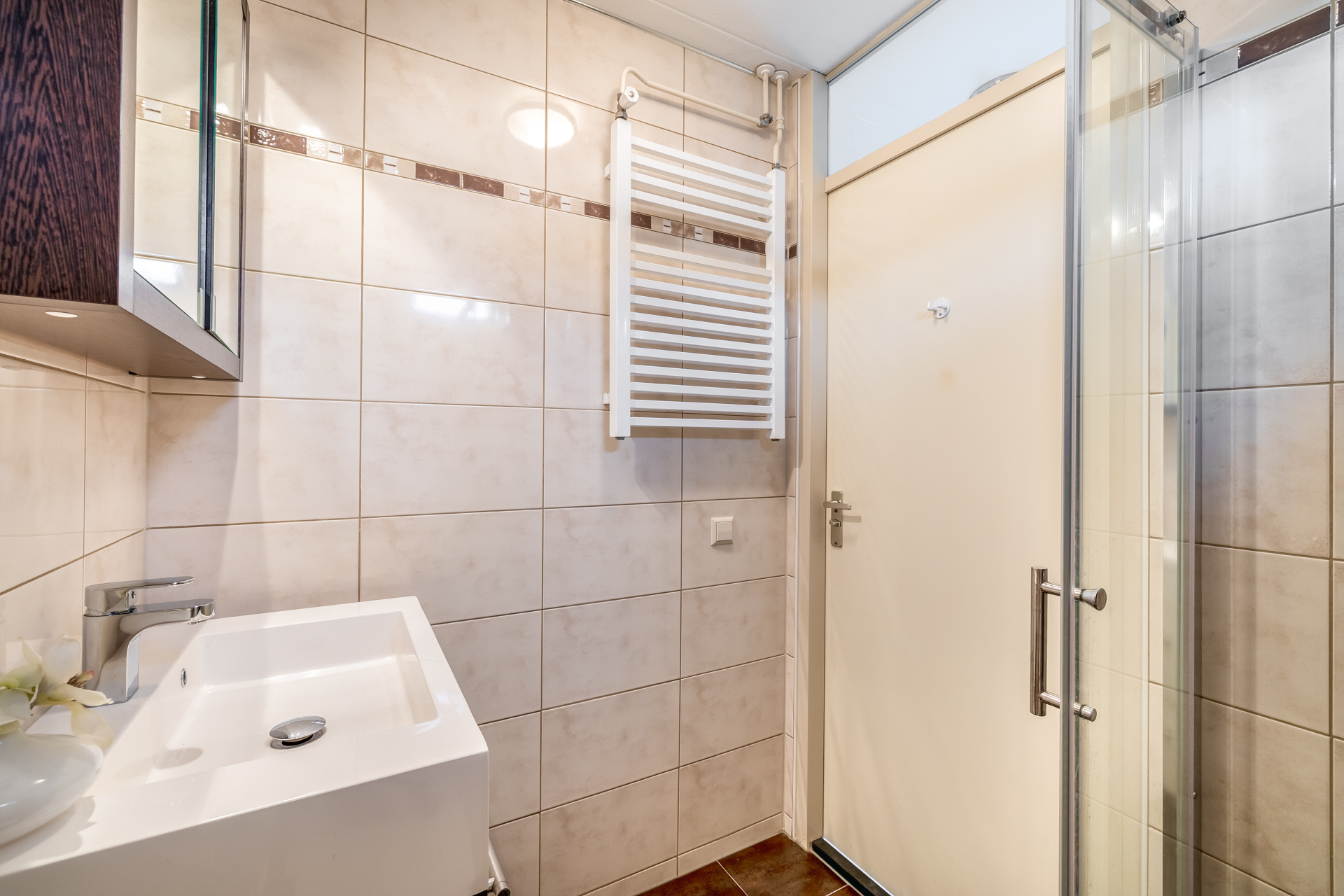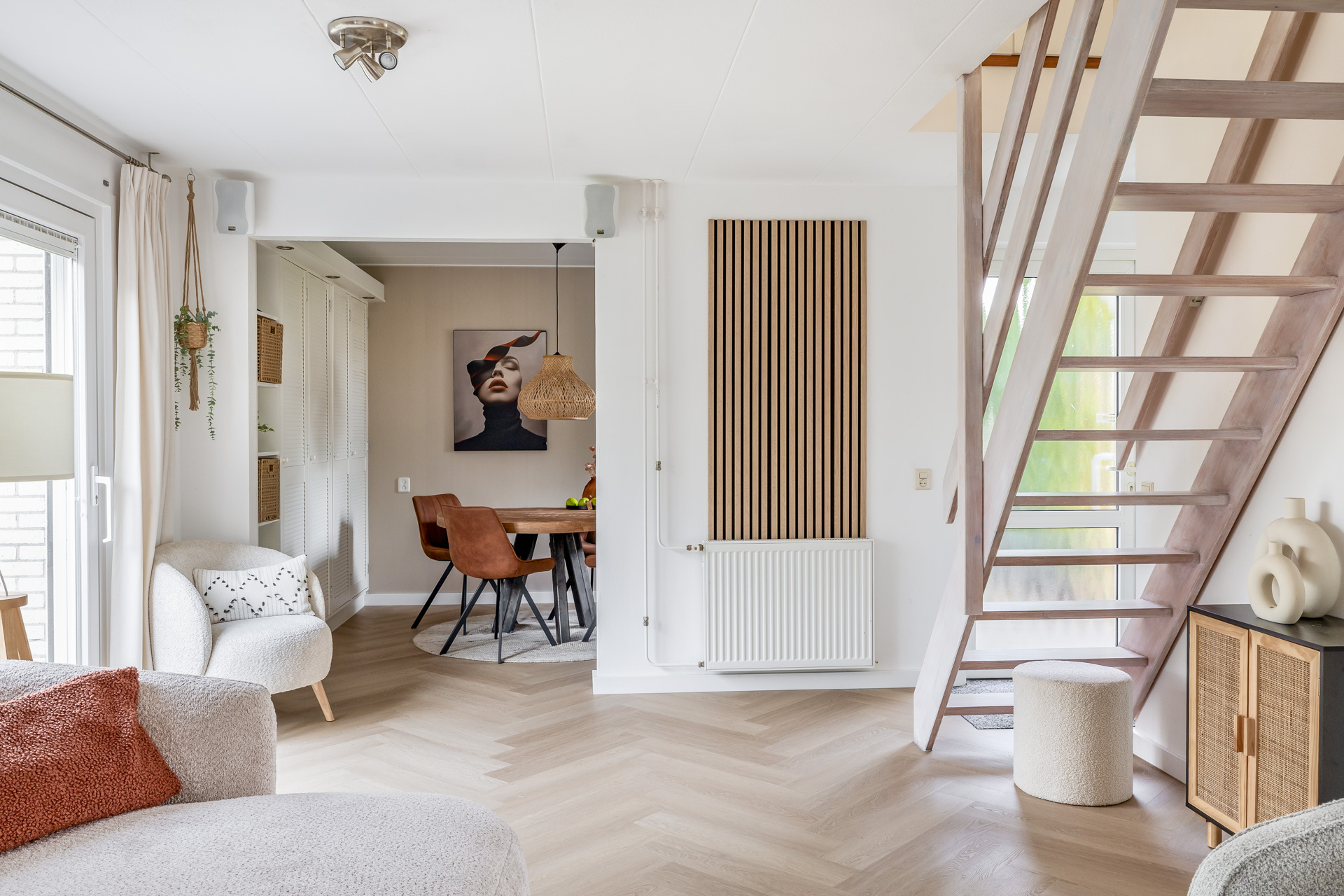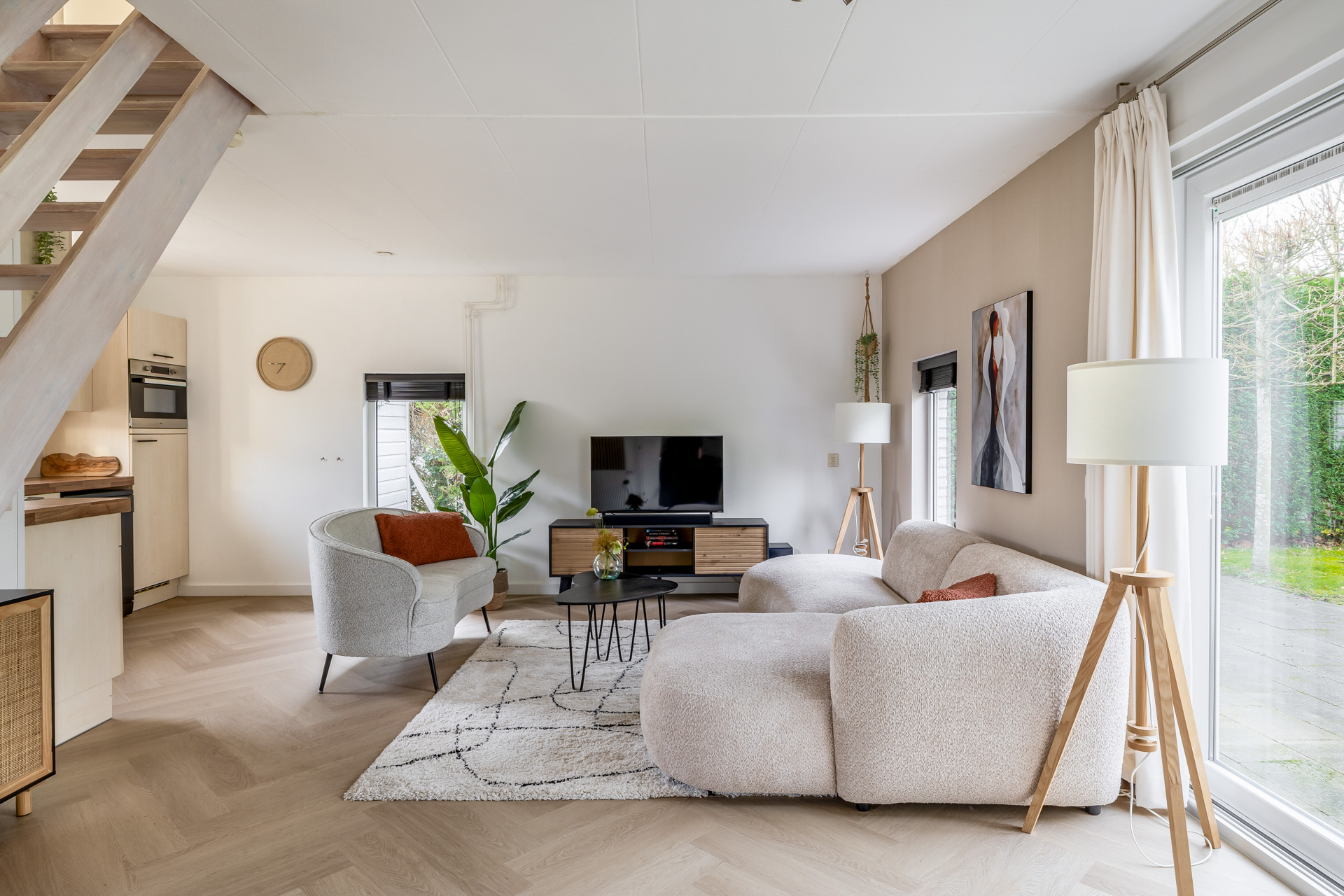 Via de entreehal bereik je de woon- en eetkamer, de open keuken, de badkamer en een praktische kast met witgoedaansluitingen. De woonkamer is warm en uitnodigend ingericht en afgewerkt met een fraaie visgraat laminaatvloer. Grote raampartijen en een schuifpui naar de tuin zorgen voor veel licht en een directe verbinding met buiten. De open keuken is functioneel en compleet uitgerust met een kookplaat, afzuigkap, combi oven, koel-/vriescombinatie en vaatwasser. De badkamer is volledig betegeld en voorzien van een douche, wastafel, toilet en designradiator.