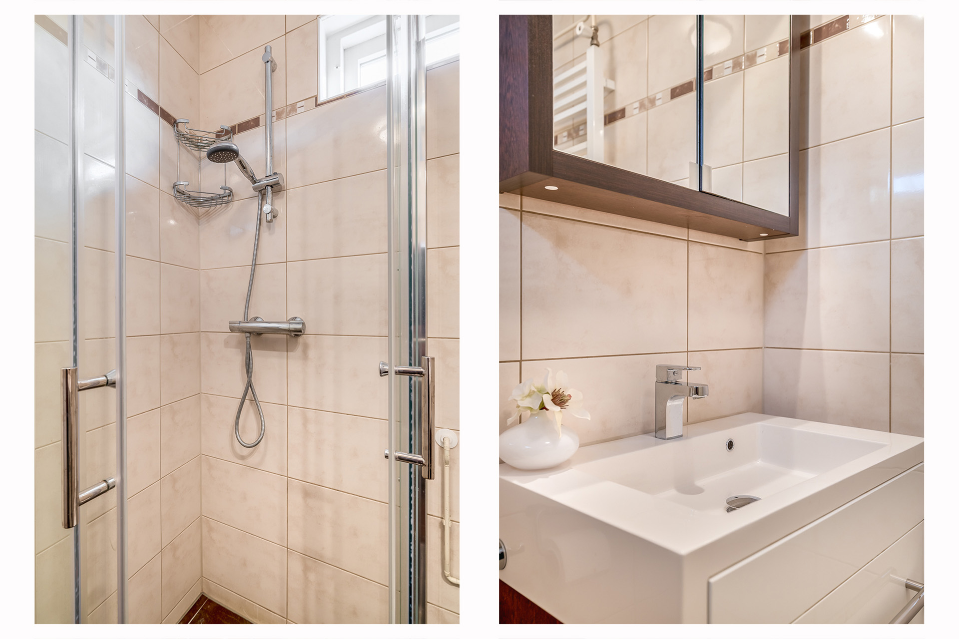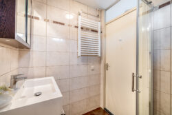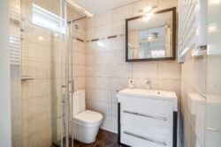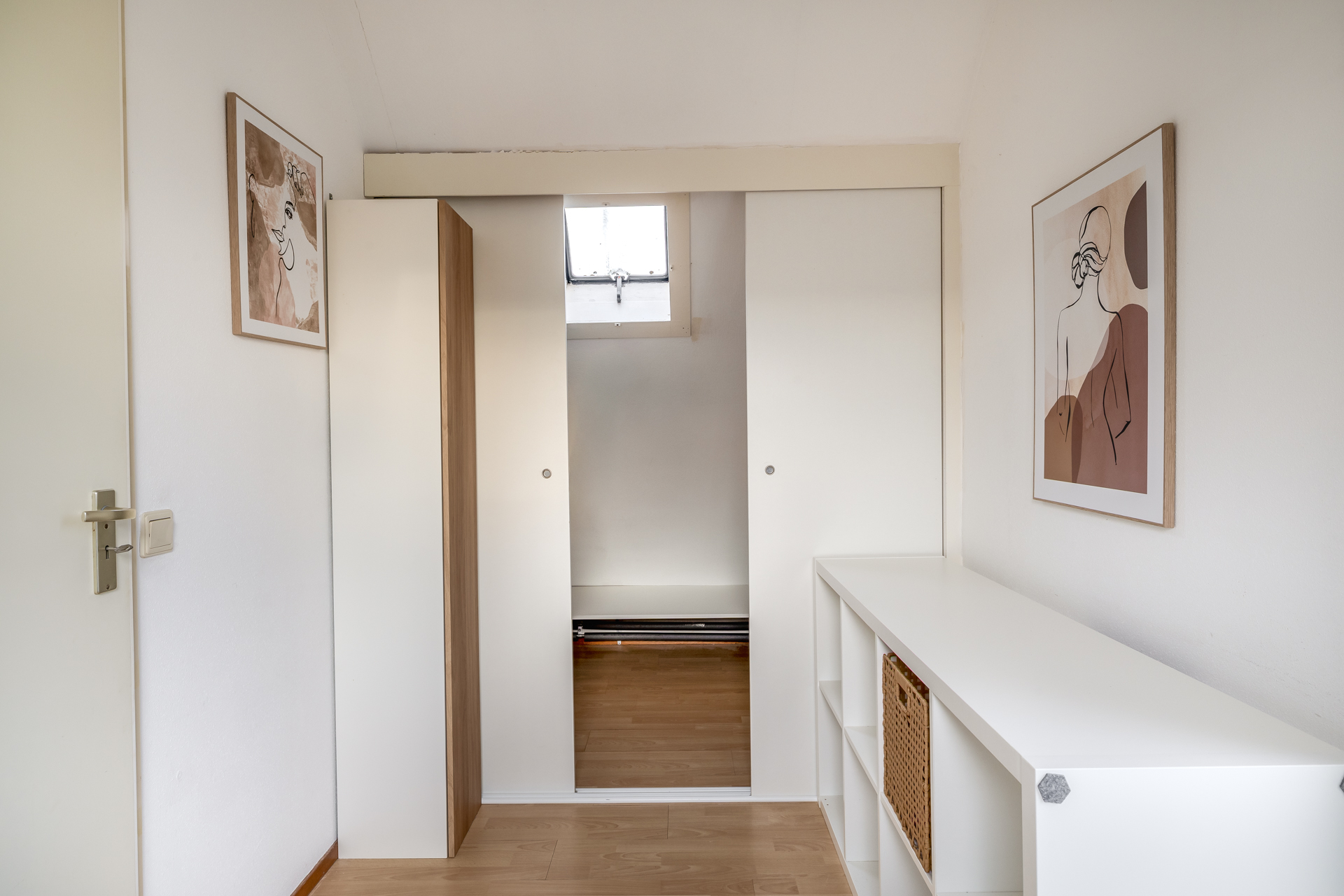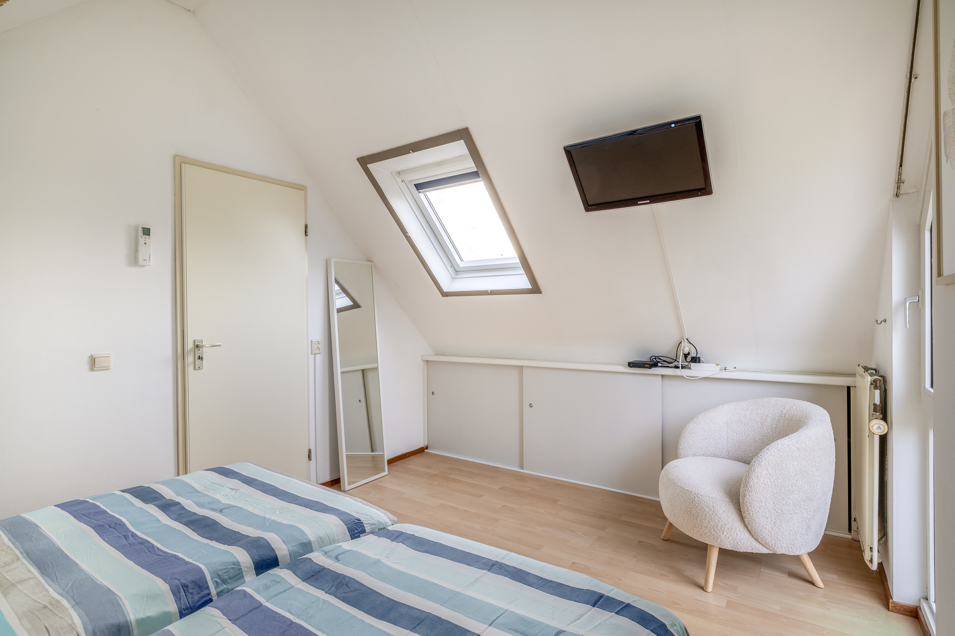 De overloop biedt toegang tot twee comfortabele slaapkamers en een separaat toilet. Beide slaapkamers zijn afgewerkt met een laminaatvloer en beschikken over bergruimte onder beide zijden onder het schuine dak. Dankzij de dakramen is er prettig veel daglicht. Eén van de slaapkamers is voorzien van een airco.