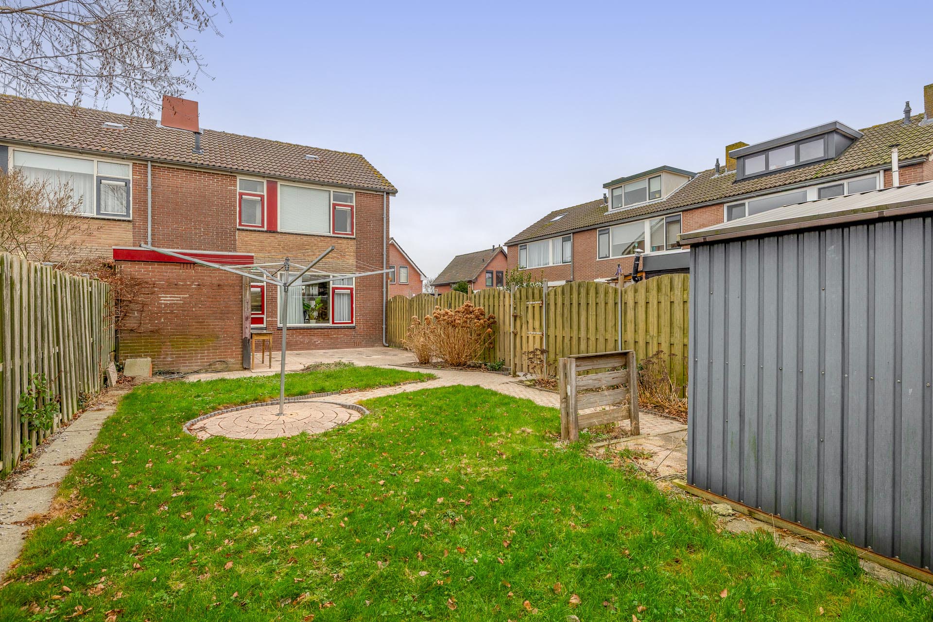 De achtertuin is een absolute meerwaarde. Met een diepte van ruim 16 meter en een ligging op het westen geniet je hier volop van de middag en avondzon. De tuin is onderhoudsvriendelijk aangelegd met gras en beplanting en beschikt over een handige achterom. De aangebouwde stenen berging biedt ruime opslagmogelijkheden, aangevuld met een extra kunststof berging achter in de tuin.