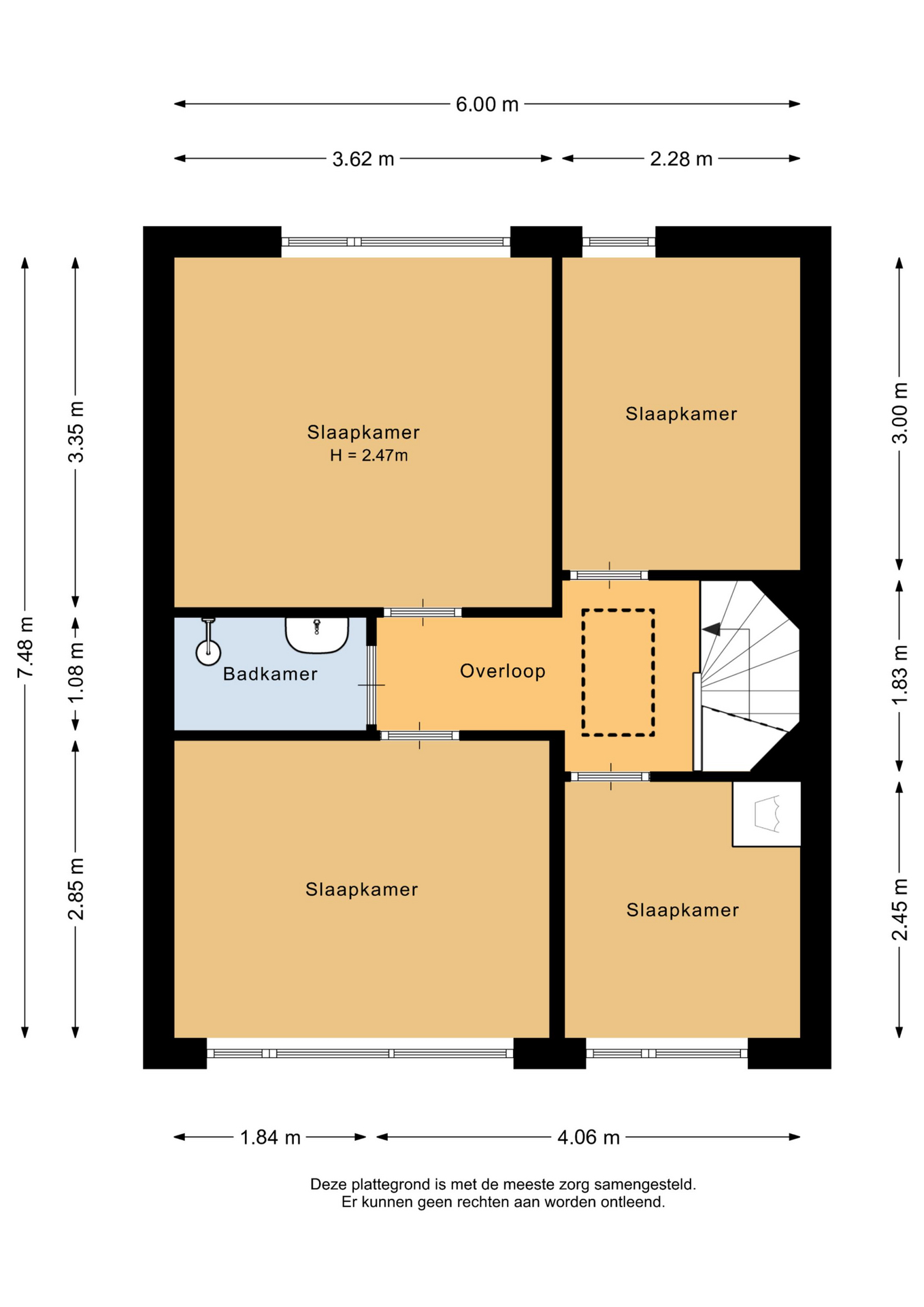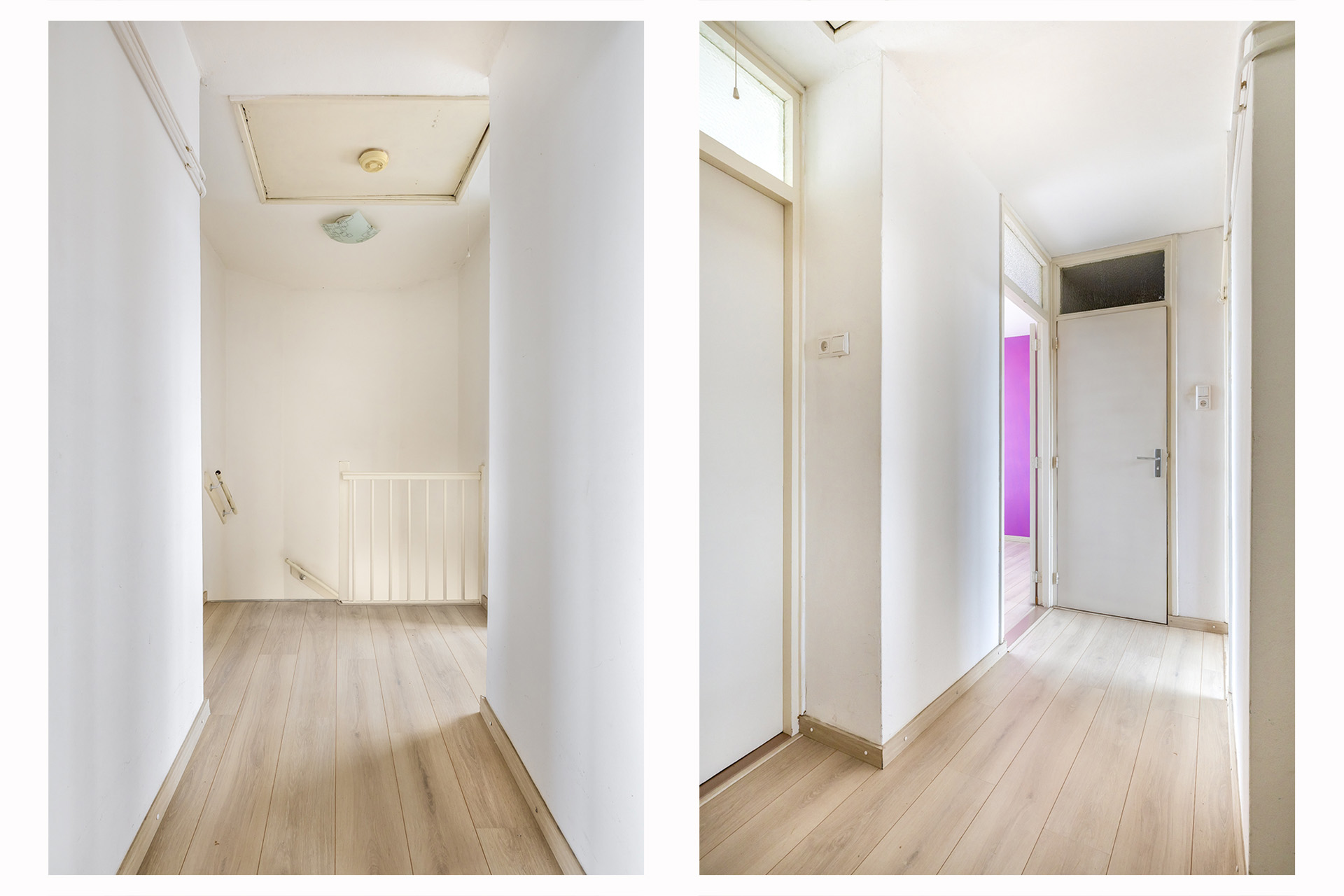Op de eerste verdieping bevinden zich vier slaapkamers, stuk voor stuk functioneel en veelzijdig in te richten. Ideaal voor een gezin, werken aan huis of logeerruimte. De badkamer beschikt over een wastafel en een inloopdouche. Via een vlizotrap is de zolder bereikbaar, een praktische bergruimte voor alles wat je uit het zicht wilt bewaren.
