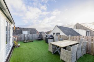 De voortuin is gelegen op het noordoosten en is circa 34 m² groot. Vanaf de overloop op de eerste verdieping is het grote dakterras bereikbaar. Het dakterras is circa 33 m² groot en gelegen op het zuidoosten. Het is hier heerlijk vertoeven. De inpandige berging bevindt zich rechts van de woning. De berging is bereikbaar vanuit de hal en aan de voorzijde via openslaande deuren. In de berging bevindt zich een grote vaste kast met daarin de witgoedaansluitingen.