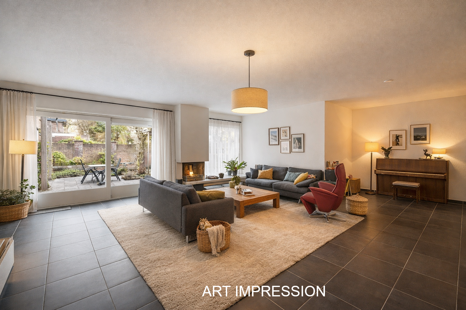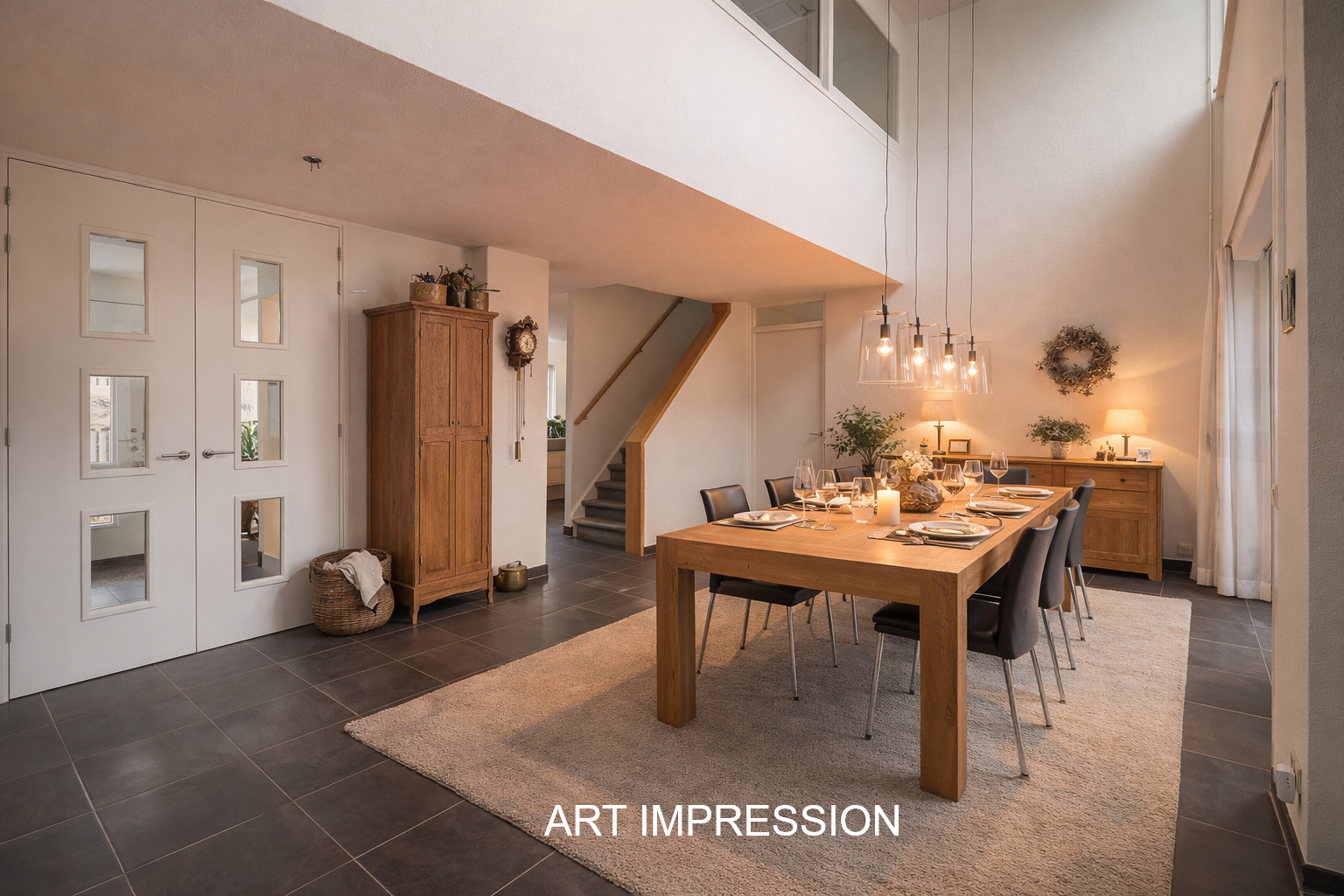 Bij binnenkomst ervaart u direct de ruimte en het licht. De royale woon- en eetkamer vormen het hart van de woning en zijn dankzij de grote raampartijen en schuifpuien heerlijk licht. De sfeervolle gashaard en de comfortabele vloerverwarming zorgen voor een warme en uitnodigende uitstraling. De eetkamer met hoog plafond en zicht op de vide geeft de woning een extra ruimtelijk gevoel en staat in directe verbinding met de tuin.