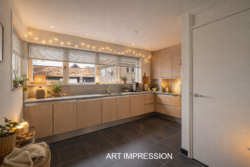 De moderne, greeploze open keuken aan de voorzijde is praktisch en stijlvol ingericht, met veel bergruimte en complete inbouwapparatuur. Vanuit de keuken bereikt u zowel de bijkeuken als de trap naar de eerste verdieping.