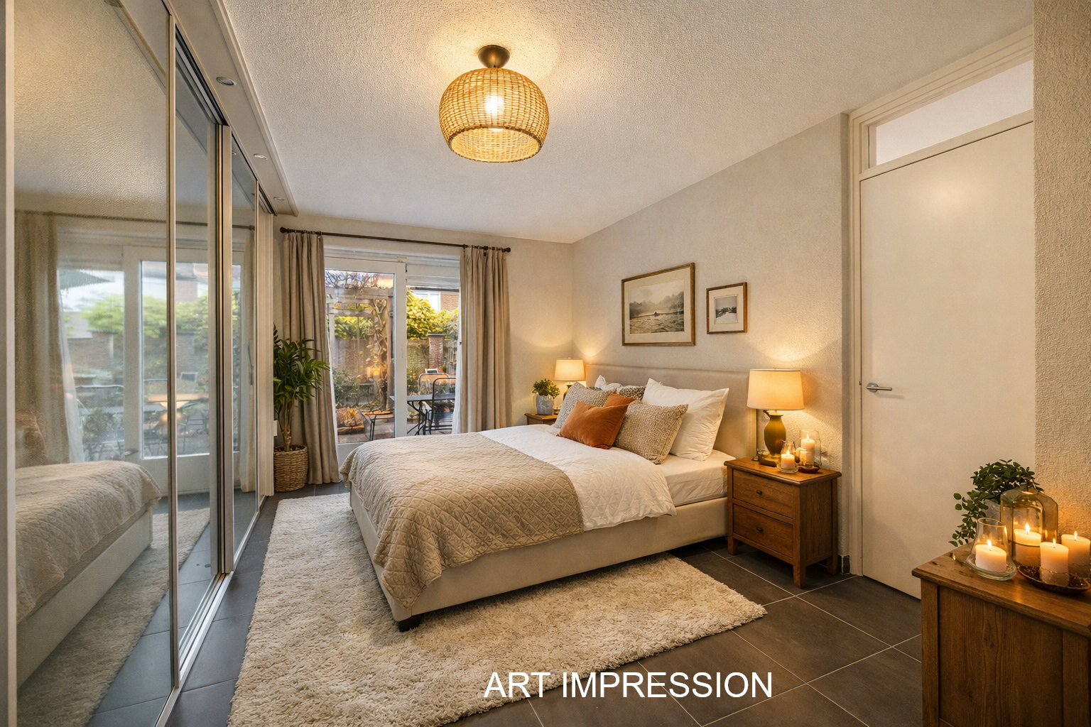 Op de begane grond bevindt zich tevens een ruime slaapkamer met kastenwand en schuifpui naar de tuin. De aangrenzende badkamer is volledig betegeld en uitgevoerd met ligbad, douche, dubbele wastafel, toilet en vloerverwarming. De gehele begane grond is afgewerkt met een plavuizen vloer en vloerverwarming.