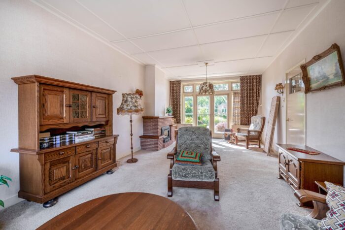 De entreehal, met meterkast en toilet, geeft toegang tot de woonkamer en keuken. De woonkamer is licht en voorzien van een open haard, welke bijdraagt aan heerlijke warme avonden in de wintermaanden. Aan de achterzijde zijn openslaande deuren naar de achtertuin. Vanuit de woonkamer is er toegang naar de keuken en ook deze ruimte beschikt over voldoende lichtinval. Grenzend aan de keuken is er een hal met badkamer, welke is voorzien van een douche en wastafel. De glas-in-lood ramen, terug te vinden in enkele ruimtes van de woning, geven het geheel een unieke sfeer en benadrukken de klassieke charme van het huis.