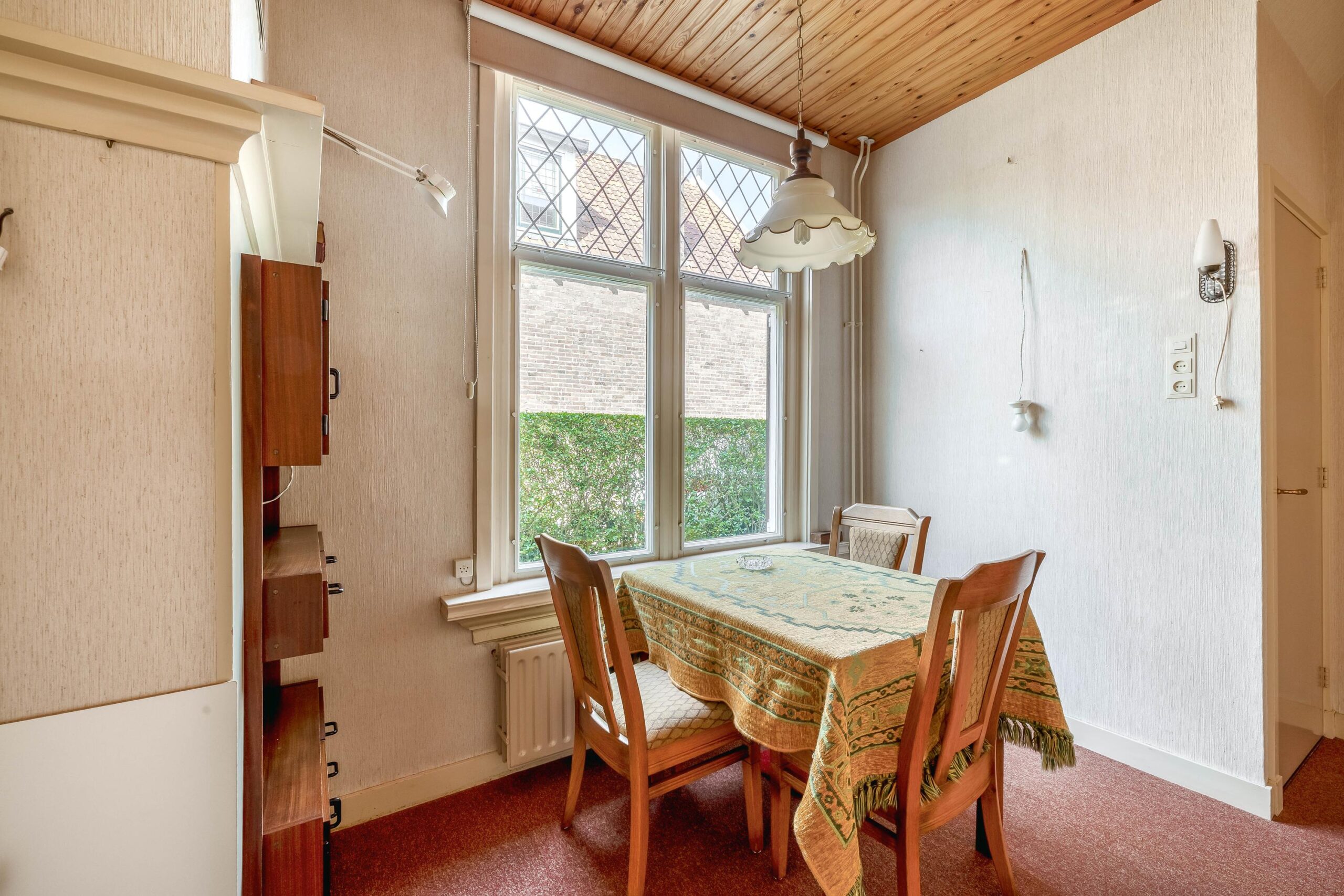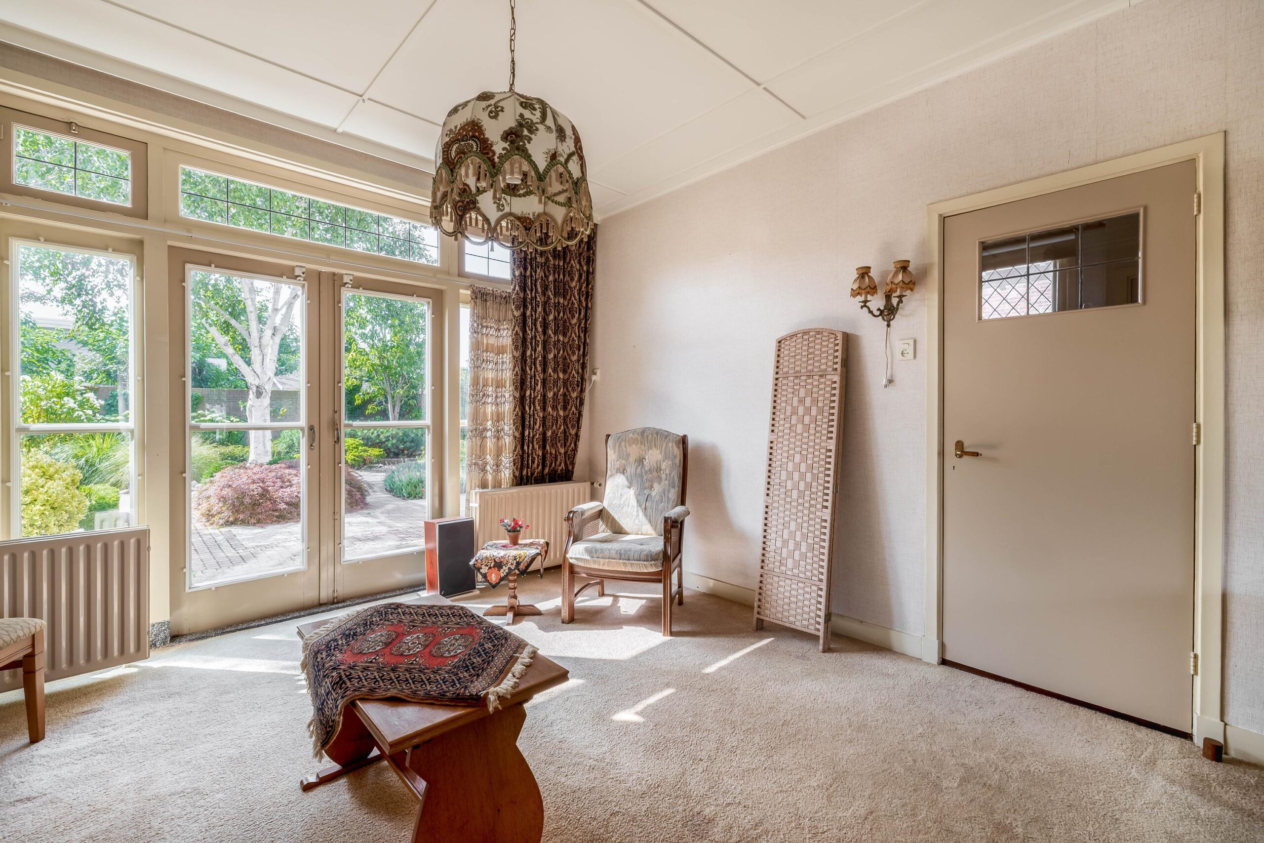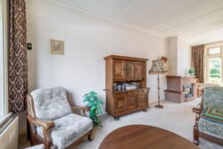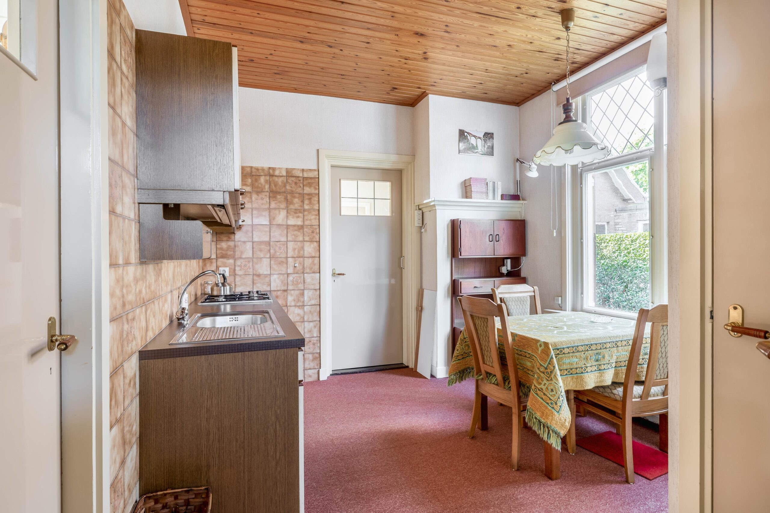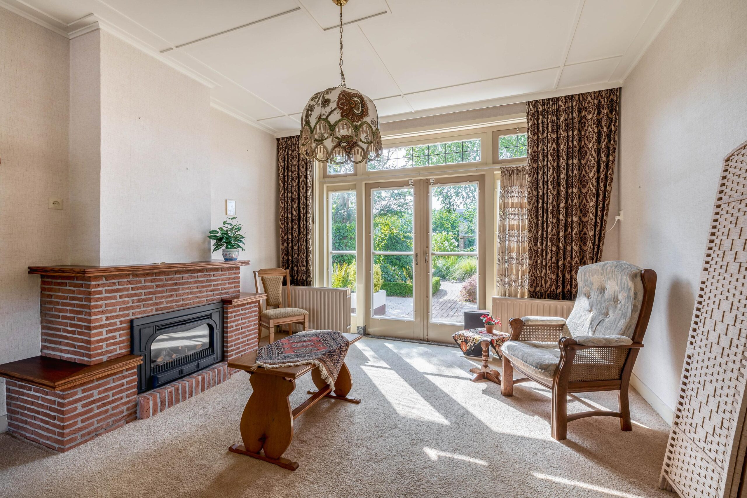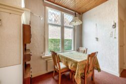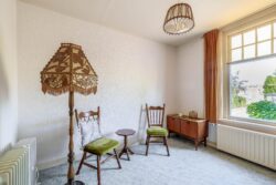 De entreehal, met meterkast en toilet, geeft toegang tot de woonkamer en keuken. De woonkamer is licht en voorzien van een open haard, welke bijdraagt aan heerlijke warme avonden in de wintermaanden. Aan de achterzijde zijn openslaande deuren naar de achtertuin. Vanuit de woonkamer is er toegang naar de keuken en ook deze ruimte beschikt over voldoende lichtinval. Grenzend aan de keuken is er een hal met badkamer, welke is voorzien van een douche en wastafel. De glas-in-lood ramen, terug te vinden in enkele ruimtes van de woning, geven het geheel een unieke sfeer en benadrukken de klassieke charme van het huis.