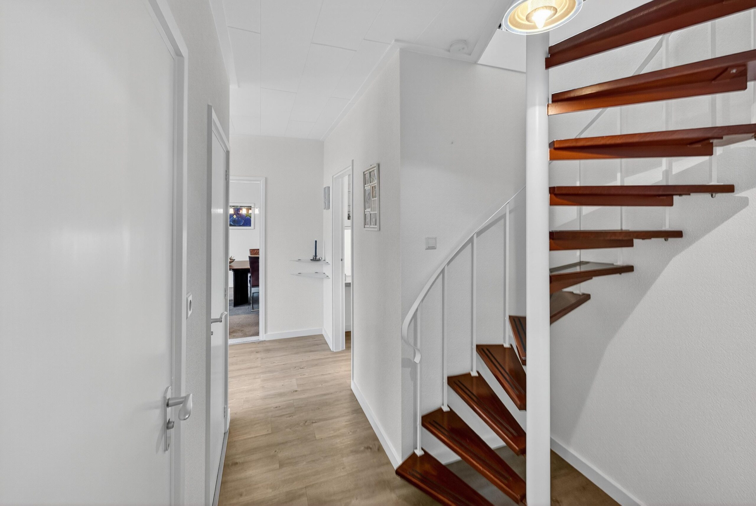 Via de entreehal, met trapopgang, bereikt u alle vertrekken op de begane grond. Aan de linkerzijde bevindt zich de royale woon-/eetkamer, waar de grote raampartijen zorgen voor een prettige lichtinval en uitzicht op de tuin. De woonkamer is voorzien van inbouwspots en een airco, wat zorgt voor extra comfort. In het verlengde ligt de lichte eetkamer, perfect voor gezellige diners. De open keuken, met laminaatvloer, beschikt over veel opbergruimte en is uitgerust met een kookplaat, oven, koelkast en vaatwasser. Vanuit hier loopt u zo de tuin in.
