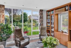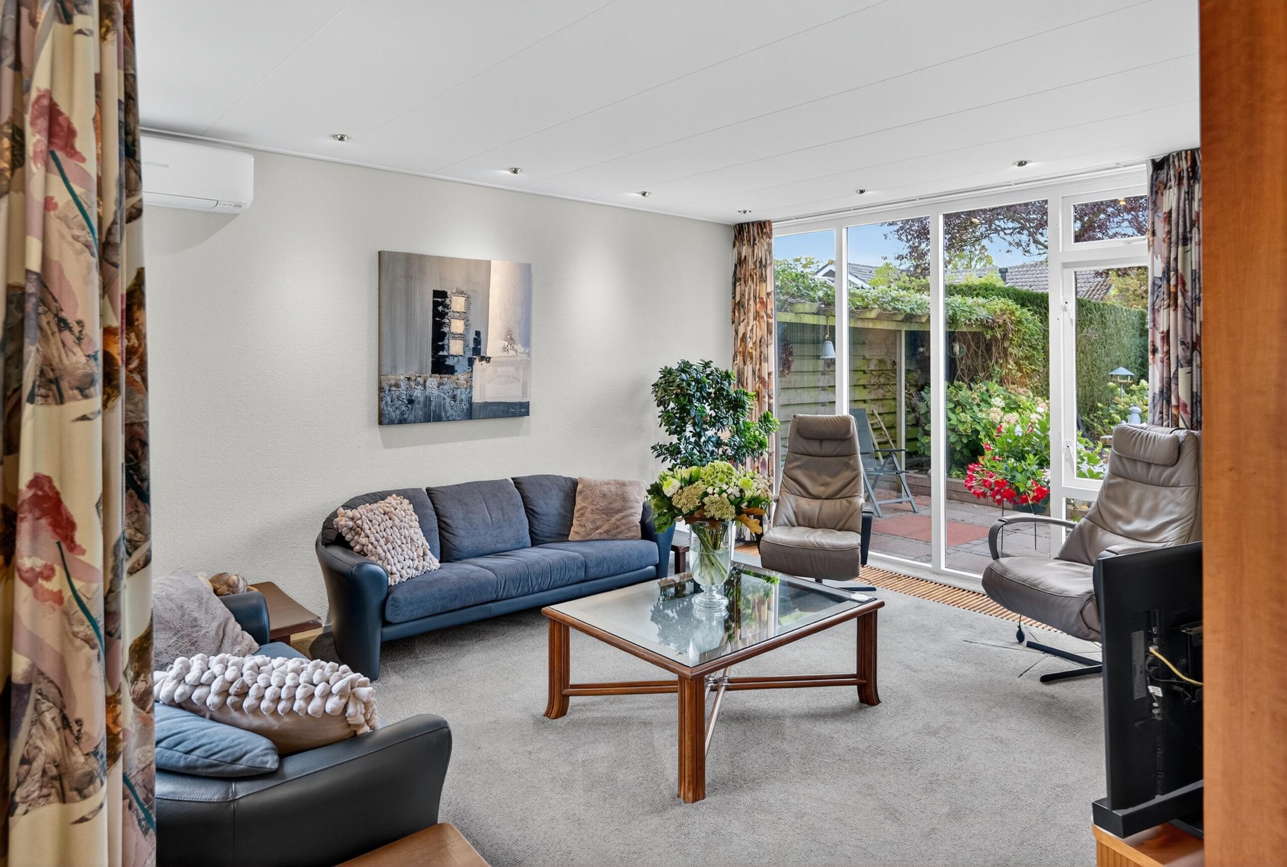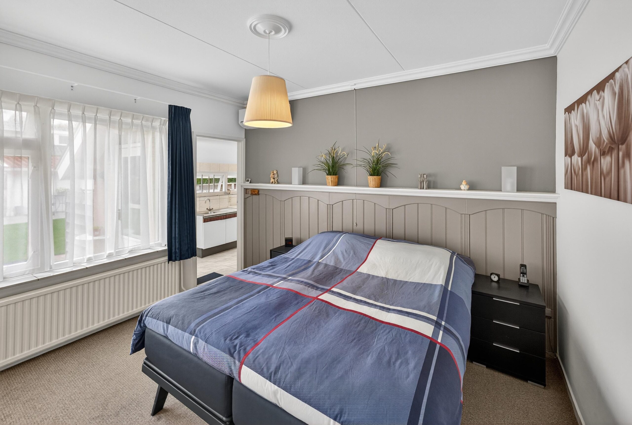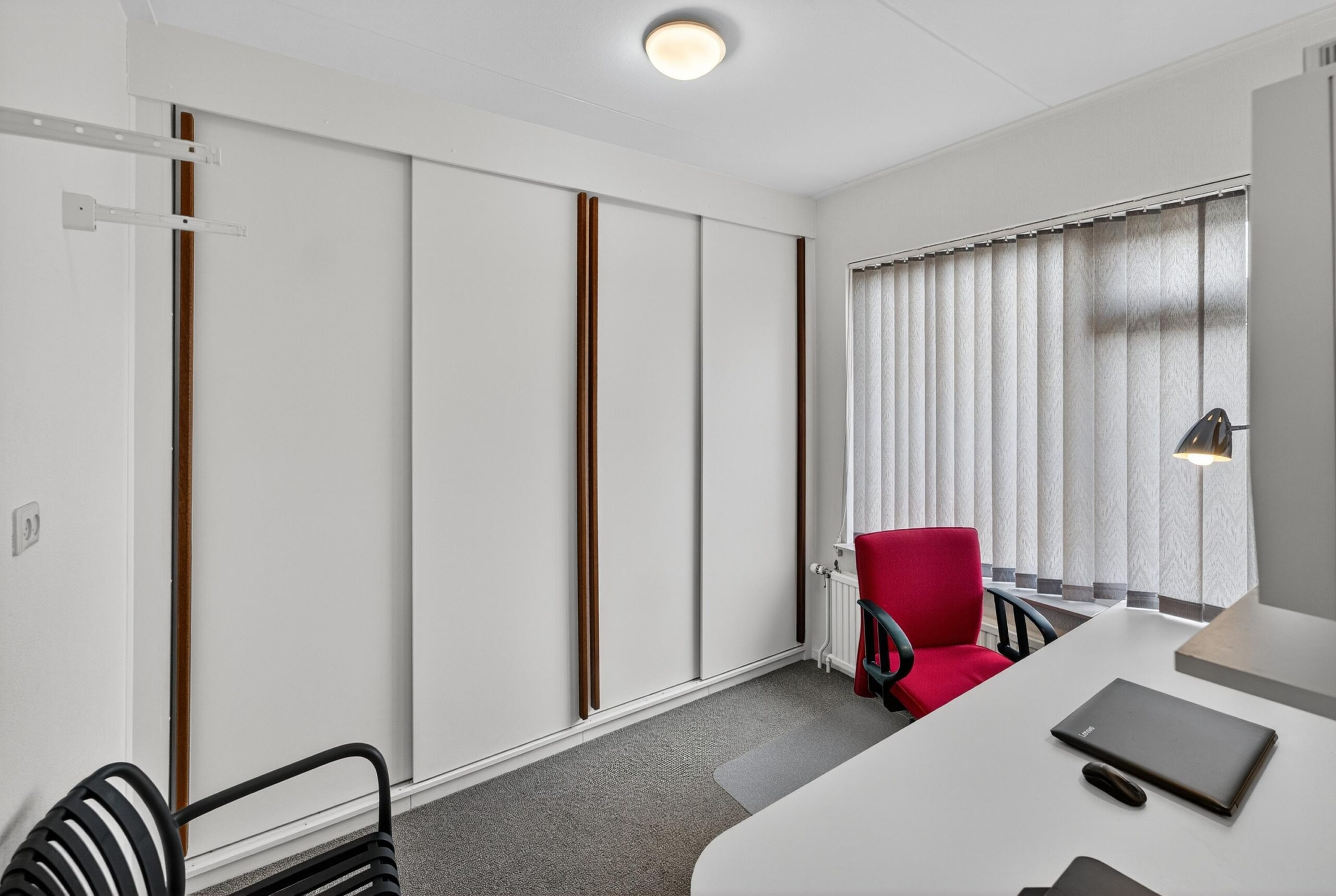 Aan de andere zijde van de woning bevindt zich een ruime slaapkamer met airconditioning en uitzicht op de tuin. Vanuit deze slaapkamer is de praktische bijkeuken bereikbaar, waar zich ook de CV-opstelling, witgoedaansluitingen en een extra keukenblok bevinden. De geheel betegelde badkamer is voorzien van een inloopdouche en wastafel. Aangrenzend vindt u een multifunctionele ruimte, ideaal als kantoor, hobbykamer of logeerkamer. Naast de badkamer is het separaat toilet (Geberit aquaclean).