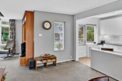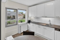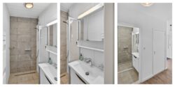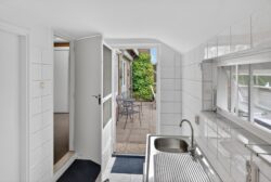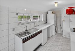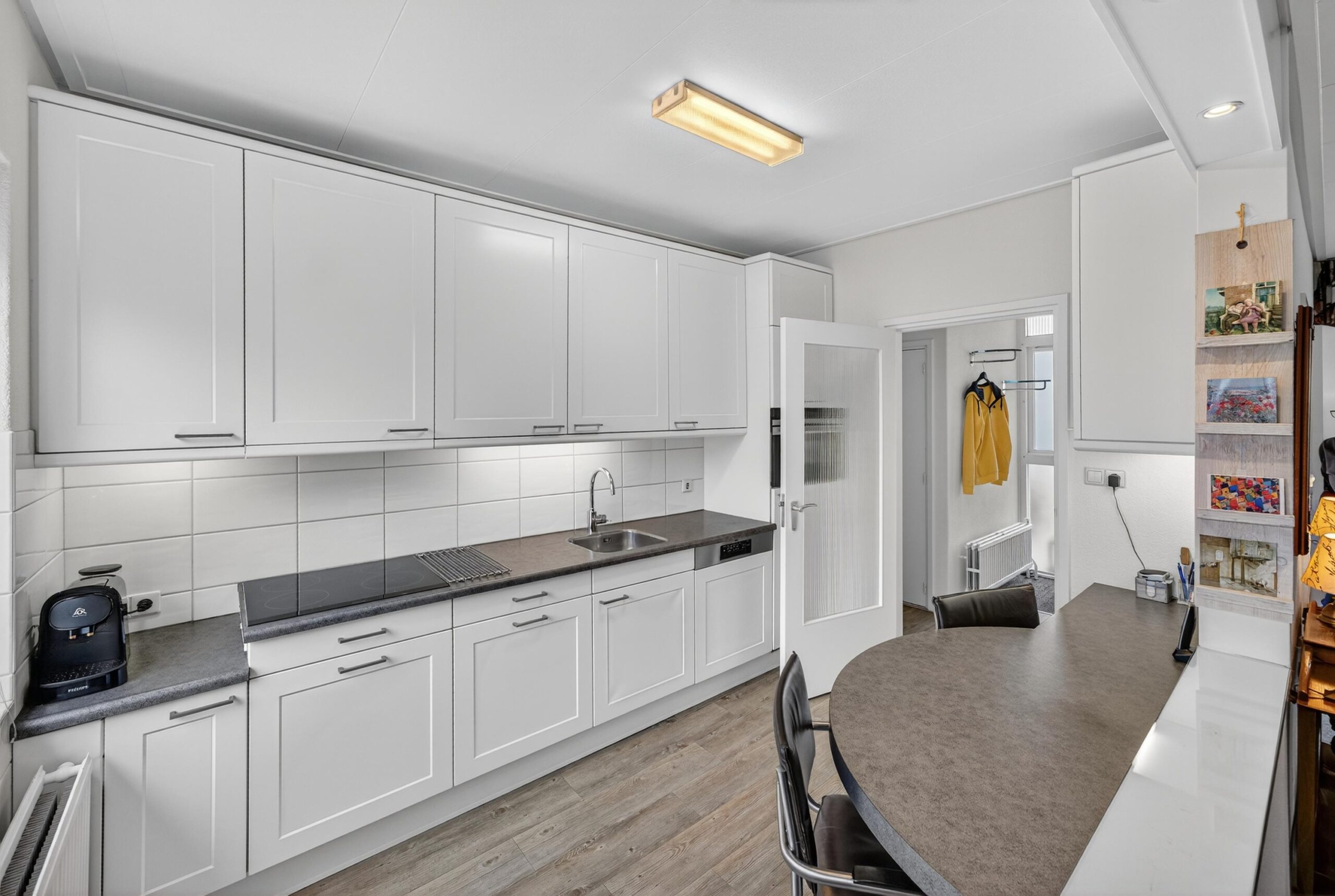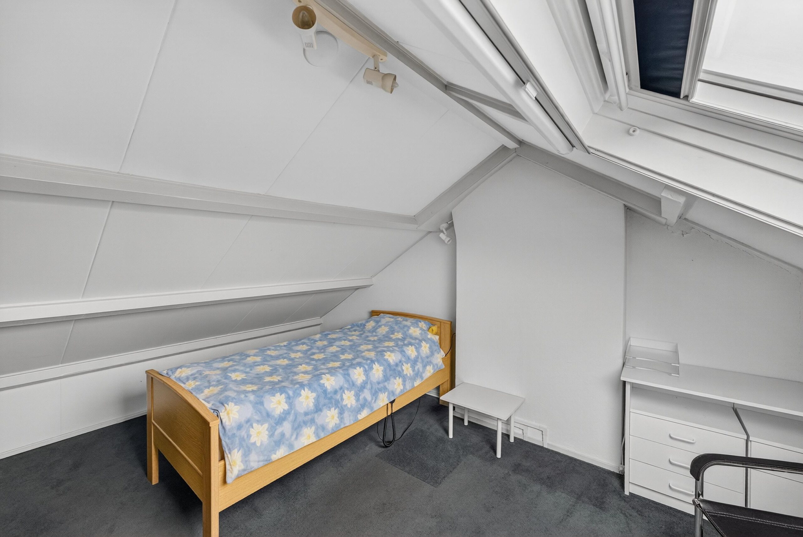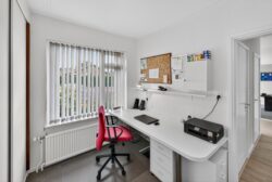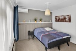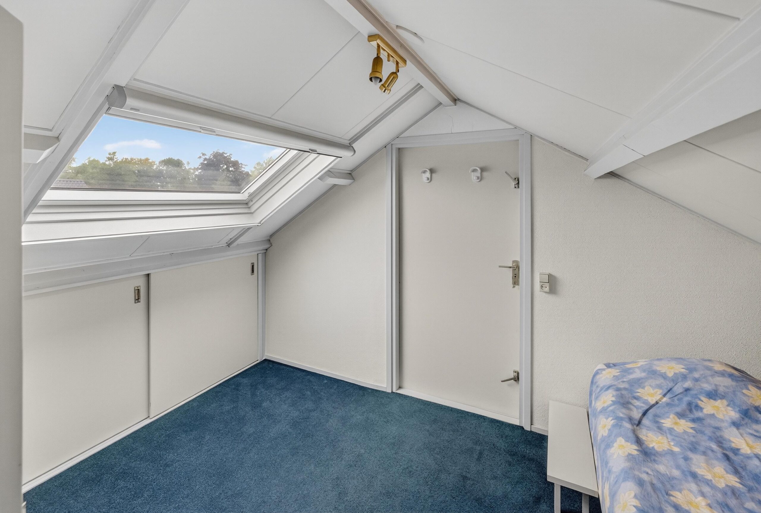 Aan de andere zijde van de woning bevindt zich een ruime slaapkamer met airconditioning en uitzicht op de tuin. Vanuit deze slaapkamer is de praktische bijkeuken bereikbaar, waar zich ook de CV-opstelling, witgoedaansluitingen en een extra keukenblok bevinden. De geheel betegelde badkamer is voorzien van een inloopdouche en wastafel. Aangrenzend vindt u een multifunctionele ruimte, ideaal als kantoor, hobbykamer of logeerkamer. Naast de badkamer is het separaat toilet (Geberit aquaclean).