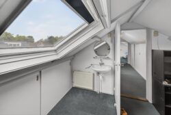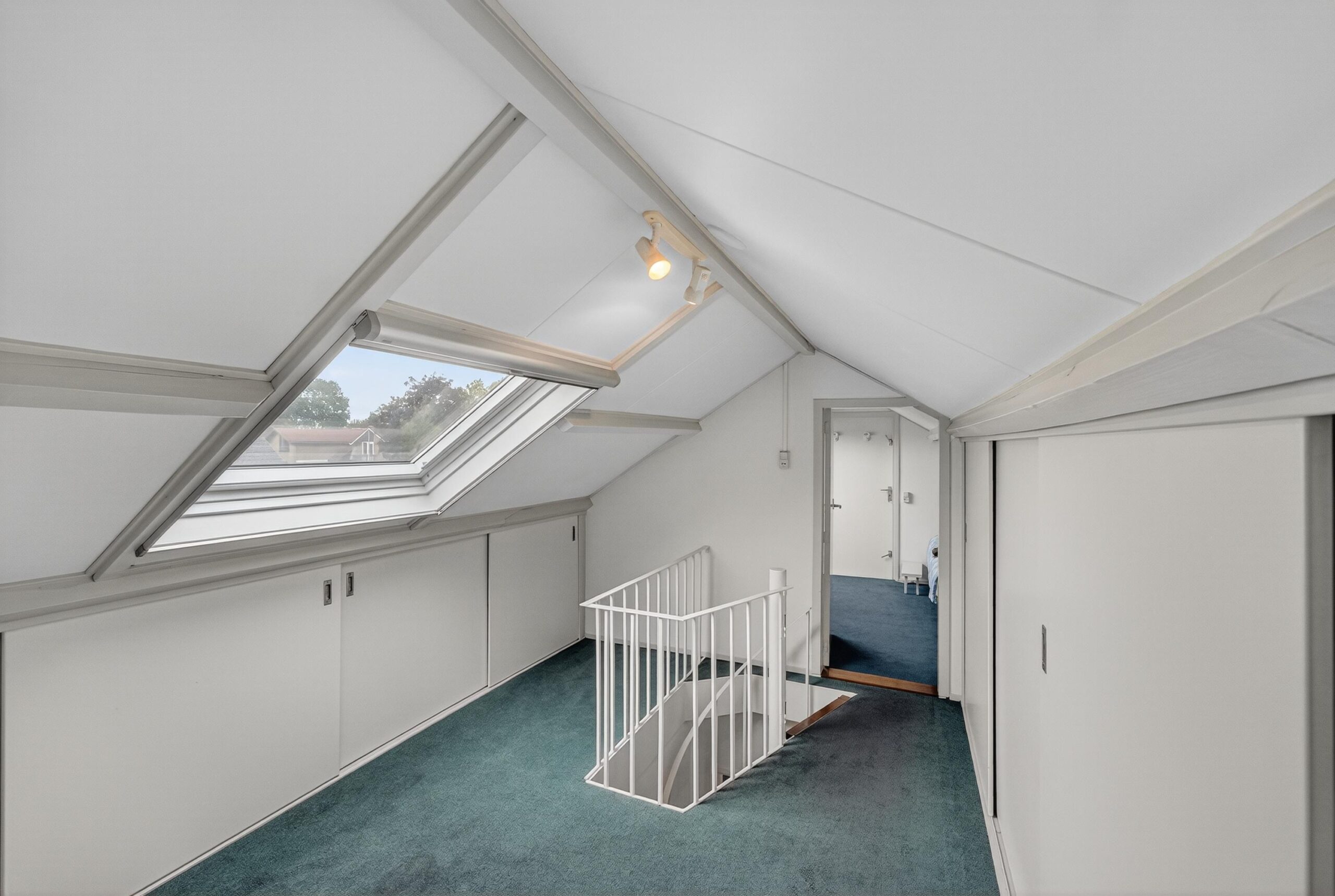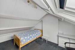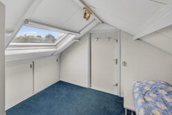 Via de wenteltrap bereikt u de overloop op de eerste verdieping. Deze is voorzien van een dakraam en handige opbergruimte onder het schuine dak. Op deze verdieping bevinden zich twee gezellige slaapkamers, beide met een eigen wastafel, dakraam en berging onder het dak.