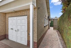 Aan de rechterzijde van de woning bevindt zich de inpandige garage, met toegang tot de bijkeuken aan de achterzijde. Aan de voorzijde biedt de oprit parkeergelegenheid op eigen terrein, bereikbaar via openslaande garagedeuren.