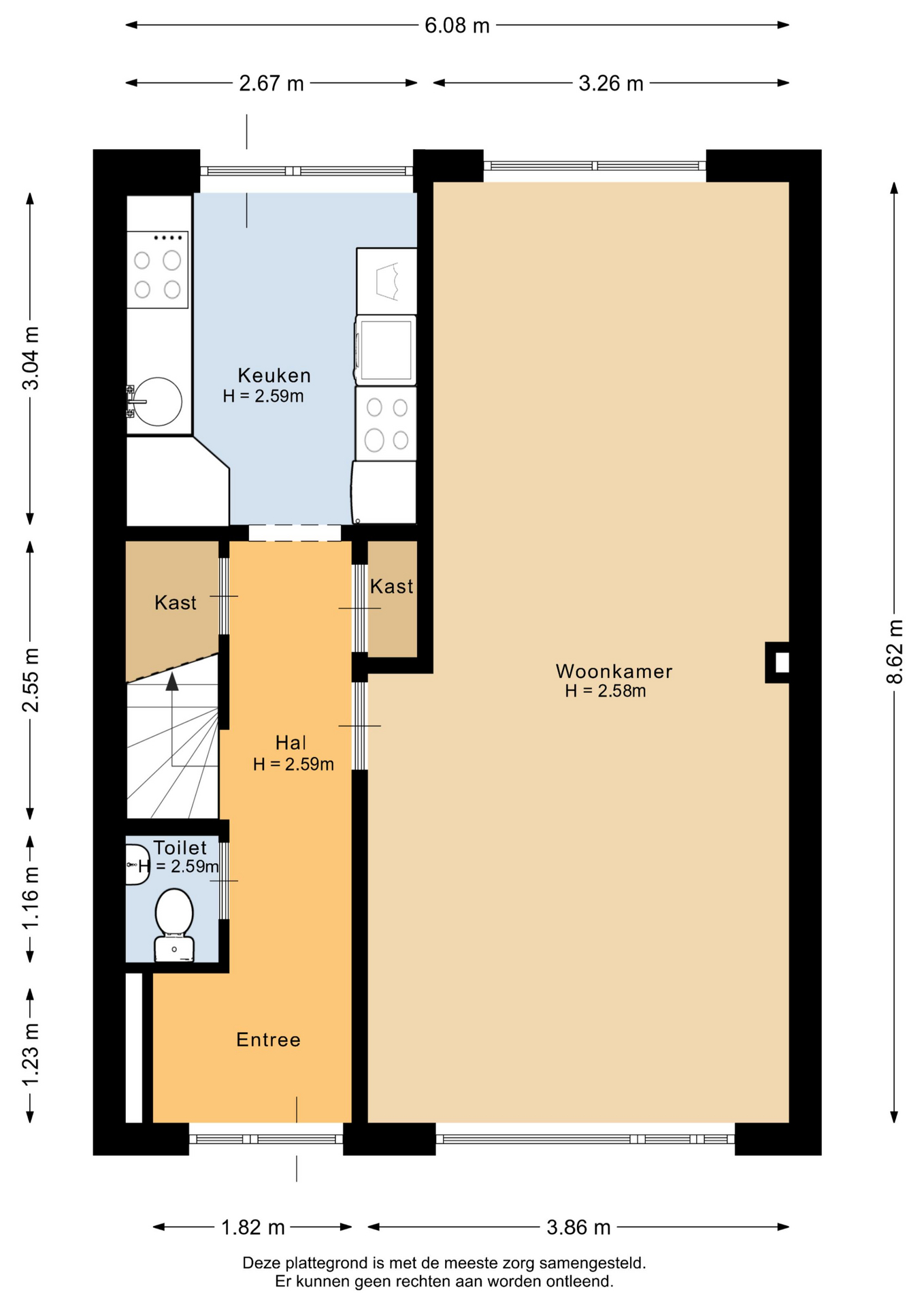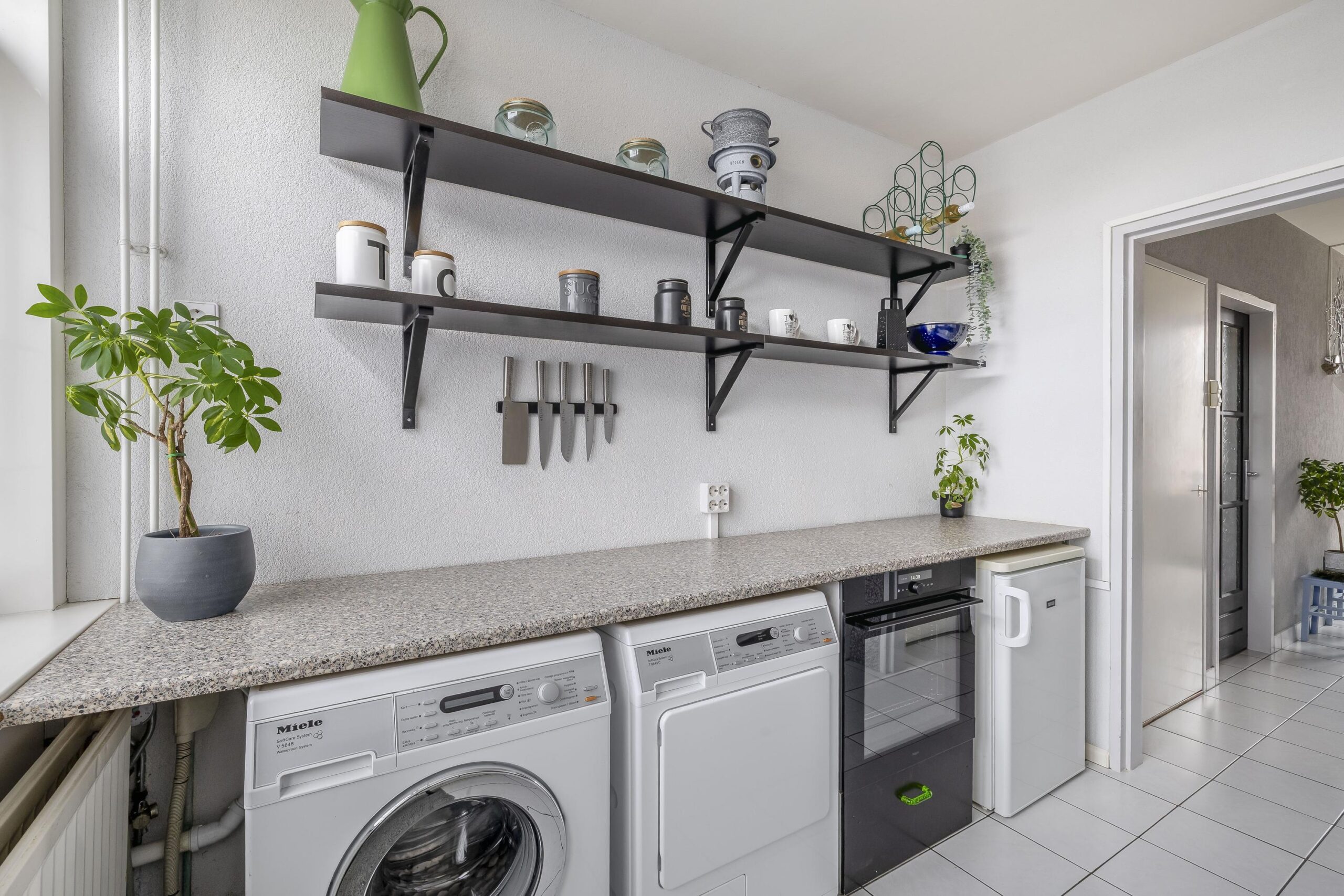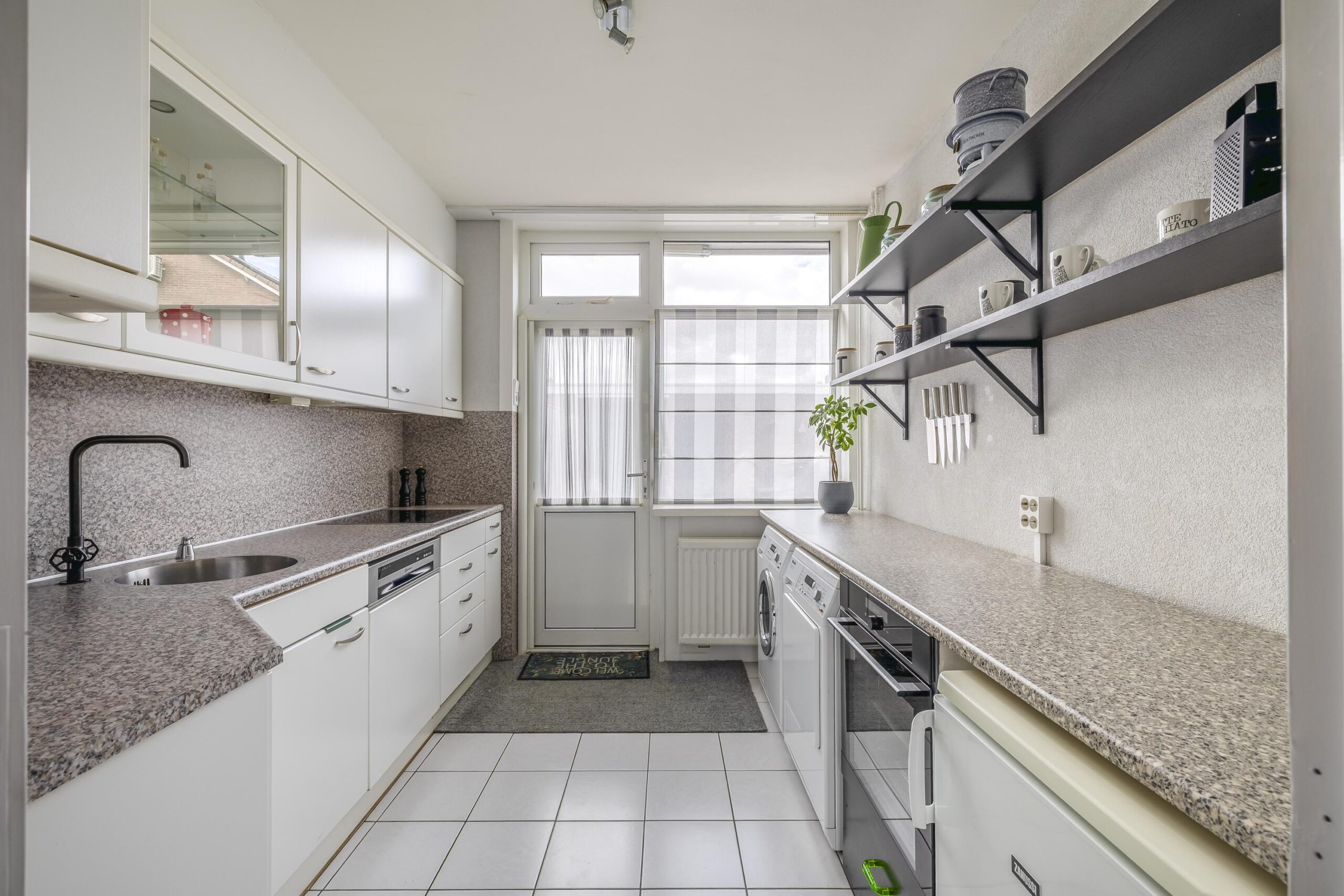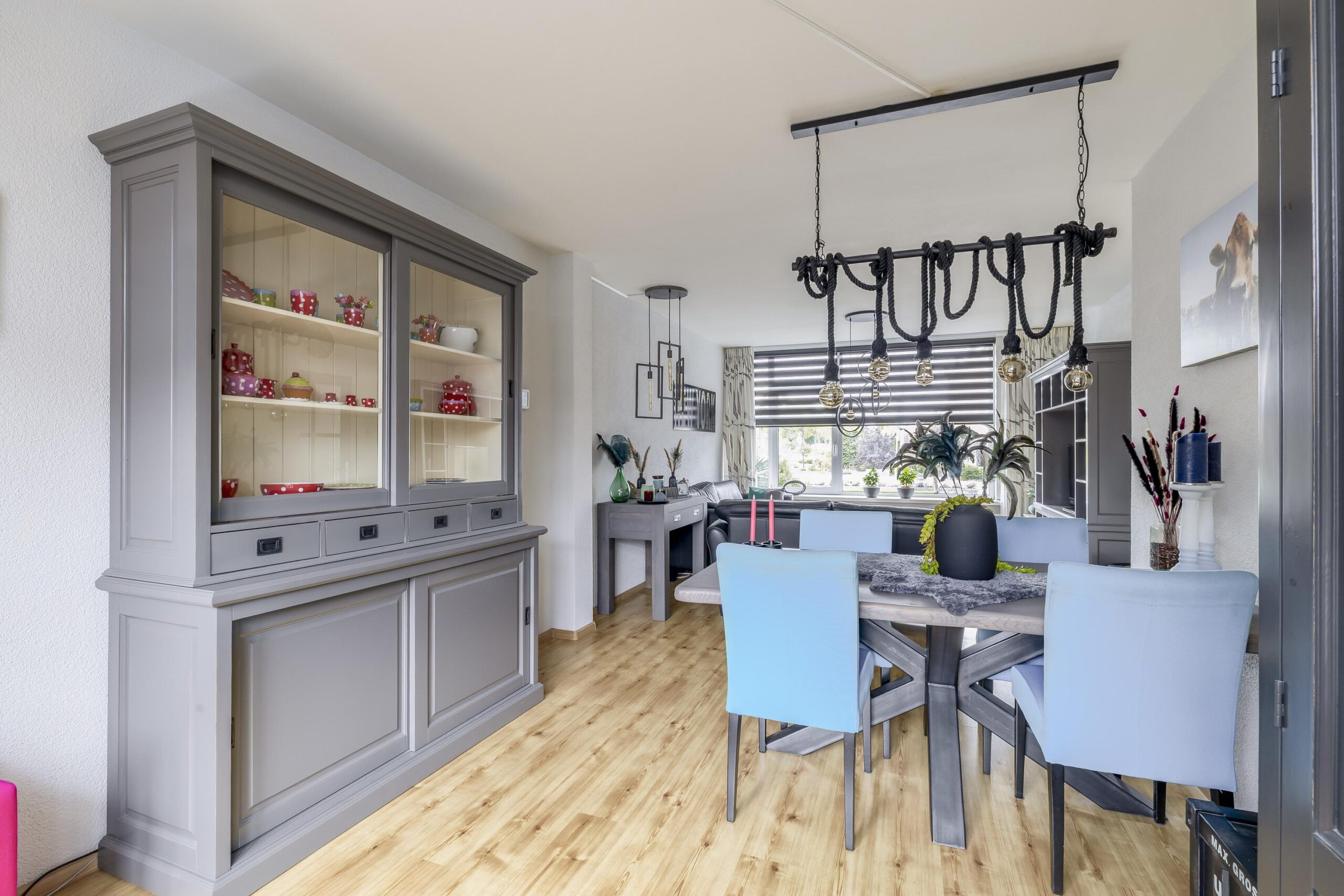 De entreehal, met toilet, trapopgang en twee vaste kasten, geeft toegang tot de woon-/eetkamer en de keuken. De gezellige woon-/eetkamer is voorzien van een laminaatvloer. De grote raampartijen aan de voor- en achterzijde zorgen voor veel natuurlijke lichtinval. Vanuit de entreehal is de keuken bereikbaar. De keuken, met plavuizen vloer, is voorzien van opbergruimte en diverse apparatuur: kookplaat, afzuigkap, vaatwasser en boiler. Tegenover de keuken is een werkblad met daaronder de witgoedaansluitingen. Vanuit de keuken heb je toegang tot de achtertuin.