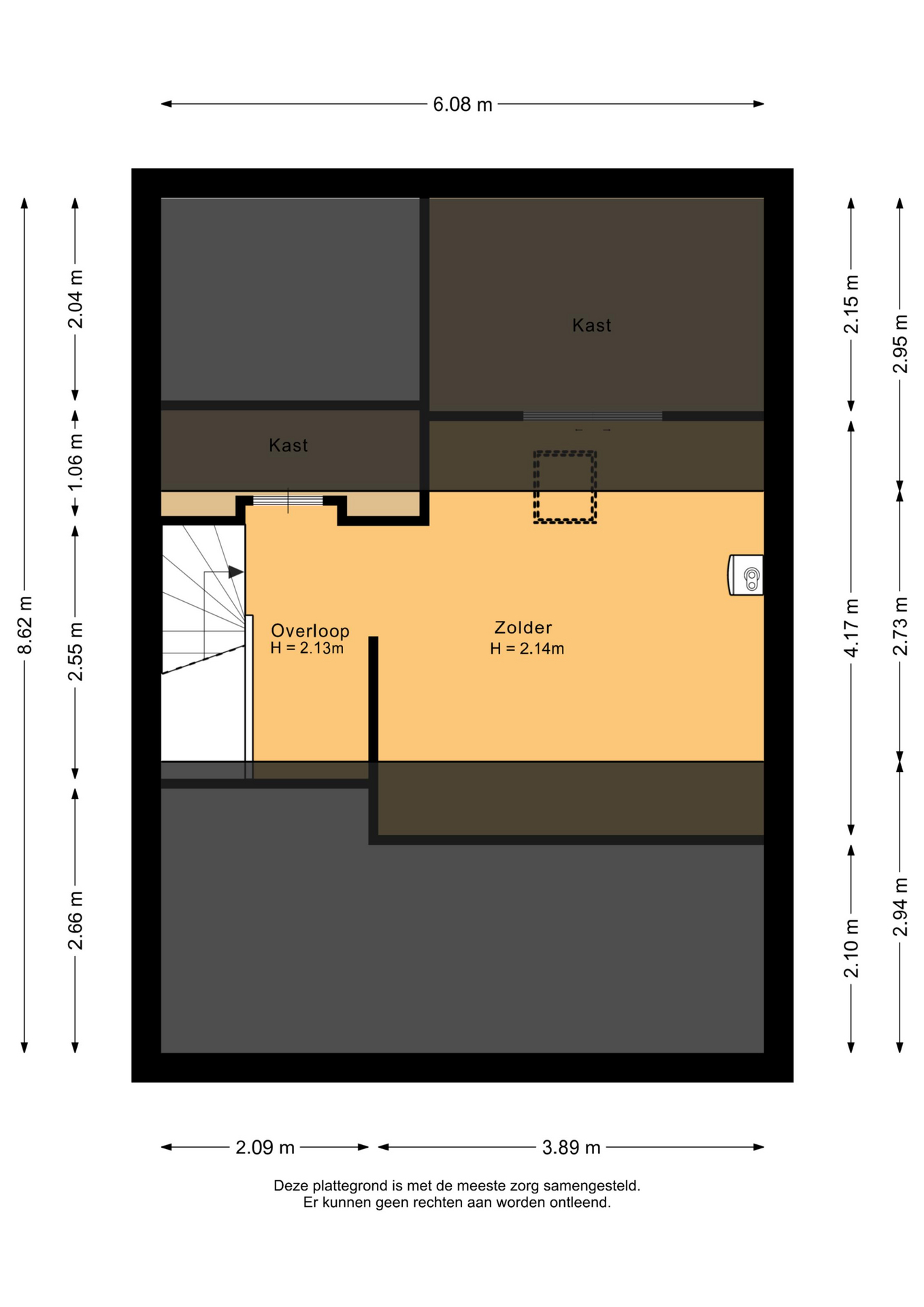De zolder is met een vaste trap bereikbaar. De overloop geeft toegang tot een vaste kast en de zolder. De ruime zolder is voorzien van een dakraam, de CV-ketel en veel kastruimte onder het schuine dak. Het is hier eventueel mogelijk een vijfde slaapkamer te creëren.