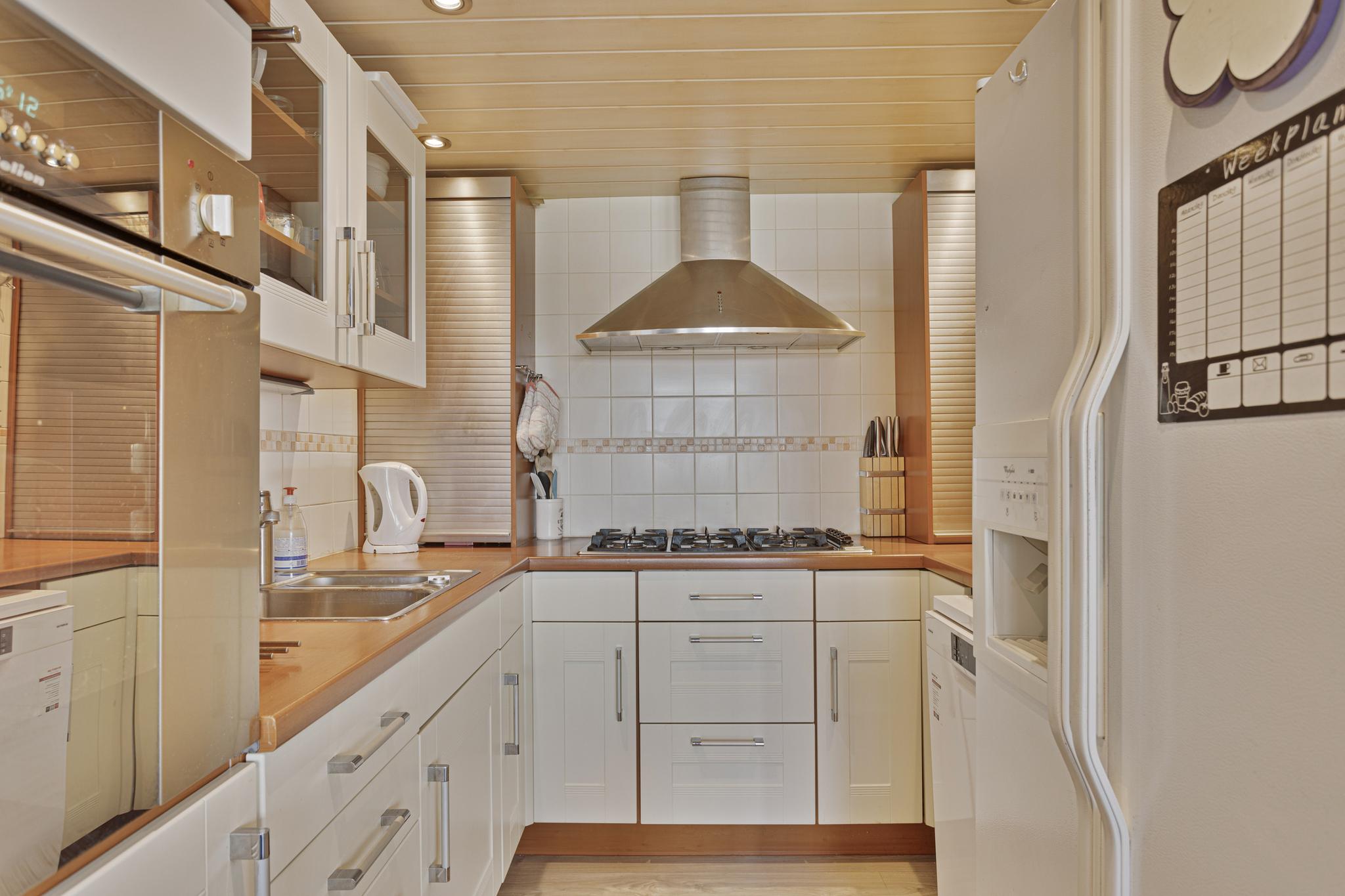 Via een vaste trap in het midden van de begane grond is de eerste verdieping bereikbaar. De overloop, met trapopgang naar de tweede verdieping, geeft toegang tot de woon-/eetkamer, keuken, twee slaapkamers, de badkamer, het toilet en een berging. De woon-/eetkamer is voorzien van een laminaatvloer, inbouwspots en grote raampartijen die voor veel lichtinval zorgen. Vanuit de woon-/eetkamer is de open keuken bereikbaar. De keuken, in U-opstelling, is voorzien van opbergruimte en diverse apparatuur: kookplaat, afzuigkap en oven. Links van de trap is de eerste slaapkamer bereikbaar. De slaapkamer is voorzien van een laminaatvloer. Aan de achterzijde van de woning is de grote slaapkamer gelegen. De slaapkamer is voorzien van twee grote vaste kasten, inbouwspots en een deur naar het dakterras. De geheel betegelde badkamer is voorzien van een ligbad, een wastafel met badmeubel, een designradiator en inbouwspots. Naast de badkamer is het toilet.