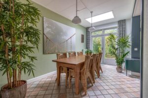 • Ruime eetkamer met houtkachel, lichtkoepel en openslaande deuren naar de tuin.