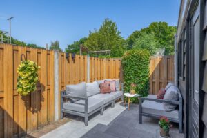 Vanuit de achtertuin, gelegen op het noordwesten, is de aangebouwde stenen berging toegankelijk. De tuin is onderhoudsvriendelijk aangelegd en de afscheiding is gerealiseerd door middel van schuttingdelen en klimplanten. Zie jij jezelf hier al zitten? Genietend van de zon?