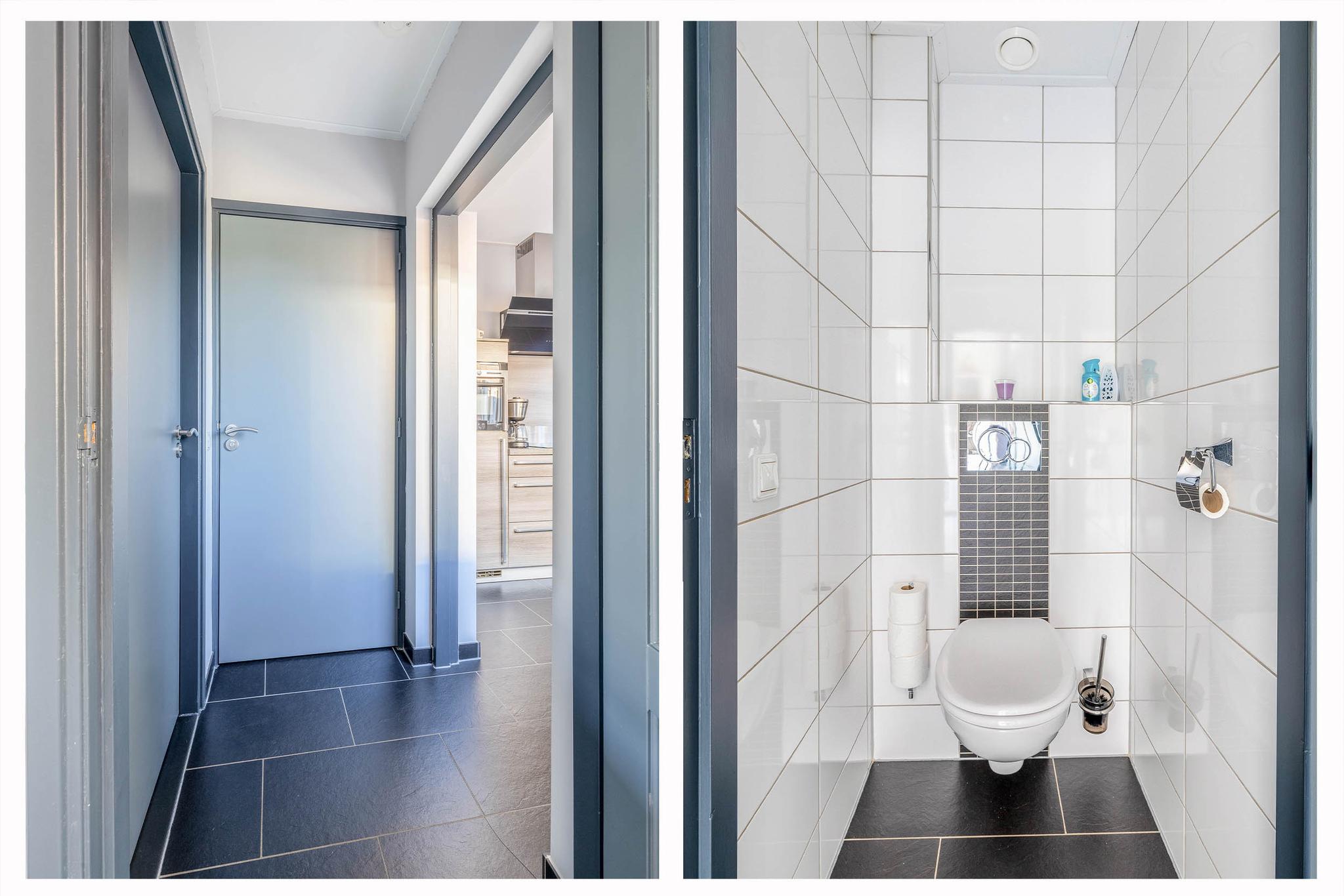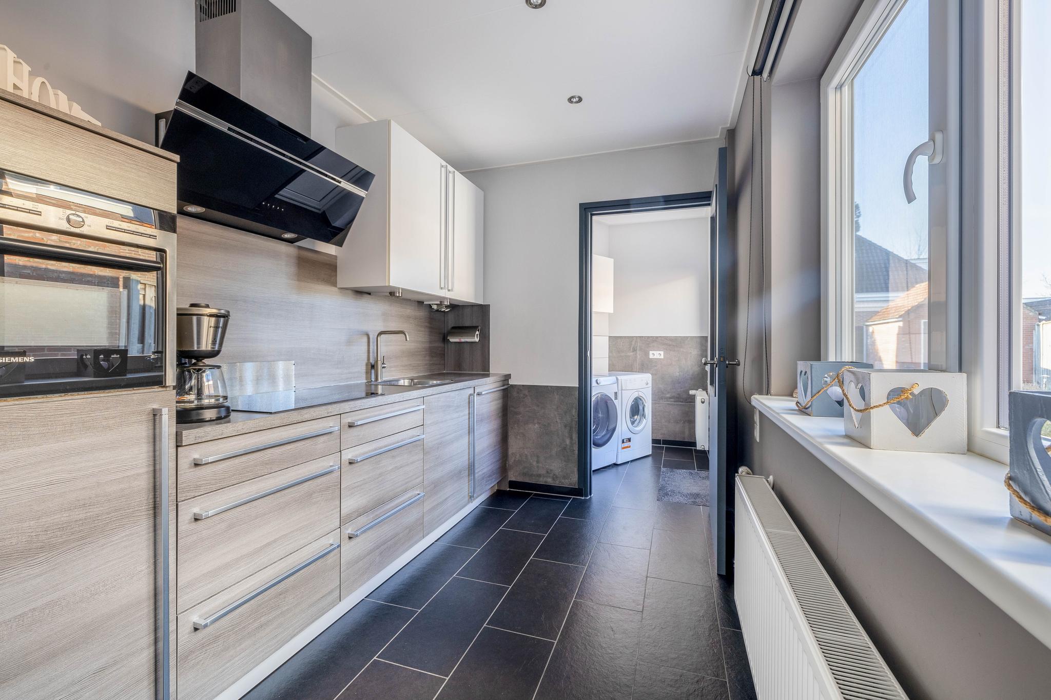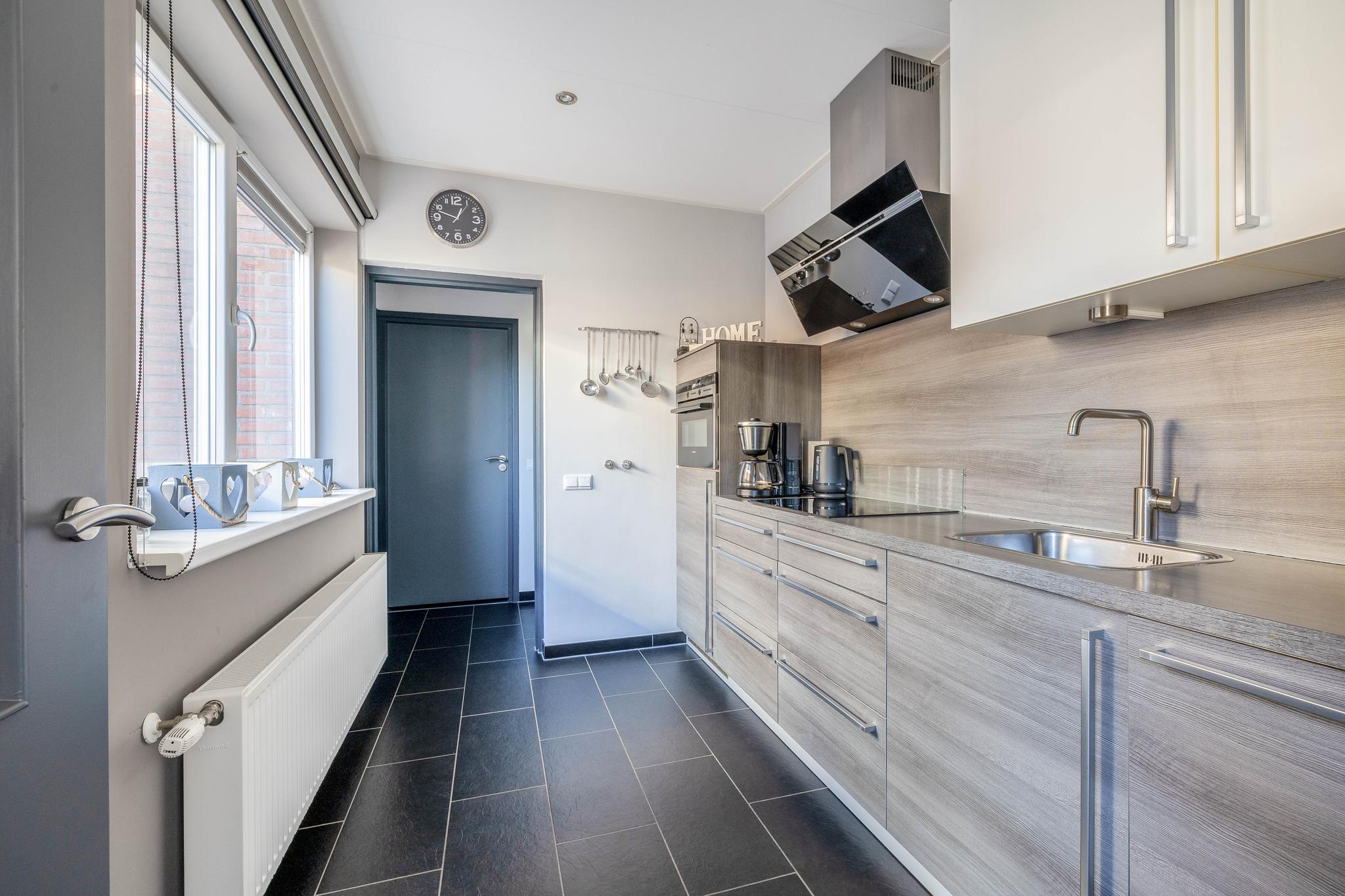 De entreehal, met meterkast en trapopgang, geeft toegang tot de woon-/eetkamer. De woonkamer, aan de voorzijde gelegen, is voorzien van een plavuizen vloer met vloerverwarming. De ramen zorgen voor veel natuurlijke lichtinval. Aan de achterzijde is de eetkamer gesitueerd. Vanuit de eetkamer is een hal bereikbaar. De hal geeft toegang tot de keuken, het toilet en de badkamer. De mooie keuken, met plavuizen vloer en inbouwspots, is voorzien van opbergruimte en diverse apparatuur: kookplaat, afzuigkap, combi-oven, koelkast en vaatwasser. Vanuit de keuken is de achtergelegen bijkeuken bereikbaar. De bijkeuken is voorzien van de witgoedaansluitingen en de deur naar de tuin. De geheel betegelde, moderne badkamer is voorzien van een inloopdouche, een wastafel met wastafelmeubel en een designradiator.