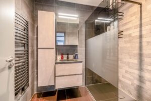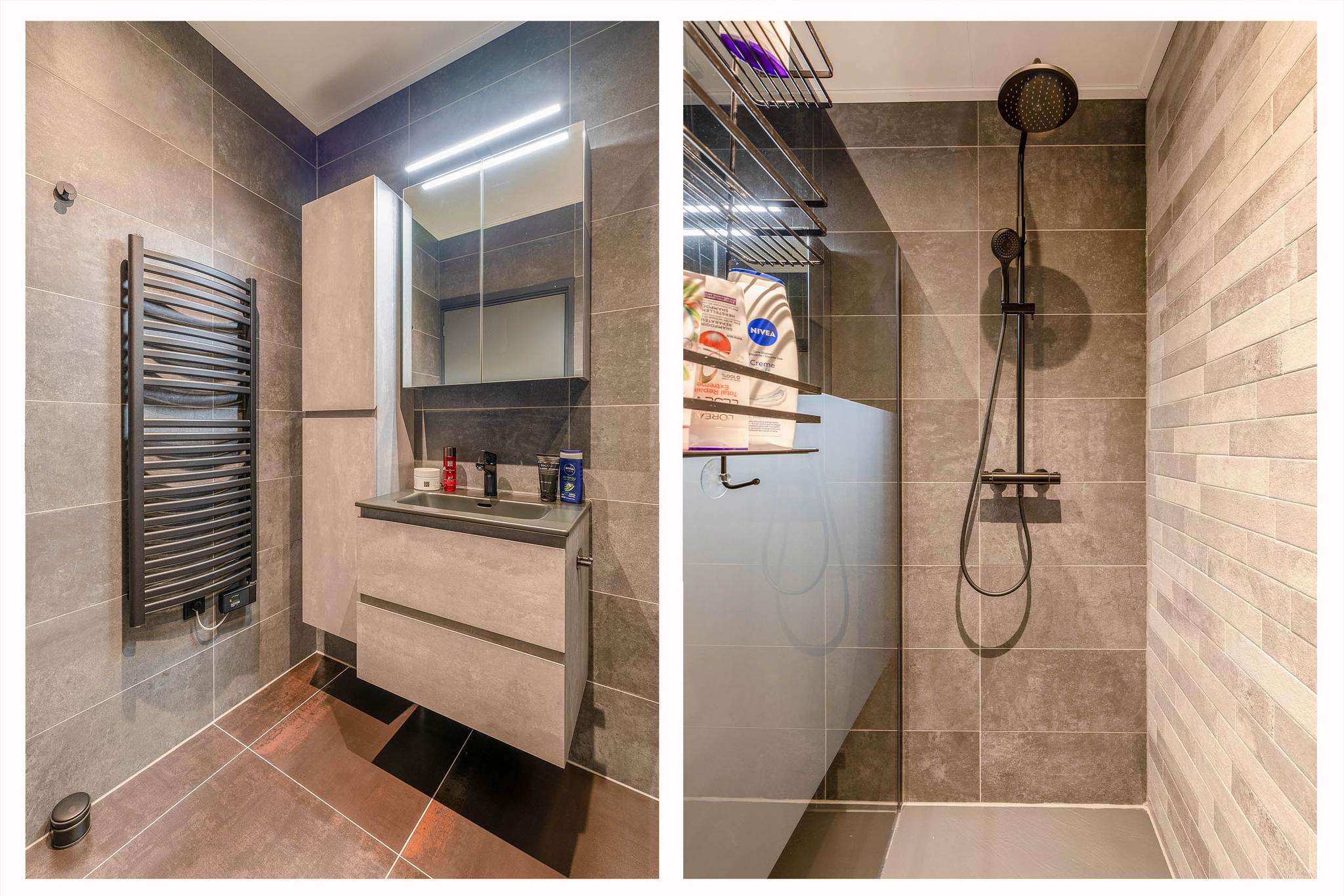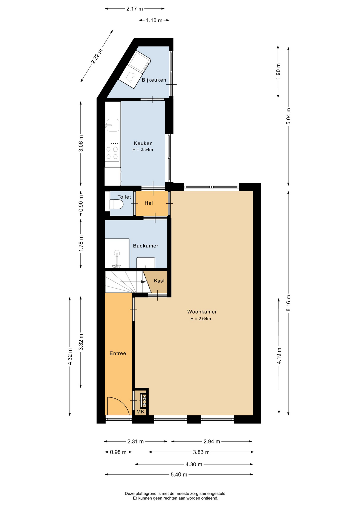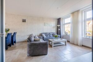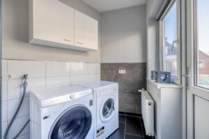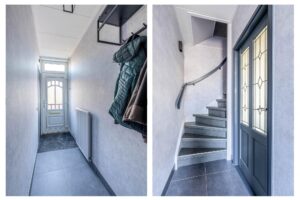 De entreehal, met meterkast en trapopgang, geeft toegang tot de woon-/eetkamer. De woonkamer, aan de voorzijde gelegen, is voorzien van een plavuizen vloer met vloerverwarming. De ramen zorgen voor veel natuurlijke lichtinval. Aan de achterzijde is de eetkamer gesitueerd. Vanuit de eetkamer is een hal bereikbaar. De hal geeft toegang tot de keuken, het toilet en de badkamer. De mooie keuken, met plavuizen vloer en inbouwspots, is voorzien van opbergruimte en diverse apparatuur: kookplaat, afzuigkap, combi-oven, koelkast en vaatwasser. Vanuit de keuken is de achtergelegen bijkeuken bereikbaar. De bijkeuken is voorzien van de witgoedaansluitingen en de deur naar de tuin. De geheel betegelde, moderne badkamer is voorzien van een inloopdouche, een wastafel met wastafelmeubel en een designradiator.