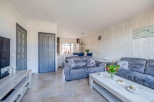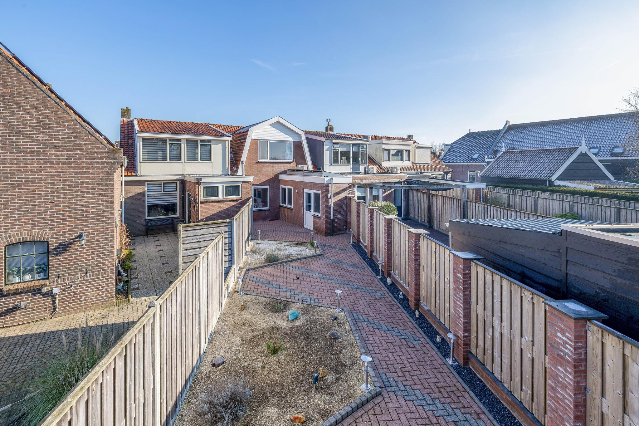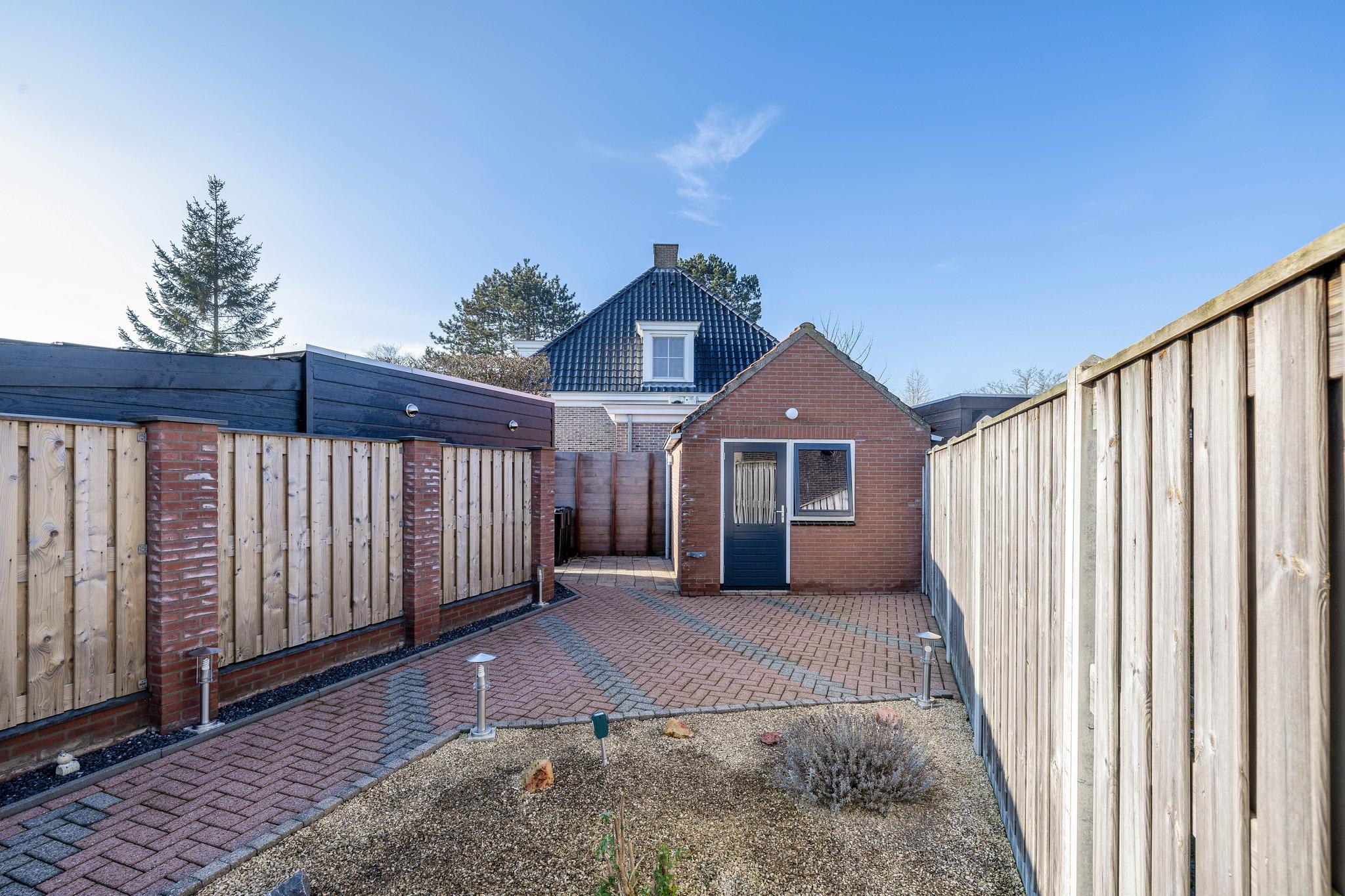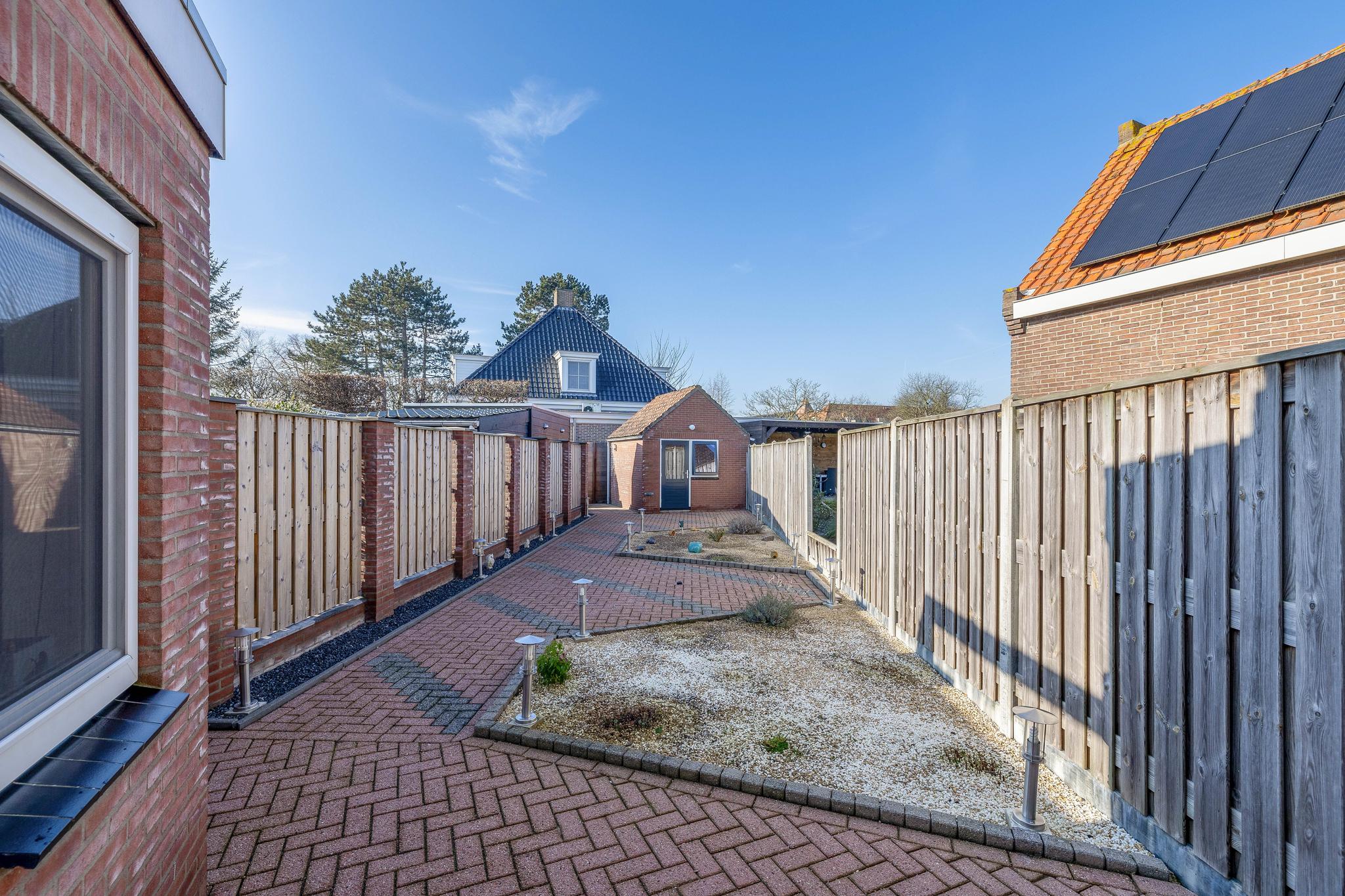 De diepe achtertuin, gelegen op het westen, is voorzien van bestrating en siergrind en daardoor onderhoudsarm. Het is hier heerlijk vertoeven. De schutting rondom zorgt voor voldoende privacy. Achter in de tuin staat de stenen berging.
