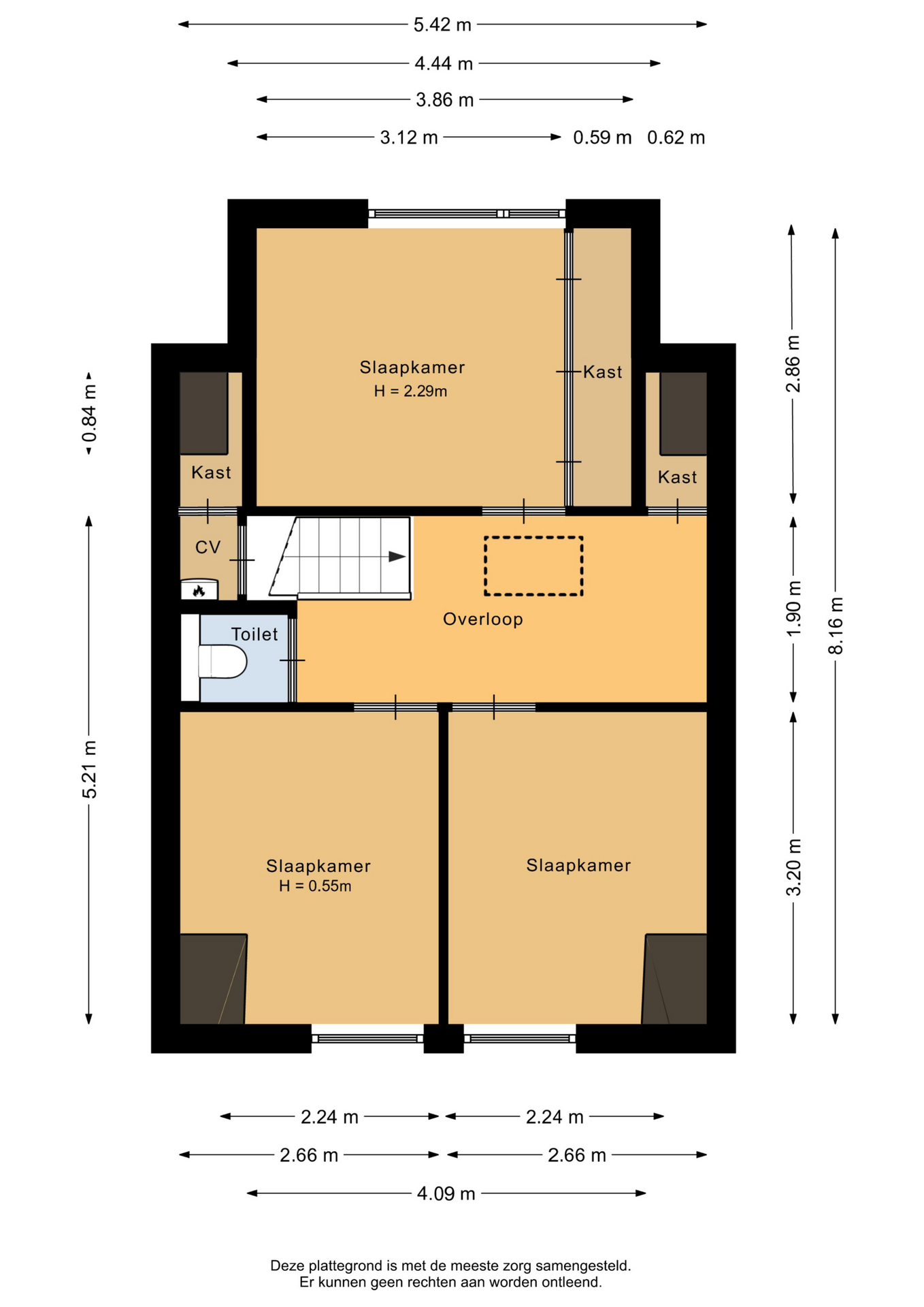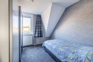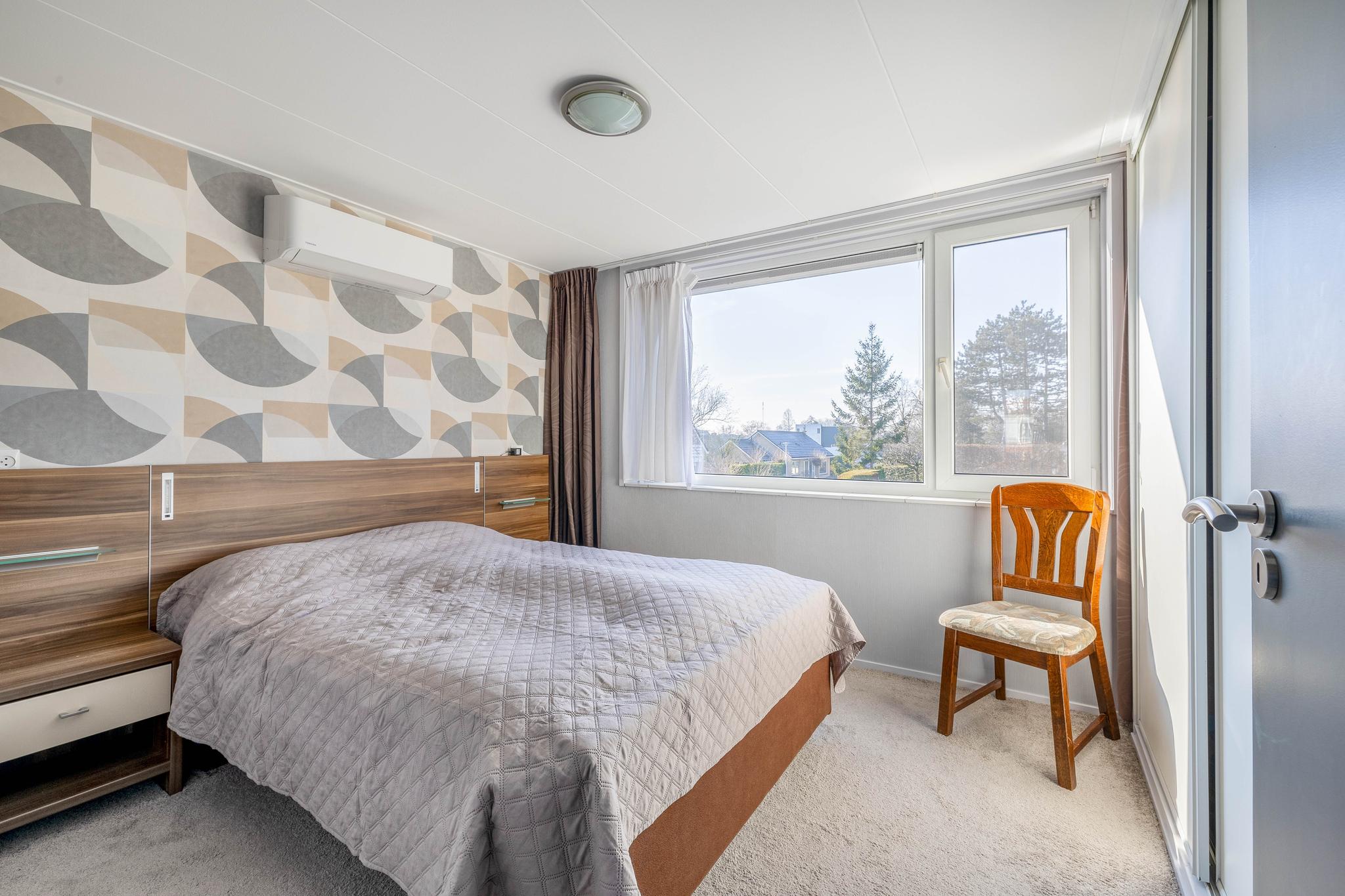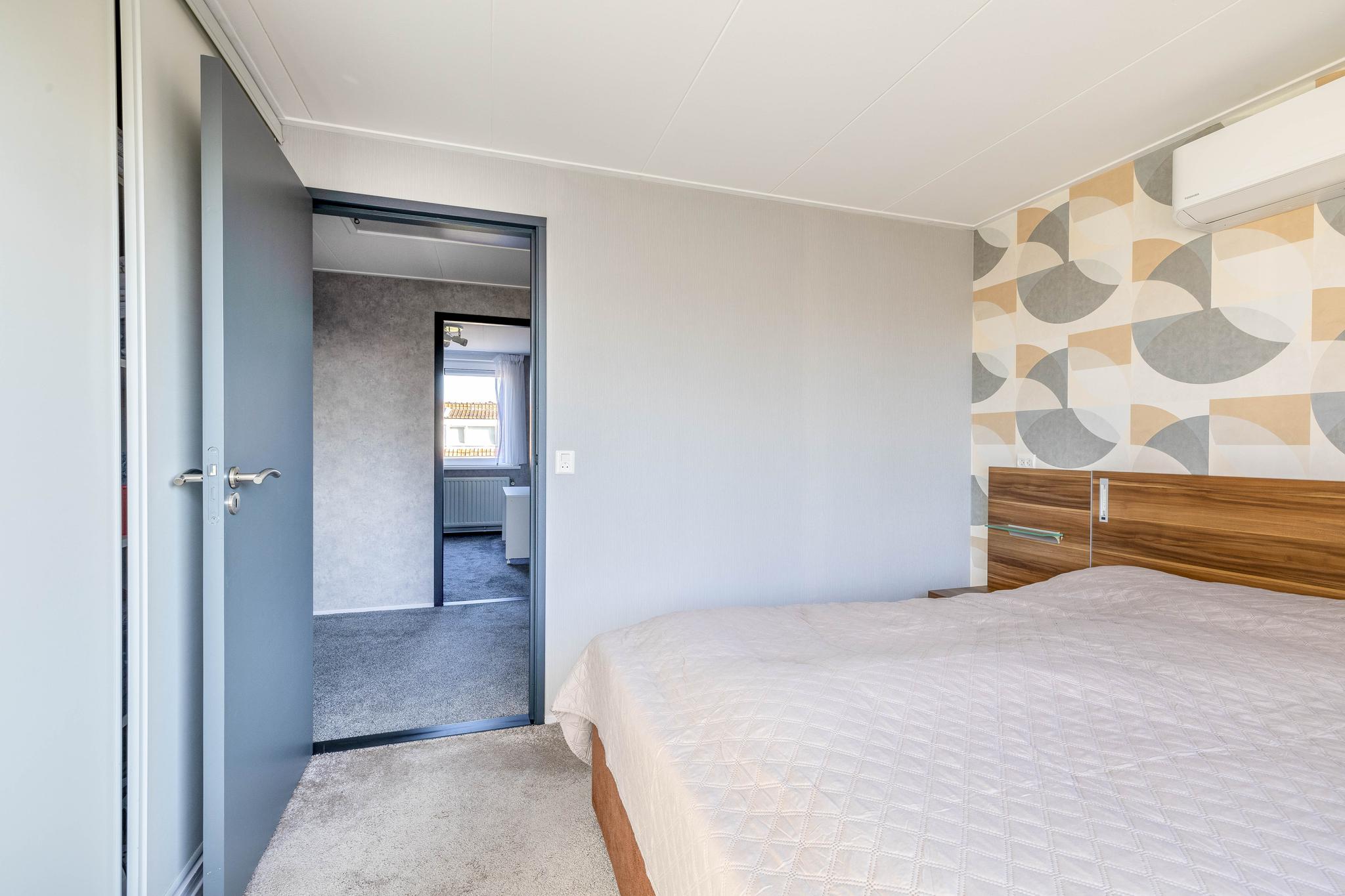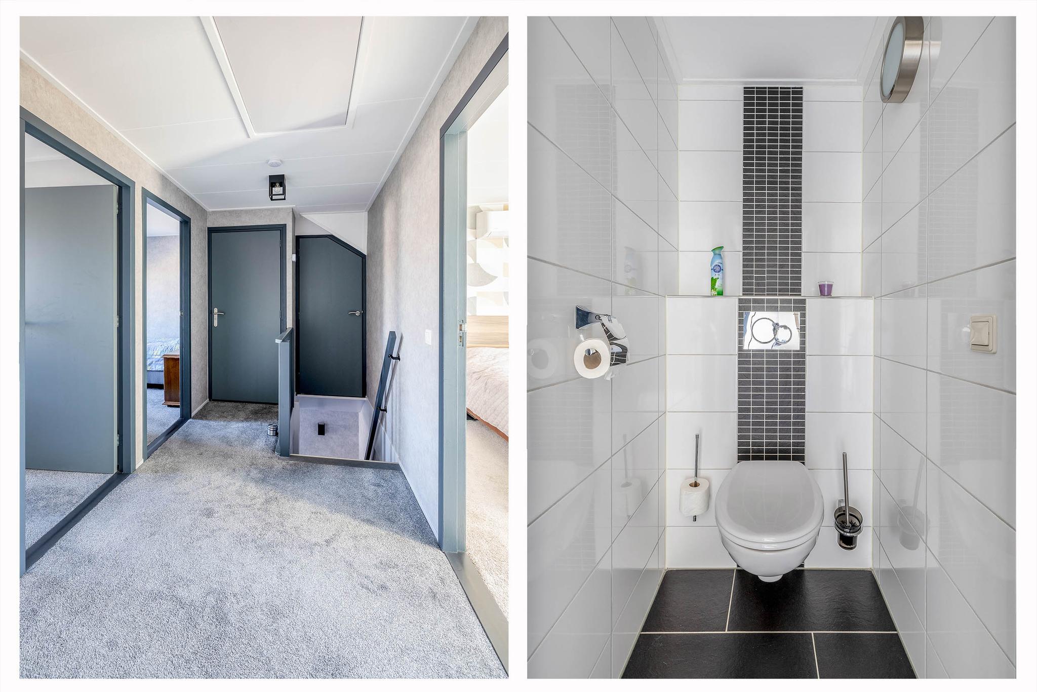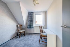 De ruime overloop, met toilet, een vaste kast en een berging met daarin de CV-ketel, geeft toegang tot de drie slaapkamers. De slaapkamers zijn voorzien van vloerbedekking. De ramen zorgen voor veel lichtinval. De slaapkamer aan de achterzijde is voorzien van een airco en een grote, vaste kast.