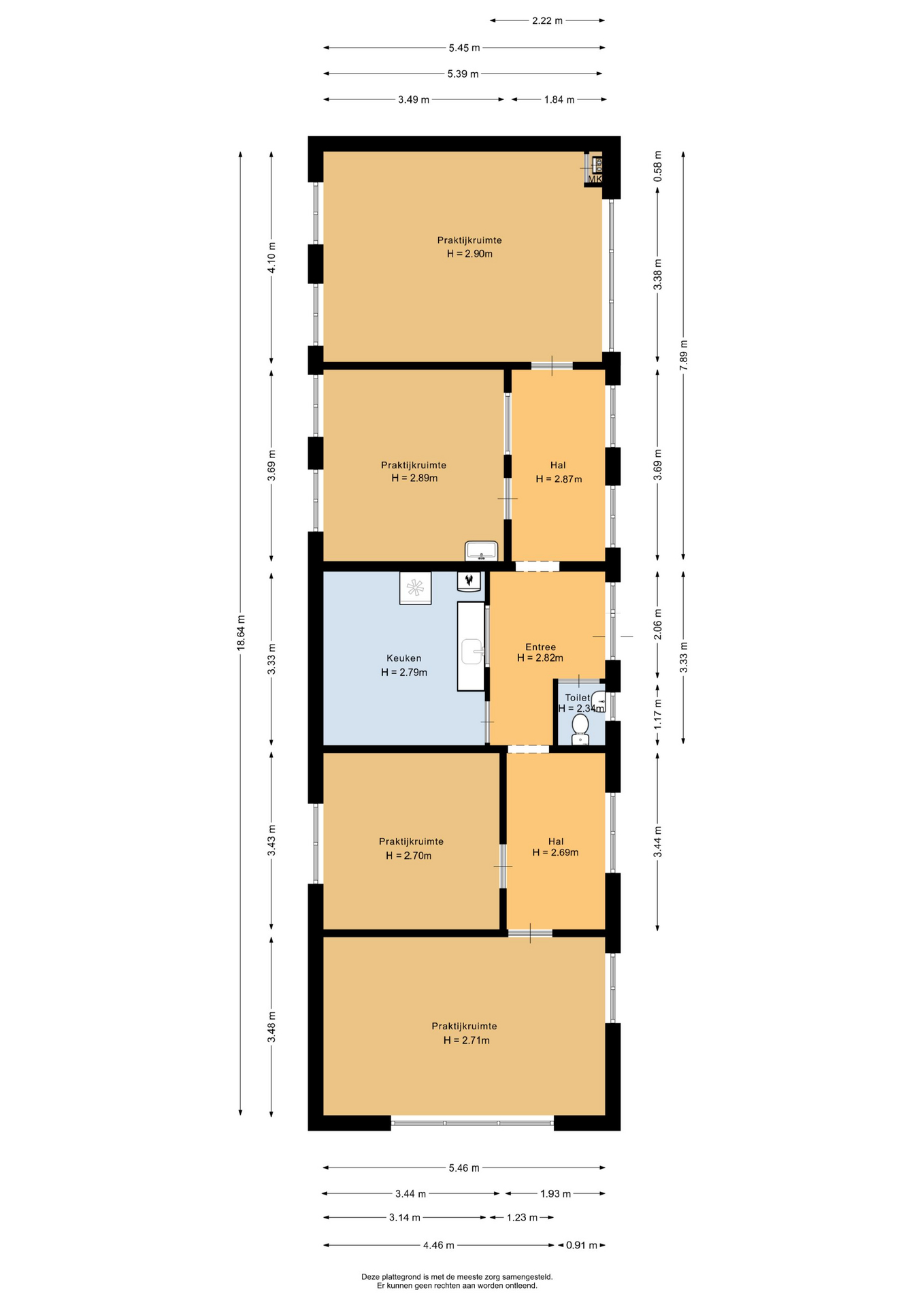 De entreehal geeft toegang tot de keuken, het toilet en aan beide zijden een hal. Beide hallen geven toegang tot twee praktijkruimtes. Deel zelf de royale ruimtes in.