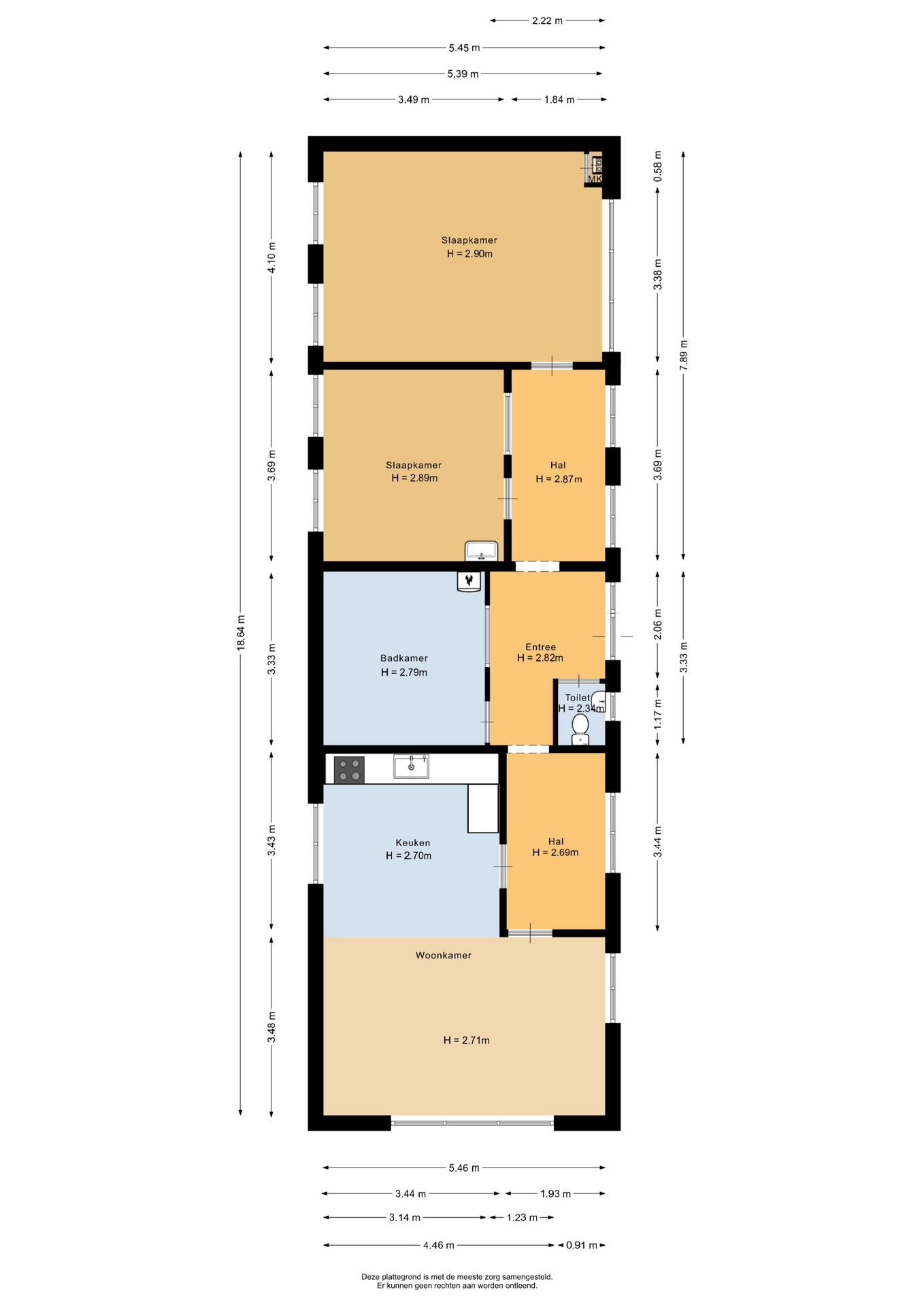 De entreehal geeft toegang tot de badkamer, het toilet en aan beide zijden een hal. De linker hal geeft toegang tot de woon-/eetkamer en de keuken. De grote raampartijen aan de voorzijde zorgen voor veel natuurlijke lichtinval. Er is ruimte voor een rechte keuken, een hoekkeuken of een eiland. De tweede hal geeft toegang tot de twee slaapkamers. De slaapkamer aan de achterzijde heeft grote raampartijen die voor veel lichtinval zorgen. De badkamer kan naar eigen wens ingericht worden.