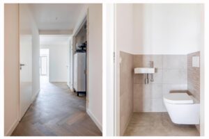 Vanuit de centrale hal is het appartement via de lift of het trappenhuis toegankelijk.