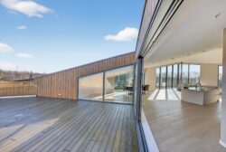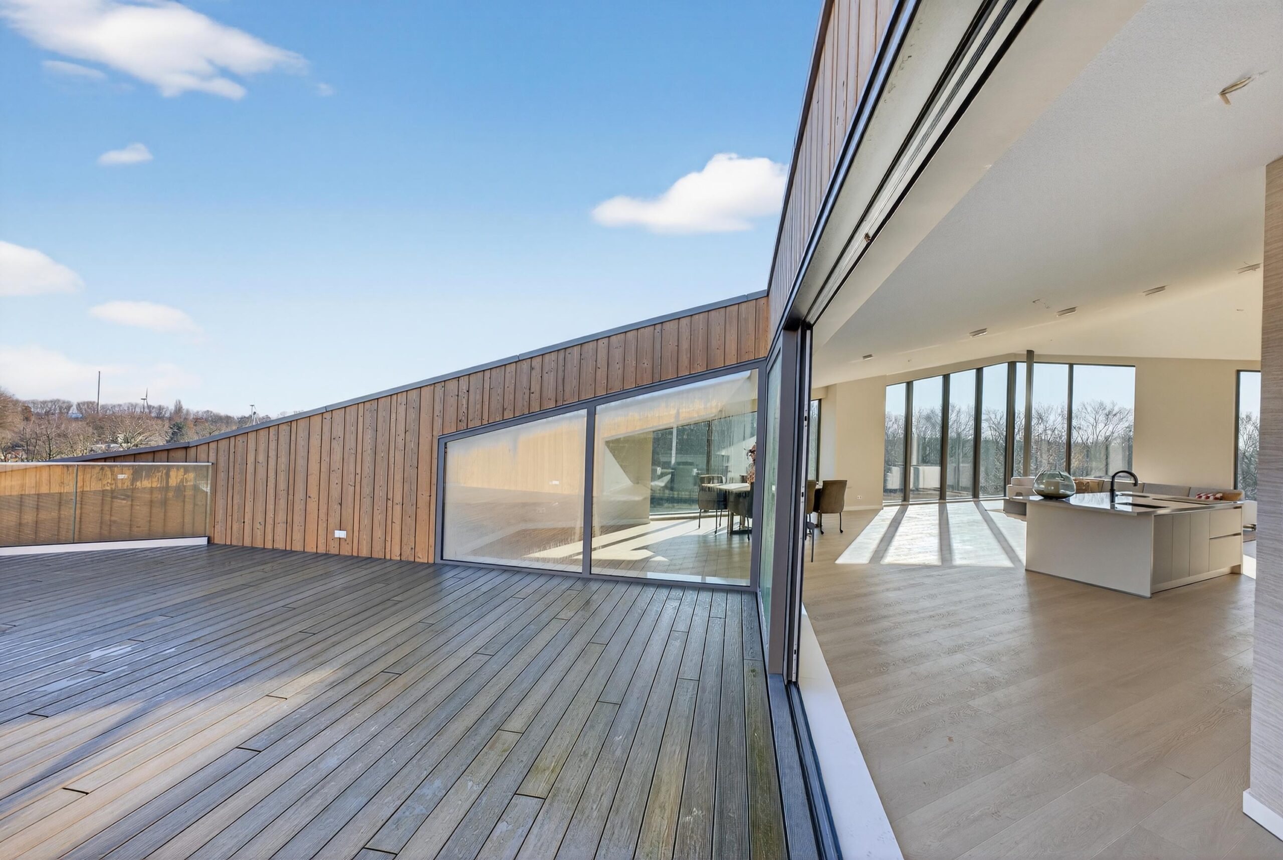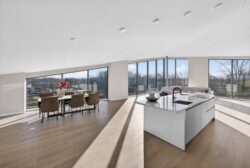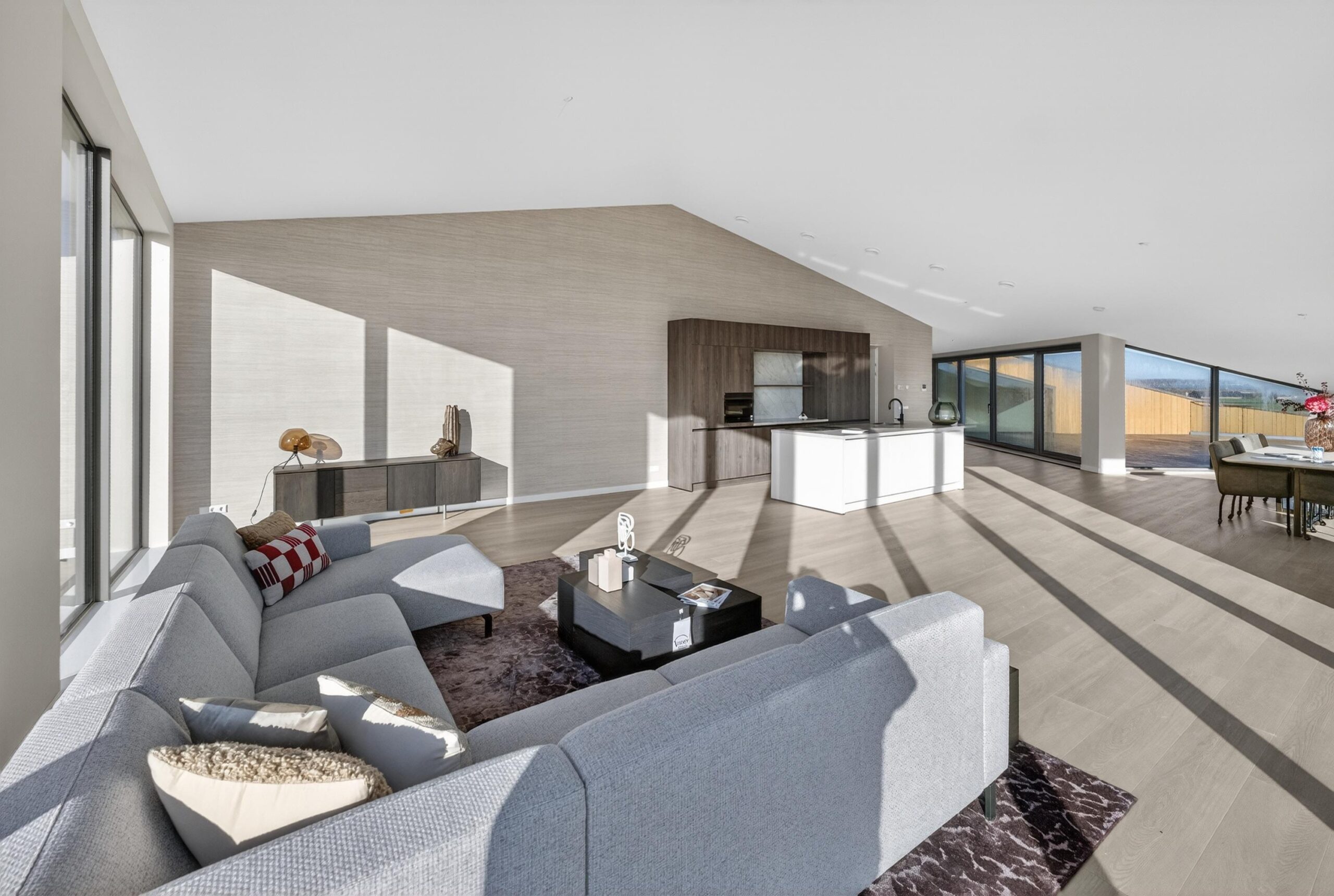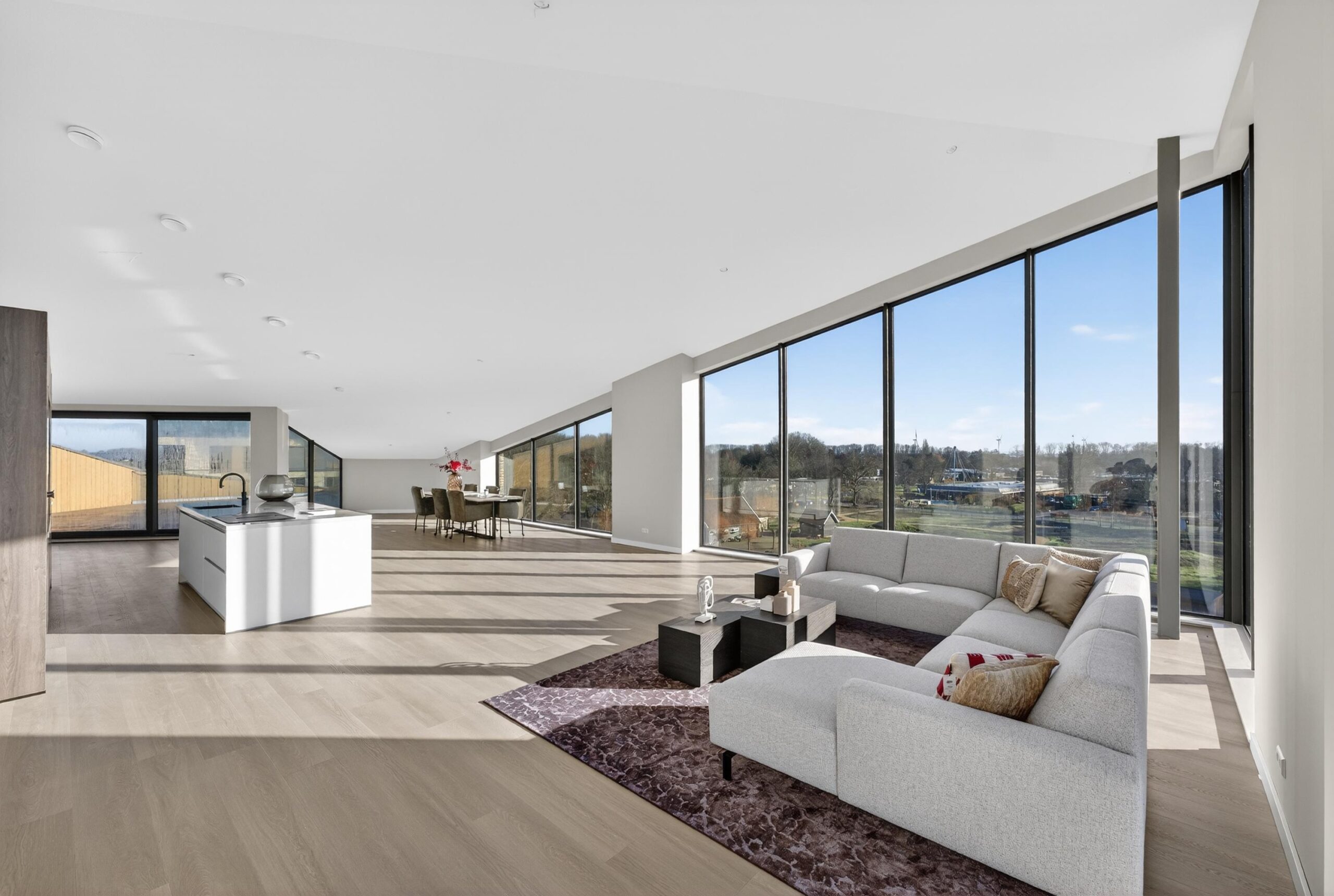 De woon- en eetkamer van circa 110 m² vormt het hart van het penthouse. Grote raampartijen zorgen voor een prachtige lichtinval en een ruimtelijk gevoel. Via de dubbele schuifpui bereikt u het eerste terras, waardoor binnen en buiten naadloos in elkaar overlopen.