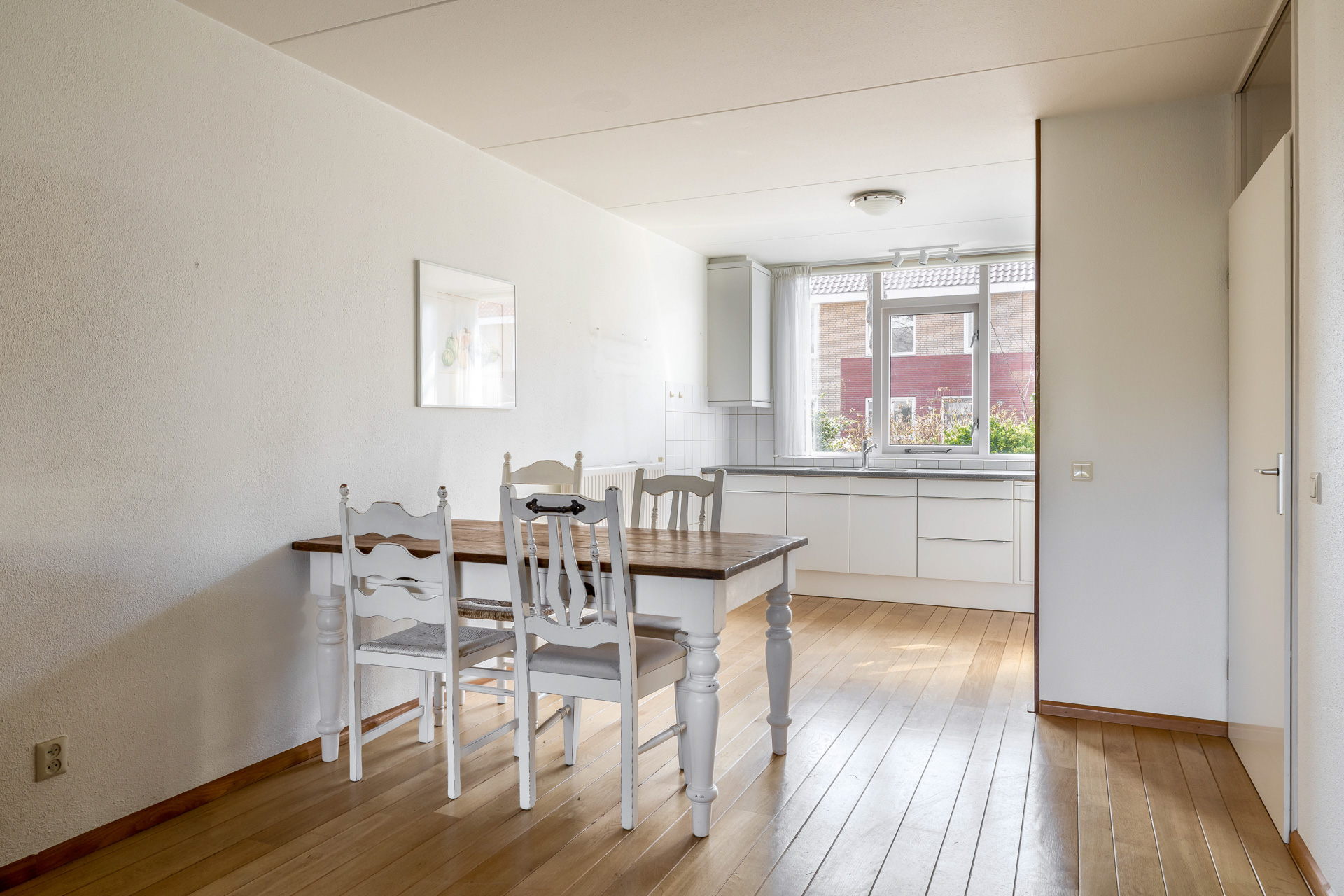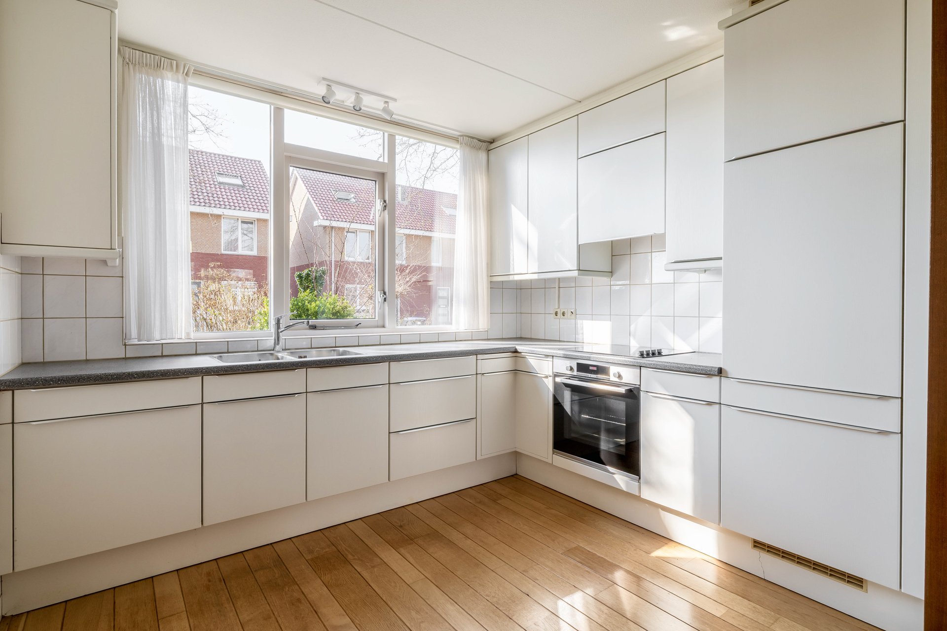 De open keuken aan de voorzijde van de woning biedt volop mogelijkheden om een sfeervolle woonkeuken te realiseren. De keuken is voorzien van diverse inbouwapparatuur en vormt een gezellige plek in huis.