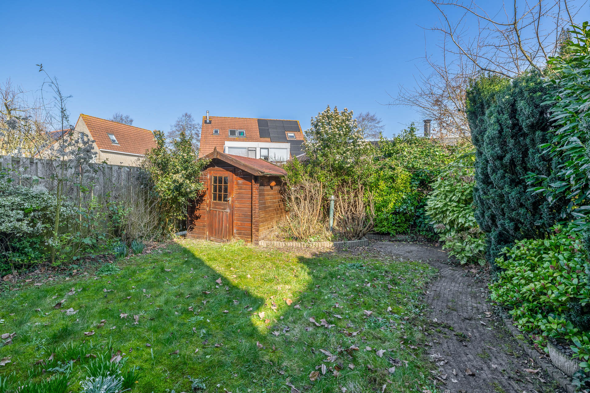 De ruime en praktische achtertuin ligt op het noordoosten en biedt een heerlijke plek om de dag te beginnen met de ochtendzon. Een fijne buitenruimte waar u in alle rust kunt genieten van uw koffie, een goed boek of een ontspannen moment in de frisse buitenlucht. Achter in de tuin bevindt zich een praktische berging, ideaal voor het opbergen van tuinmeubilair, gereedschap en andere benodigdheden.