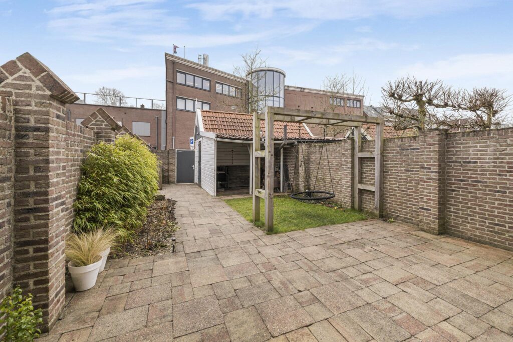 De achtertuin, gelegen op het zuiden, is voorzien van bestrating, gazon en een border met planten. De muur rondom zorgt voor veel privacy. Het is hier heerlijk vertoeven. Achter in de tuin staat de berging met overkapping. Links van de berging is een poort die toegang geeft tot de achtergelegen straat waar ook parkeergelegenheid is.
