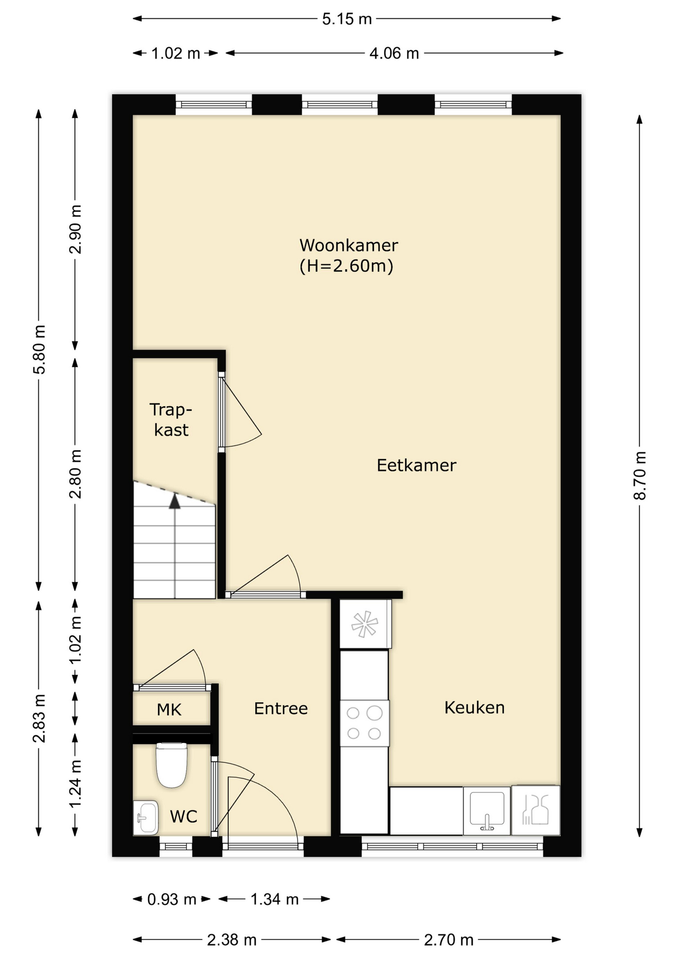 De entreehal, met toilet, meterkast en trapopgang, geeft toegang tot de woon-/eetkamer en de keuken. De woonkamer, aan de achterzijde gelegen, is voorzien van een PVC vloer met vloerverwarming. In het verlengde van de woonkamer is de eethoek, met trapkast, gesitueerd. Hier vandaan loopt u verder naar de open keuken. De hoekkeuken is voorzien van veel opbergruimte en diverse apparatuur: kookplaat, afzuigkap, magnetron, oven, koel-/vriescombinatie en vaatwasser.