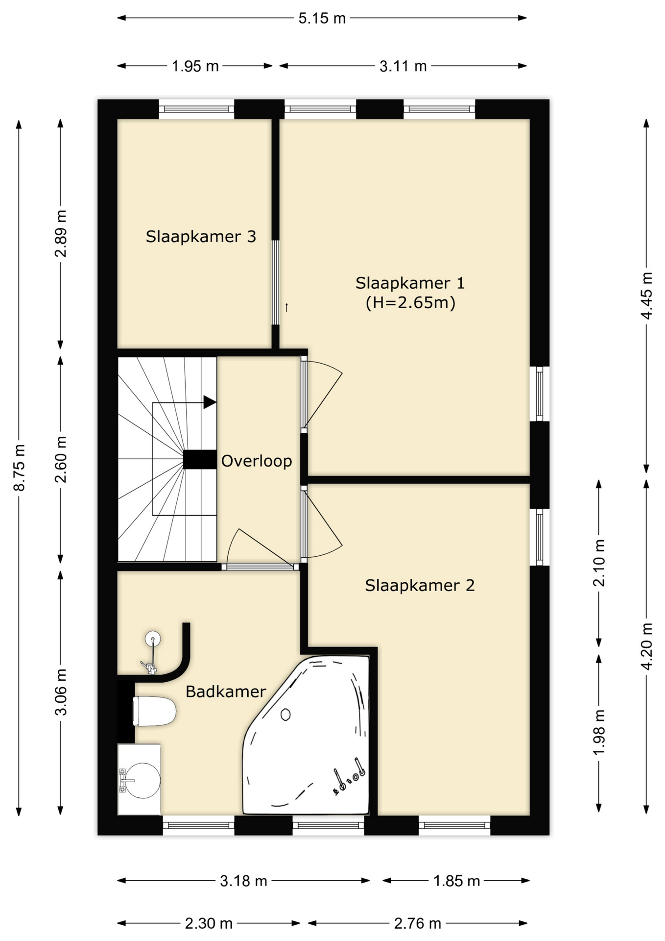 De ruime overloop geeft toegang tot drie slaapkamers en de badkamer. De slaapkamers zijn voorzien van een laminaatvloer. De derde slaapkamer is via een schuifdeur bereikbaar vanuit de slaapkamer rechts achter. De kamer is ook geschikt als inloopkast of kantoor. De geheel betegelde, ruime badkamer is voorzien van een ligbad, een inloopdouche, een wastafel, een toilet en een designradiator.