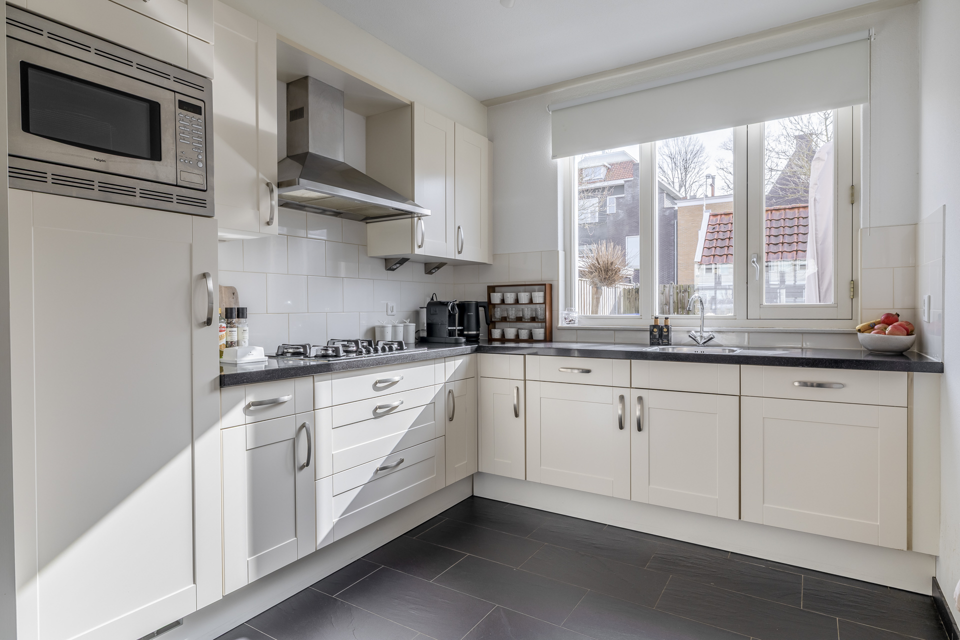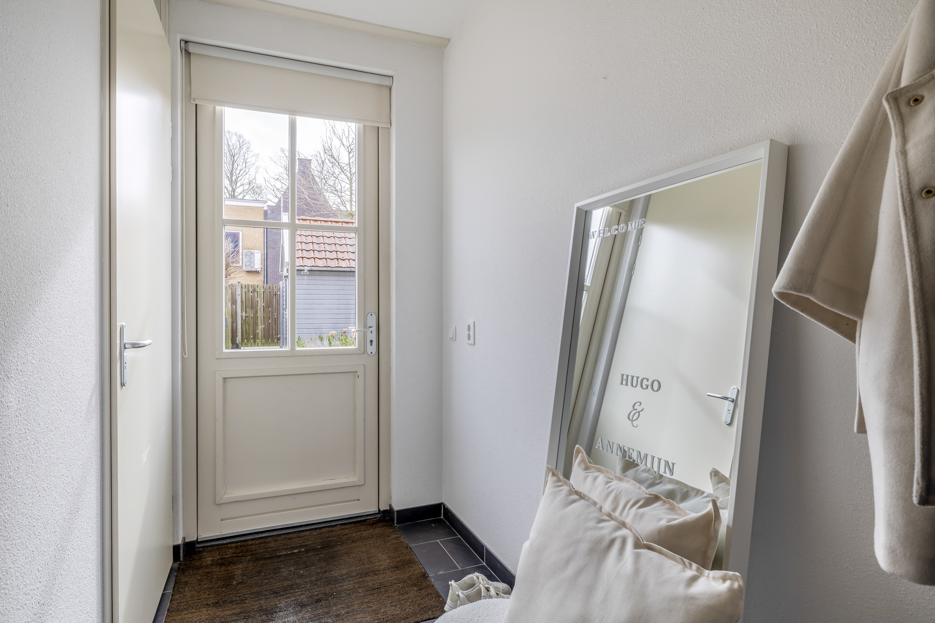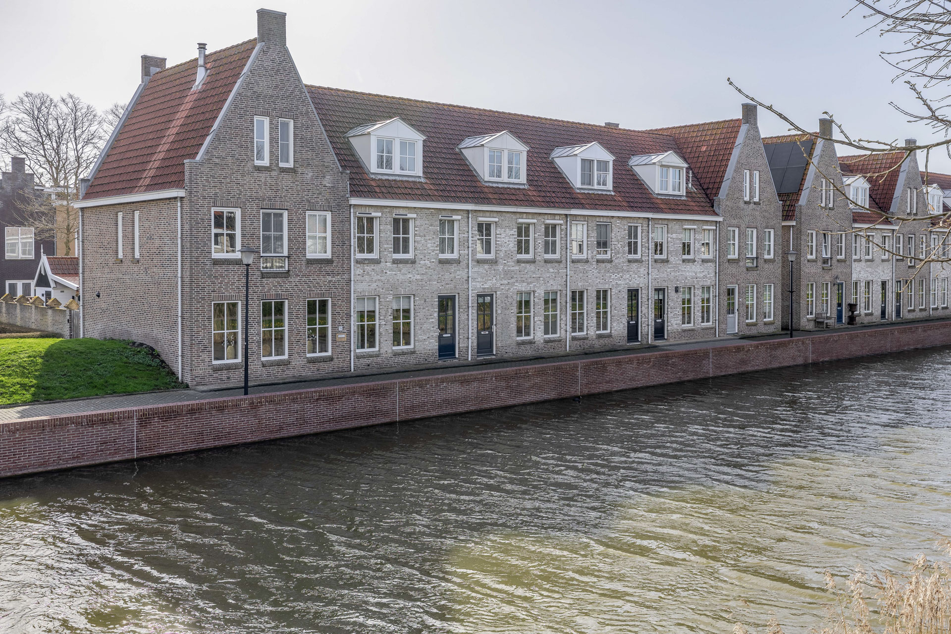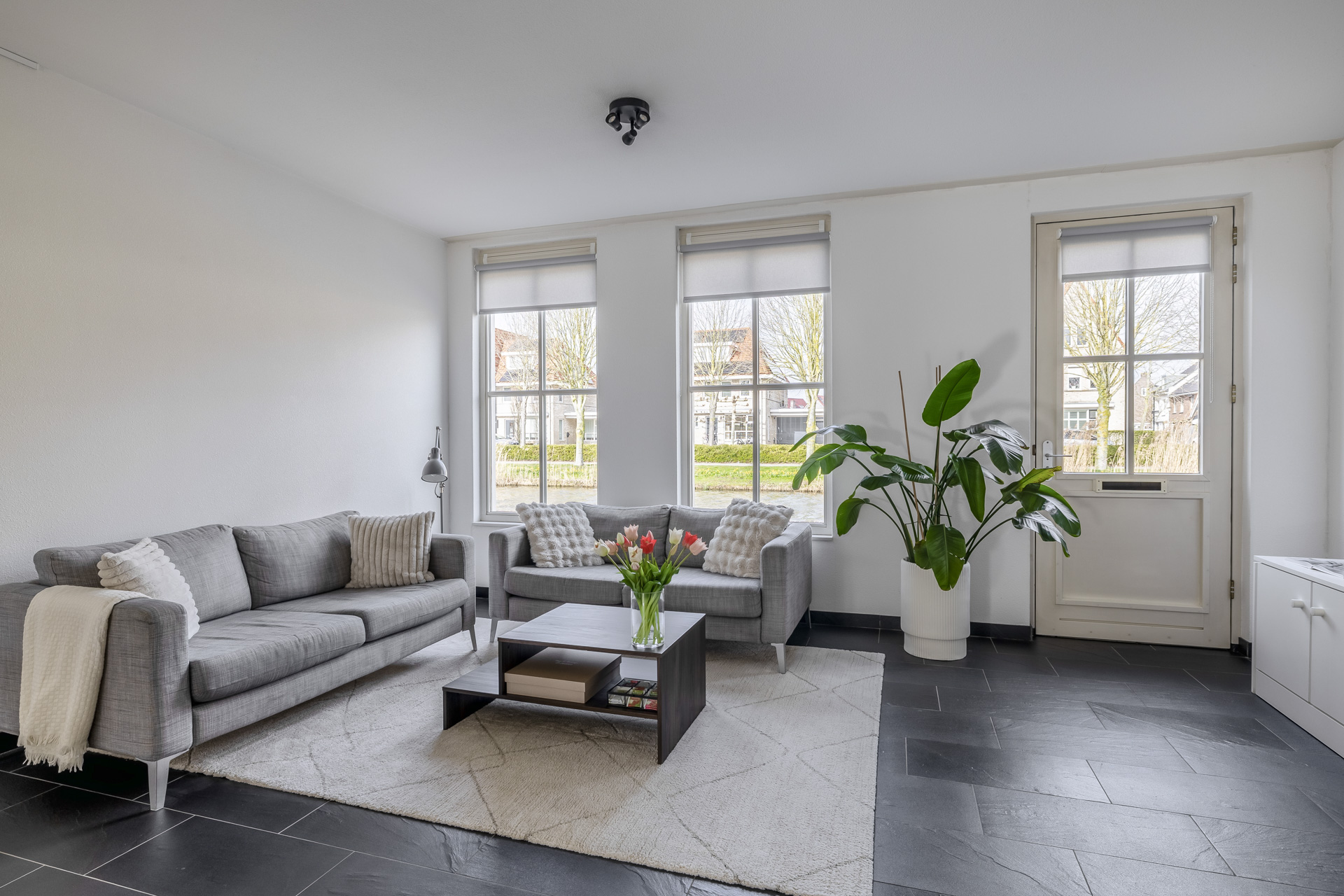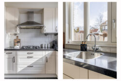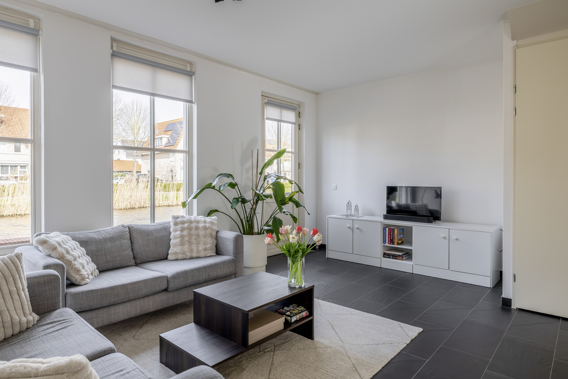 Vanwege de situering aan het water, waar zich de officiële voordeur bevindt en directe toegang tot de woonkamer is, bevindt de praktische entree zich aan de achterzijde van de woning. Hier kom je binnen in de hal met toegang tot het toilet, de meterkast en de trapopgang. Vanuit hier stap je de lichte woonkamer binnen, waar het uitzicht op het water direct in het oog springt. Een fijne leefruimte met een prettige lichtinval en een open, uitnodigende sfeer. De open keuken aan de achterzijde is praktisch ingericht en sluit naadloos aan op de woonkamer, ideaal voor dagelijks gebruik en gezellige momenten met familie en vrienden. De begane grond is daarnaast voorzien van comfortabele vloerverwarming, wat zorgt voor extra wooncomfort.