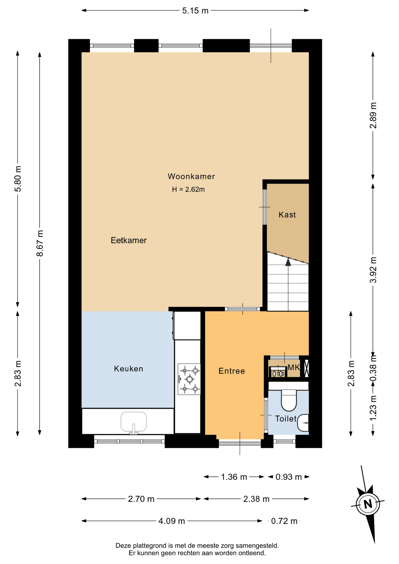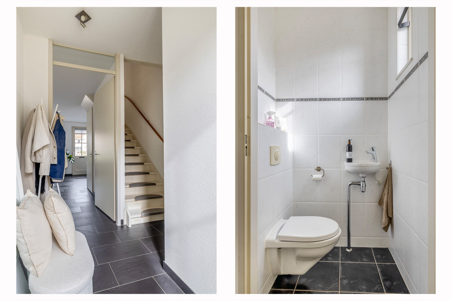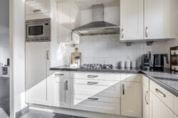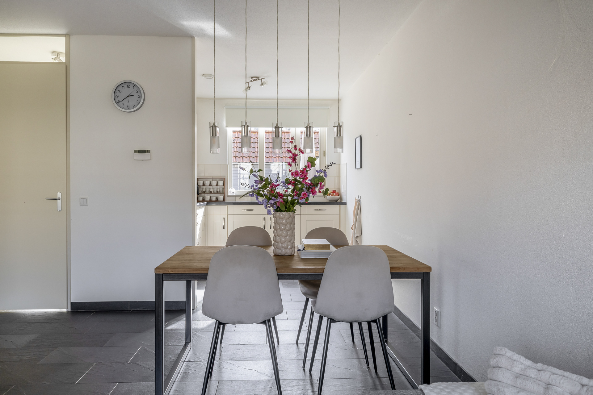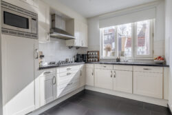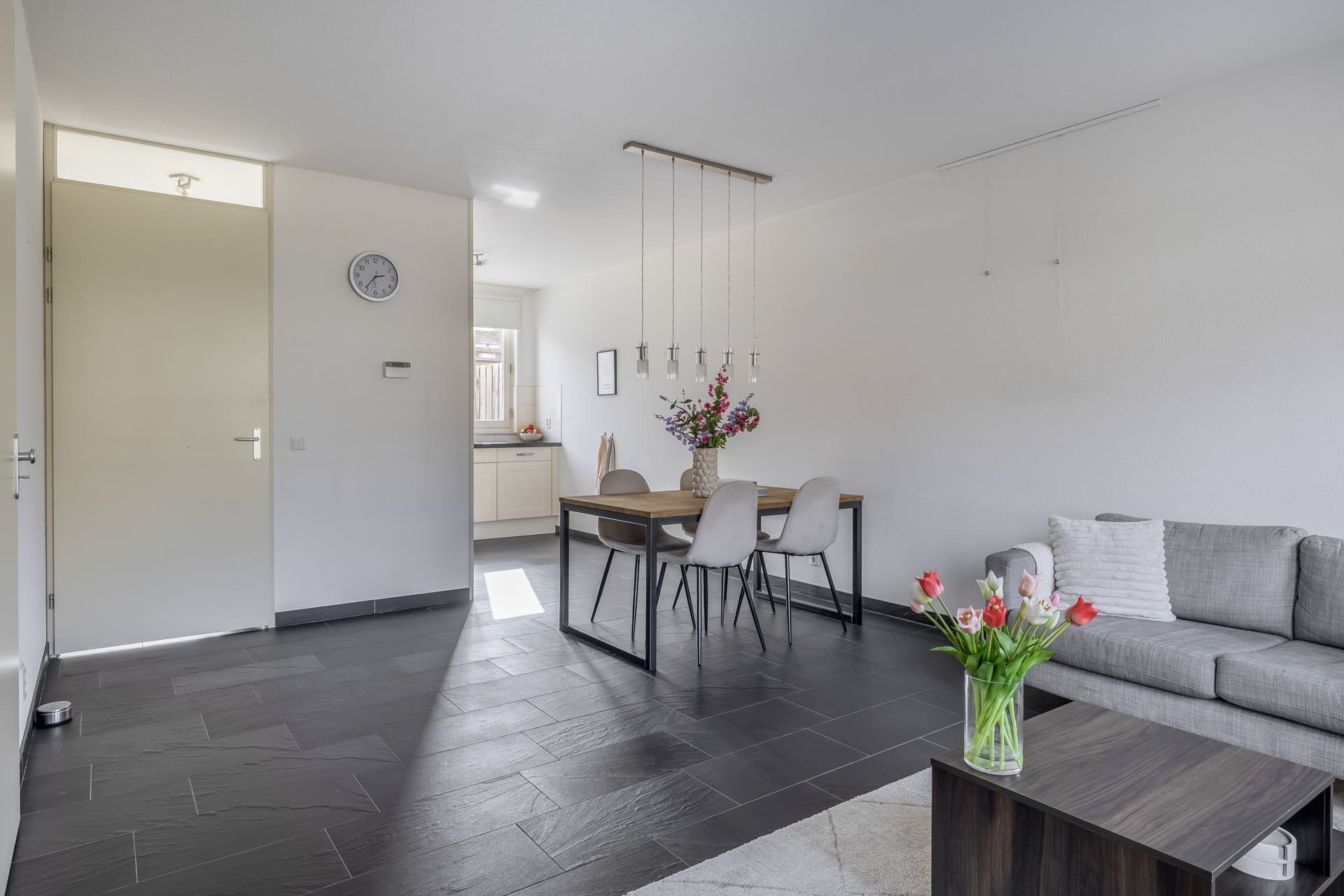 Vanwege de situering aan het water, waar zich de officiële voordeur bevindt en directe toegang tot de woonkamer is, bevindt de praktische entree zich aan de achterzijde van de woning. Hier kom je binnen in de hal met toegang tot het toilet, de meterkast en de trapopgang. Vanuit hier stap je de lichte woonkamer binnen, waar het uitzicht op het water direct in het oog springt. Een fijne leefruimte met een prettige lichtinval en een open, uitnodigende sfeer. De open keuken aan de achterzijde is praktisch ingericht en sluit naadloos aan op de woonkamer, ideaal voor dagelijks gebruik en gezellige momenten met familie en vrienden. De begane grond is daarnaast voorzien van comfortabele vloerverwarming, wat zorgt voor extra wooncomfort.