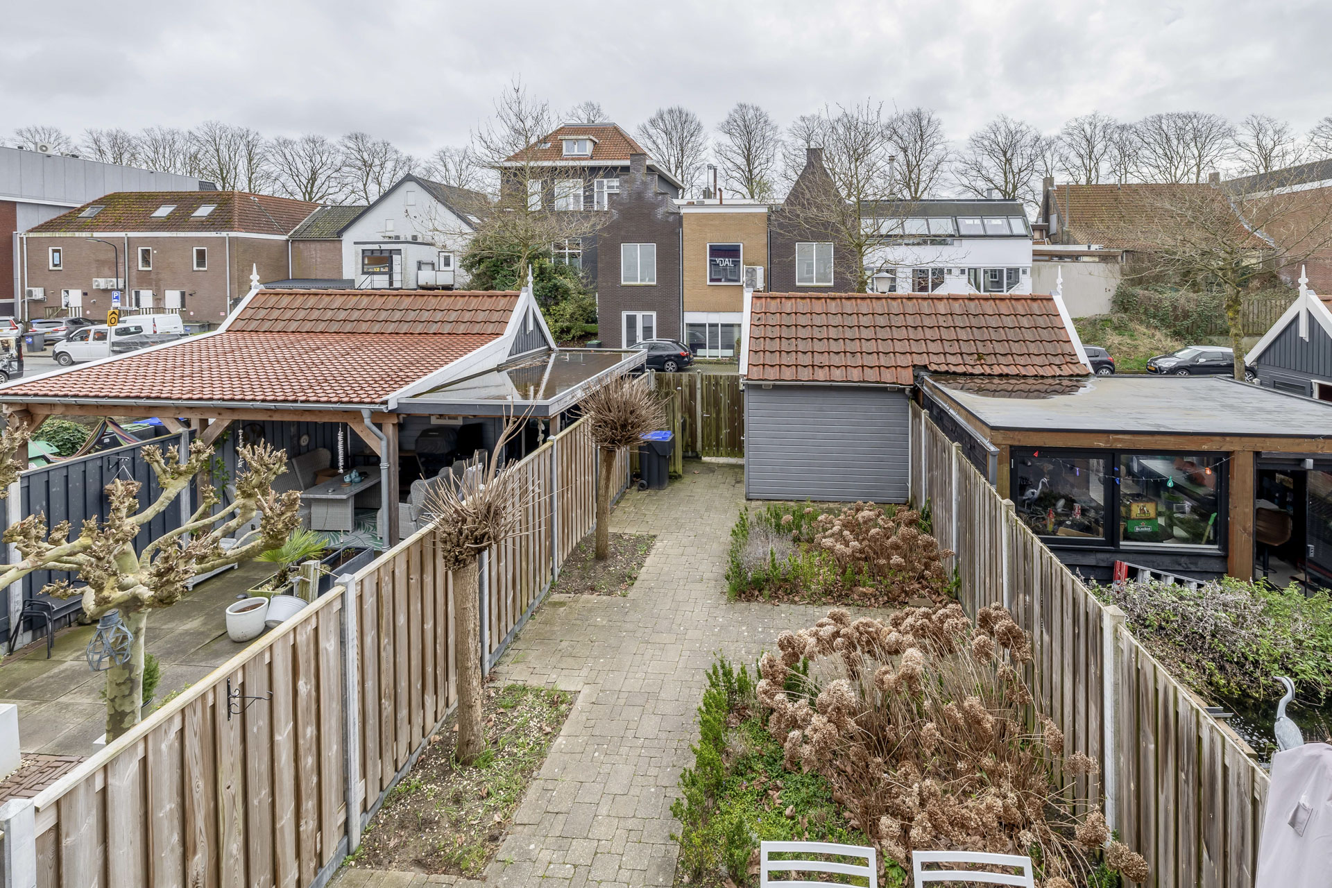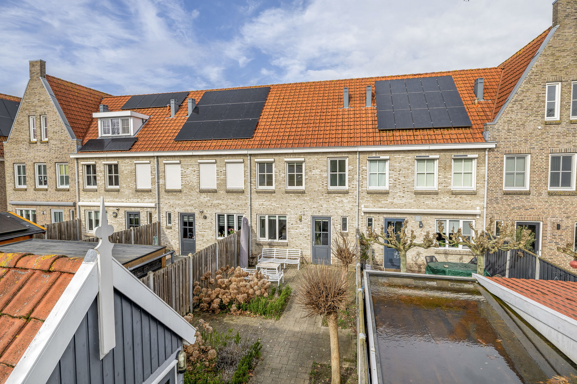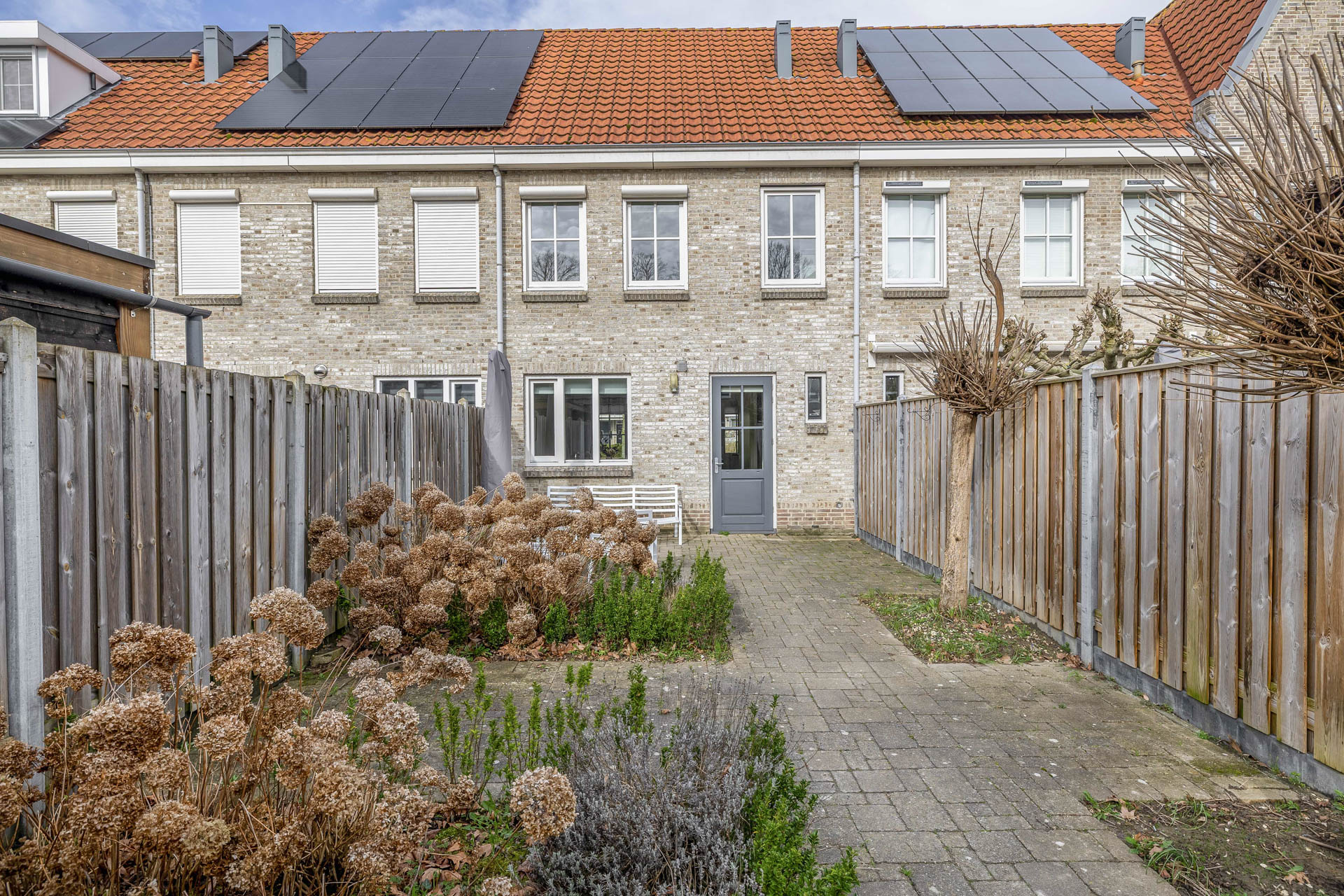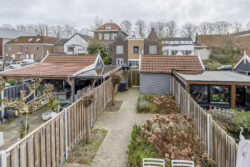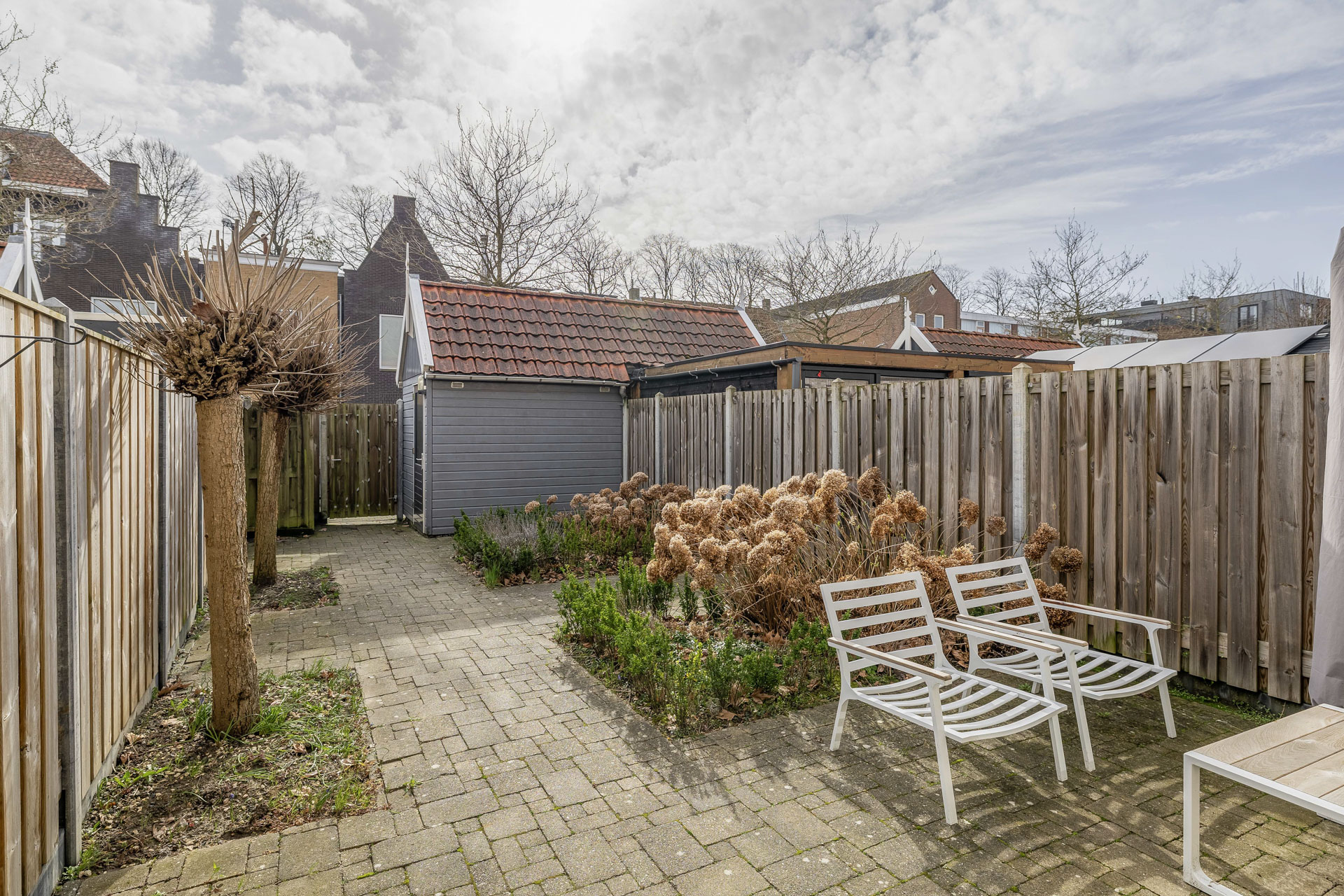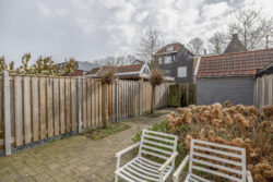 De zonnige achtertuin is gelegen op het zuiden en vormt een heerlijke verlenging van de woning. Hier geniet je optimaal van lange, lichte dagen. Een fijne plek om te ontspannen, te borrelen of buiten te dineren. Achterin bevindt zich een vrijstaande houten berging, ideaal voor het stallen van fietsen en het opbergen van tuinspullen. Daarnaast beschikt de tuin over een praktische achterom.