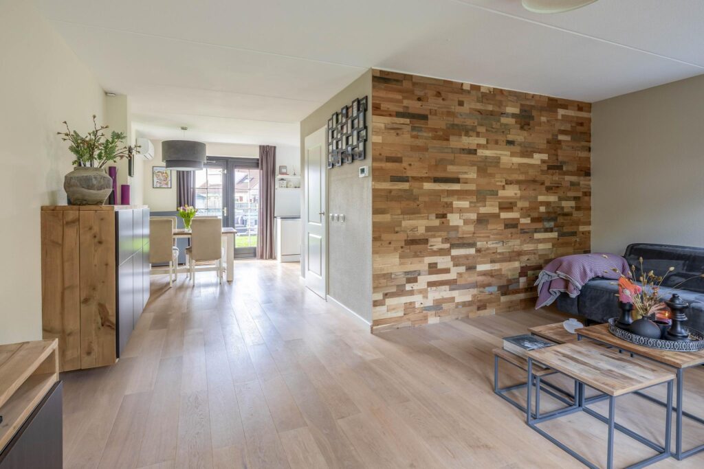 De entreehal, met meterkast en toilet, geeft toegang tot de woonkamer en open keuken, welke zijn voorzien van airconditioning. De L-vormige woonkamer heeft zowel aan de voor- als de achterzijde openslaande deuren. Aan de achterzijde is de open keuken gelegen. De keuken is voorzien van diverse apparatuur, zoals kookplaat, afzuigkap, oven en vaatwasser. Via de keuken is de bijkeuken bereikbaar, waar de CV-ketel is geplaatst en de witgoedaansluitingen te vinden zijn. Ook is er vanuit de bijkeuken toegang naar de achtertuin.