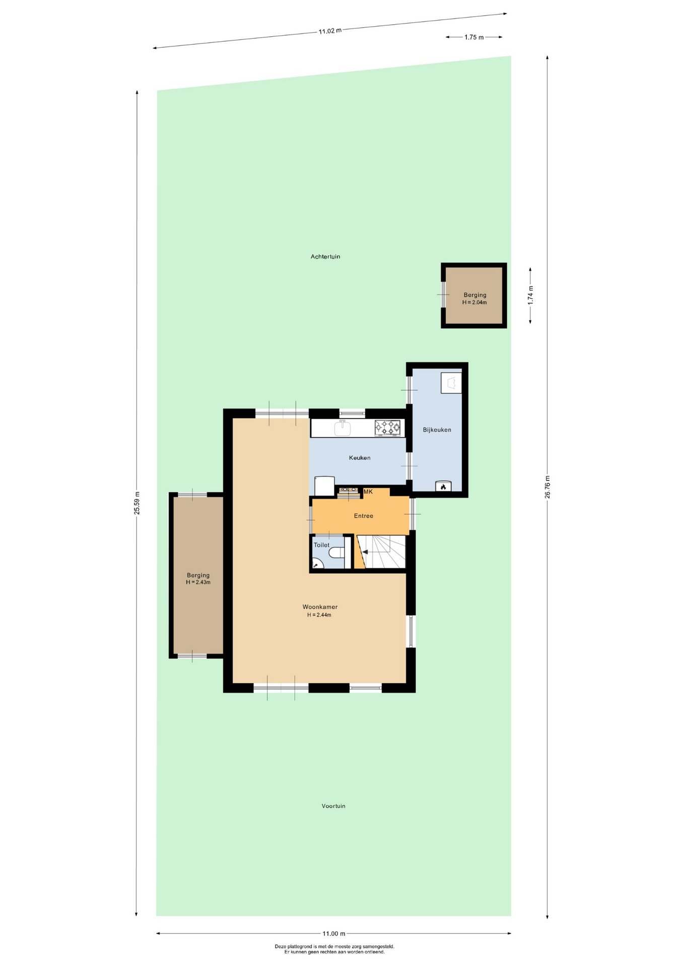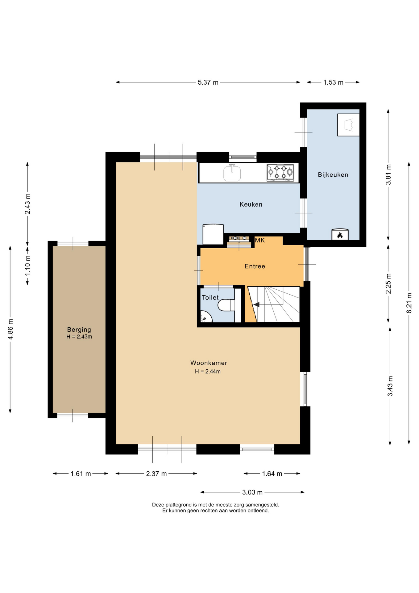 De entreehal, met meterkast en toilet, geeft toegang tot de woonkamer en open keuken, welke zijn voorzien van airconditioning. De L-vormige woonkamer heeft zowel aan de voor- als de achterzijde openslaande deuren. Aan de achterzijde is de open keuken gelegen. De keuken is voorzien van diverse apparatuur, zoals kookplaat, afzuigkap, oven en vaatwasser. Via de keuken is de bijkeuken bereikbaar, waar de CV-ketel is geplaatst en de witgoedaansluitingen te vinden zijn. Ook is er vanuit de bijkeuken toegang naar de achtertuin.