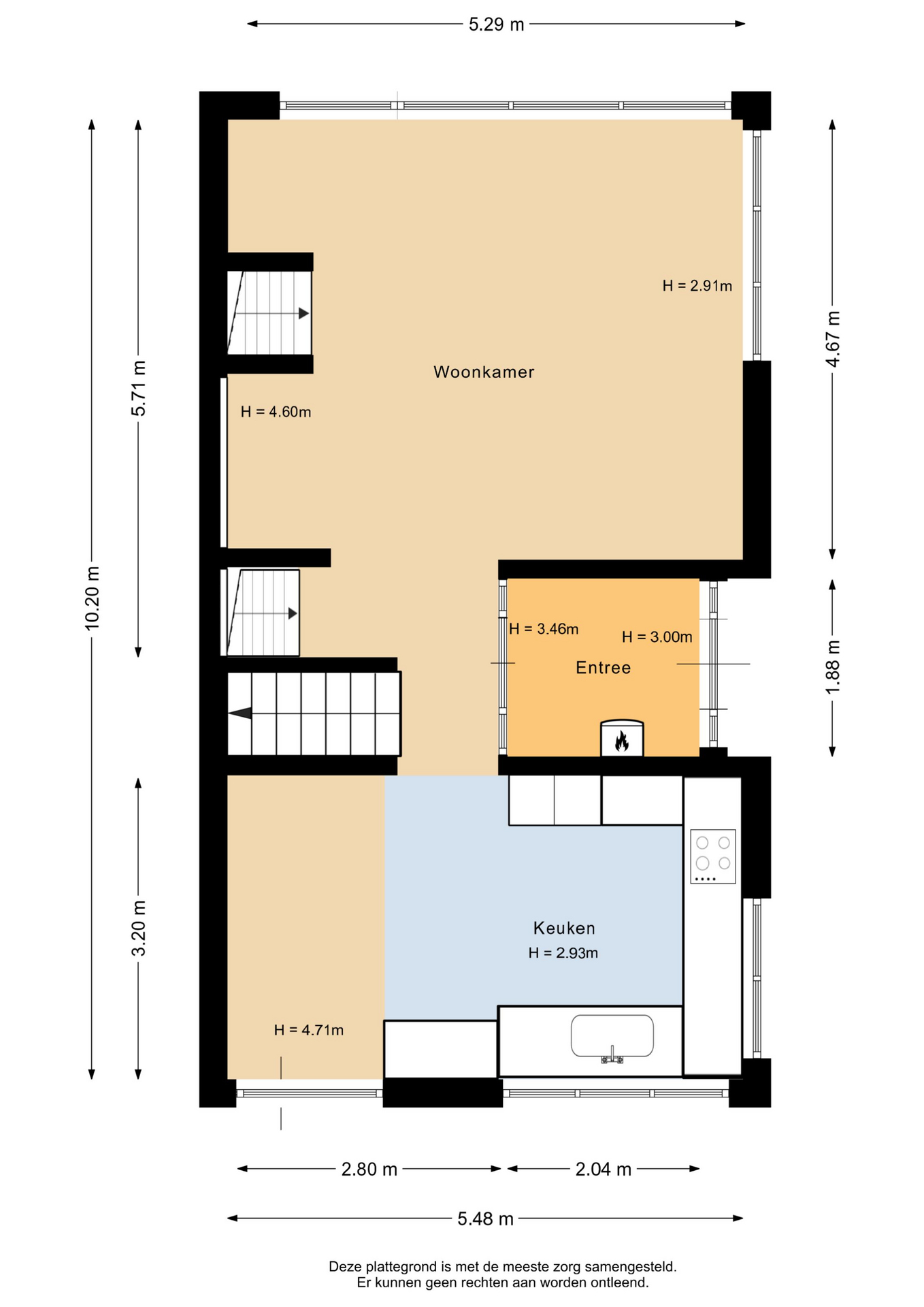 Bij binnenkomst middels de entreehal valt de speelse indeling door de split-level bouw direct op. De entreehal geeft toegang tot de woonkamer en de open keuken. De woonkamer beschikt over royale raampartijen welke een zee van licht toelaten en deze ruimte loopt door naar de lager gelegen verdieping, het souterrain. De open keuken is voorzien van diverse apparatuur zoals kookplaat, afzuigkap, oven, koel-vriescombinatie en vaatwasser. Vanuit de keuken is er toegang tot de tuin.