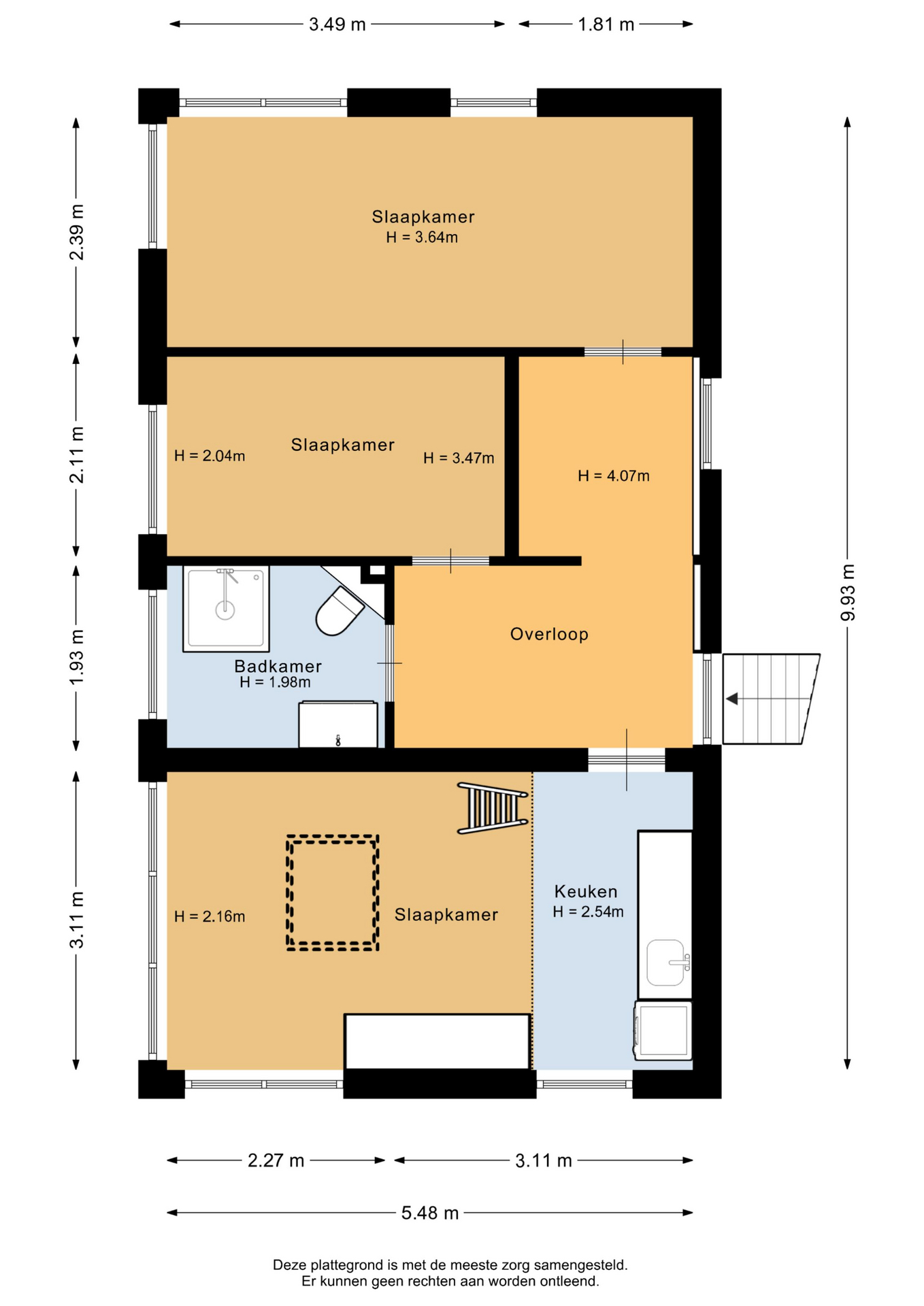 De eerste verdieping beschikt over drie slaapkamers. Twee slaapkamers zijn voorzien van een vide, welke momenteel worden gebruikt als vliering/opbergruimte. De badkamer is volledig betegeld en voorzien van douche, wastafelmeubel en toilet. De slaapkamer aan de voorzijde beschikt, naast de vliering, over een keukenblok en hier zijn ook de witgoedaansluitingen te vinden.