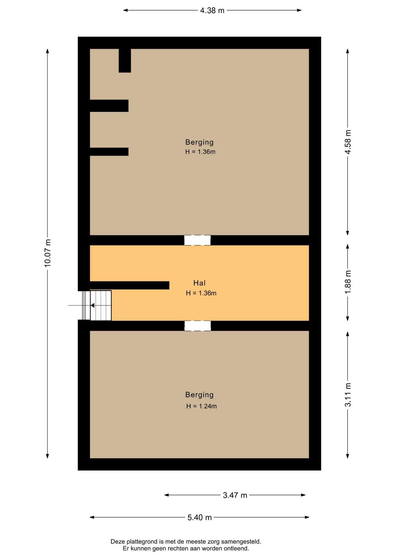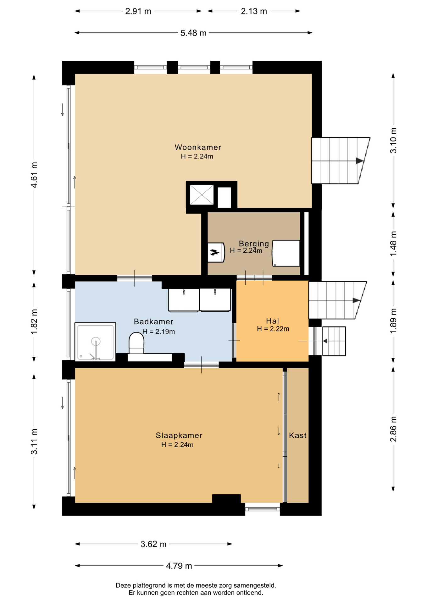 Vanuit de woonkamer op de begane grond kunt u naar het lager gelegen souterrain, waar de woonkamer ook door loopt. Op deze woonlaag is tevens een berging te vinden, waar de CV-ketel is geplaatst. Grenzend aan de woonkamer is de badkamer, compleet met douche, toilet en dubbele wastafel. Vanuit de badkamer is er toegang naar de slaapkamer. Deze slaapkamer beschikt over een inbouwkast en een schuifpui waarmee u toegang heeft tot de tuin.